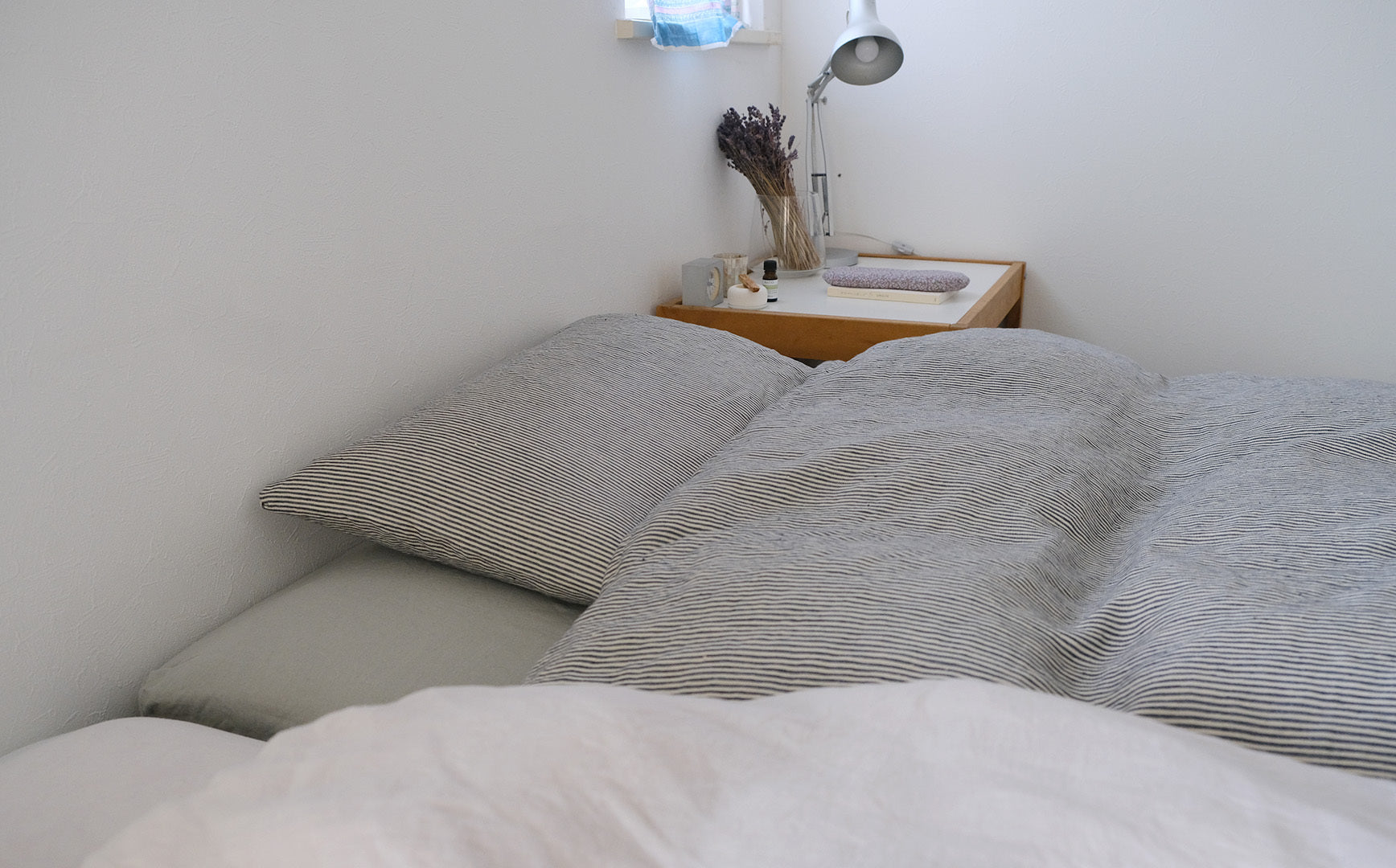和室とも相性がよい、LIBECOのベッドリネン。和の空間だからこそつくれる雰囲気。洗いざらしのベッドリネンが自然光を受けて、波打つような美しいしわを描いていました。