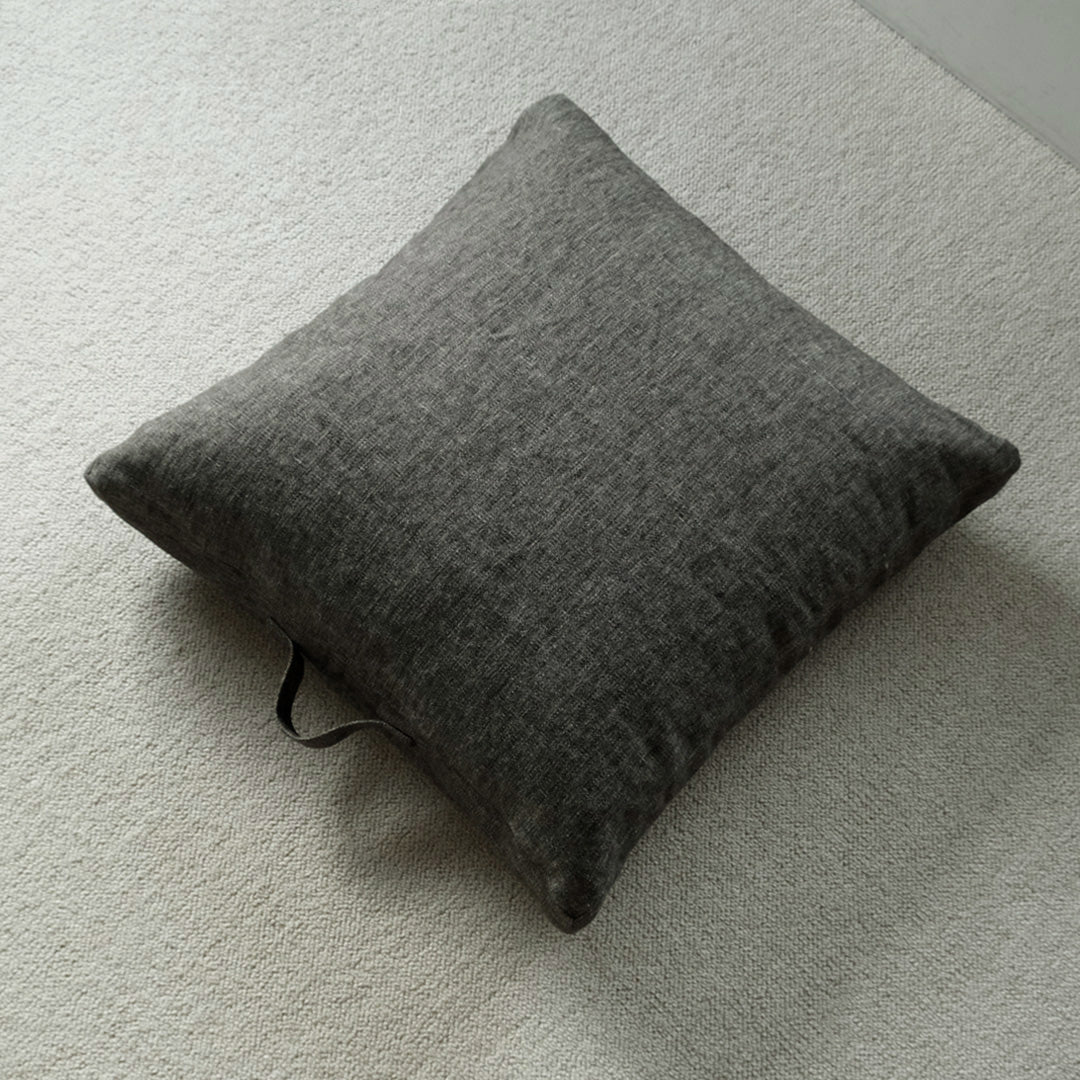 LIBECOのリネンでカバーを仕立てたフロアクッション。ざっくりとした極厚地のフラックスとダークブラウンのリネンシャンブレーでつくりました。