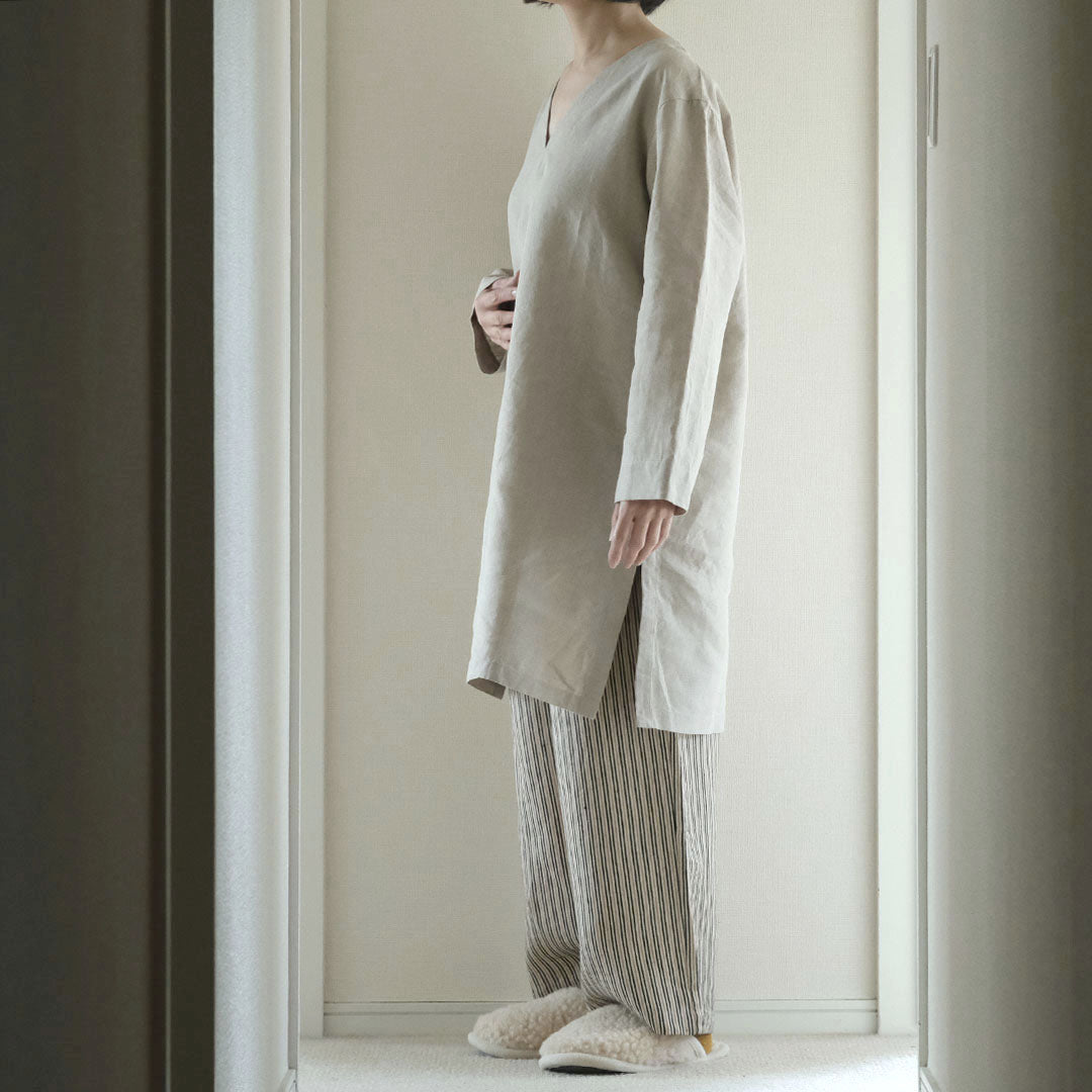 膝上丈のロングシャツなので、リネンのリラックスパンツやレギンスを合わせての着用をおすすめします。たとえば、リネンスリープパンツサン ガブリエルやウールのパンツと合わせてもぴったり。冬時季はニットパンツとも心地よく過ごせそうです。
