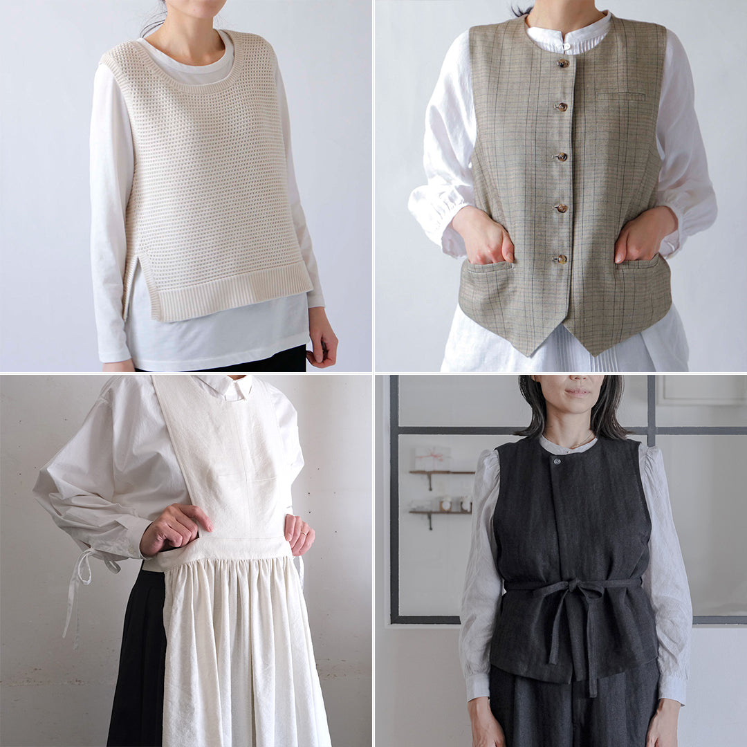 修道士がエプロンとして着用していた肩衣のイメージを加えてつくられたロングベスト。同色のワンピースやブラウスとの組み合わせもおすすめです。
