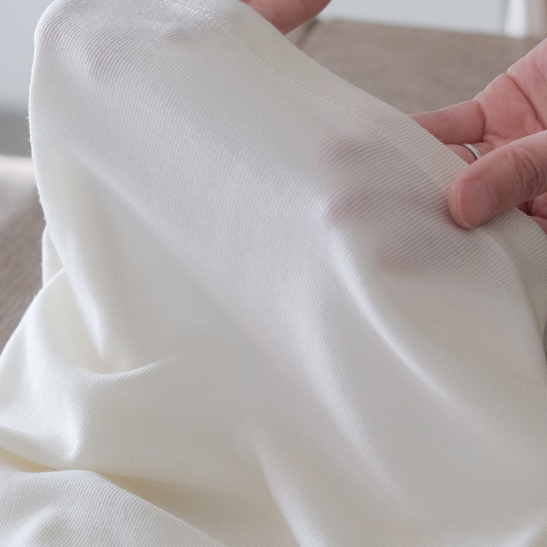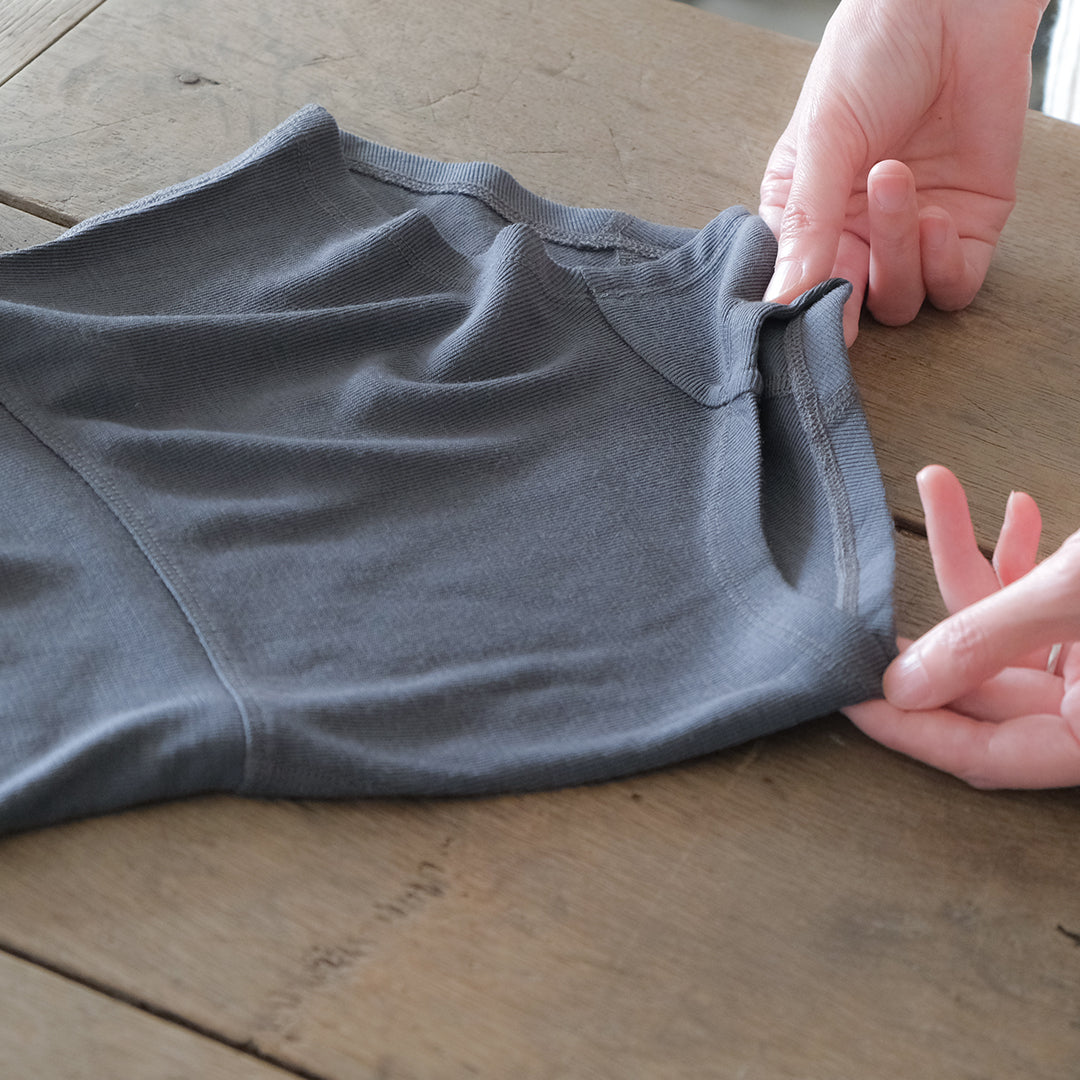 ルルシリーズの生地は厚手のリブ編み。伸縮性に優れているのでお腹まわりや鼠径部にも締め付け感がなく、身体の動きに応じてきれいにフィットします。