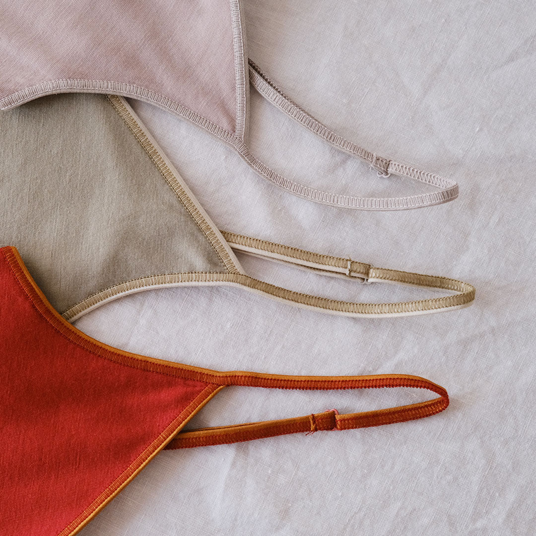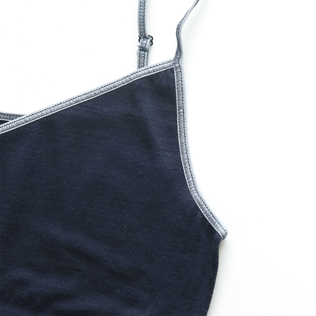 ディティールにこだわった細身の肩ストラップは調節が可能。 脇部分の縫い目がフラットでゴロツキ感が出ないようなっていたり、ゴムが直接肌に触れない「くるみ仕様」なところも着心地のよさにつながっています。