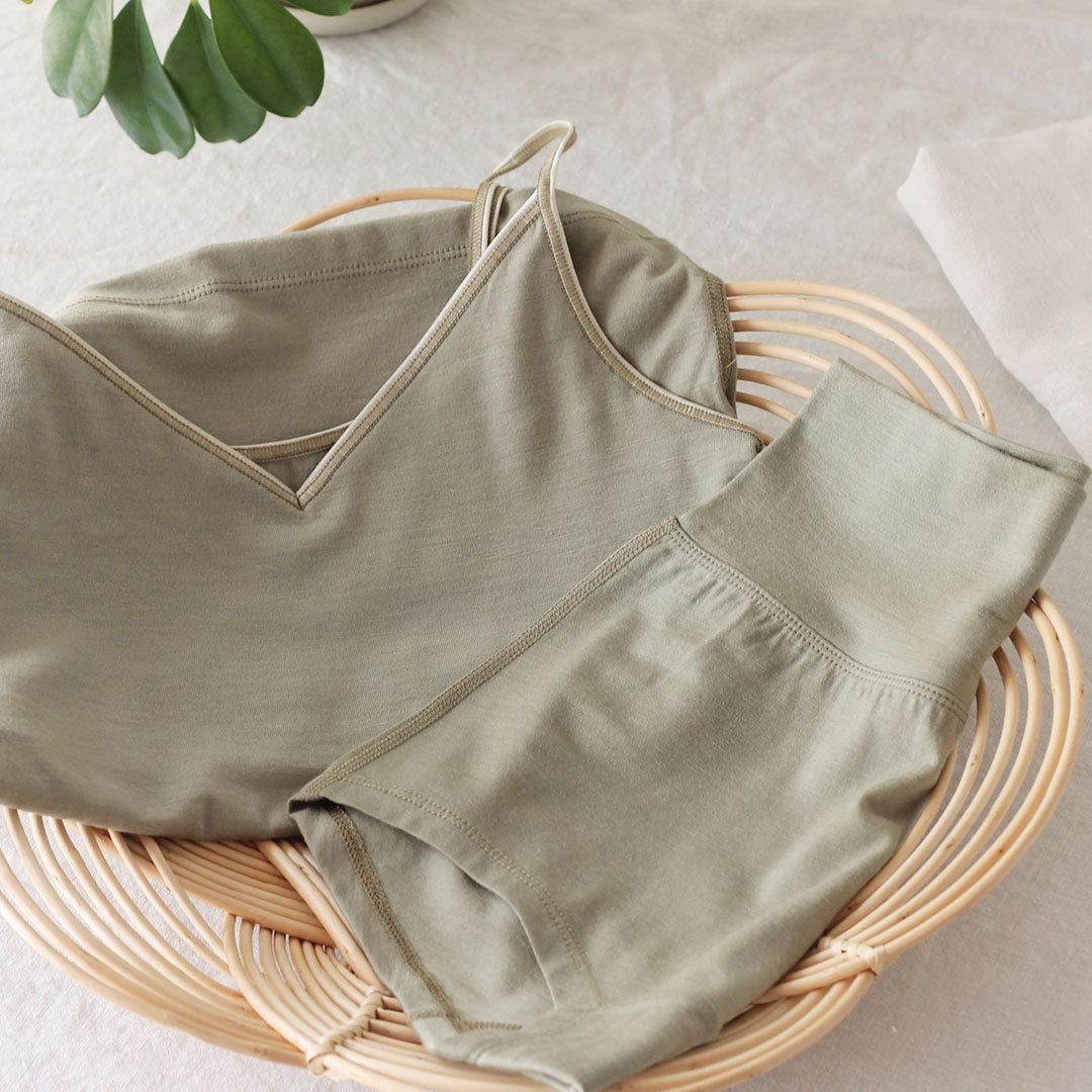 ファンテイルシリーズには、他に同じ色味のショーツ、ブラックとホワイトのブラキャミソールとショーツ、とショートスリーブがあります。セットで着用すれば、一年を通して心地よく過ごせます。 ▲モスのセットアップで