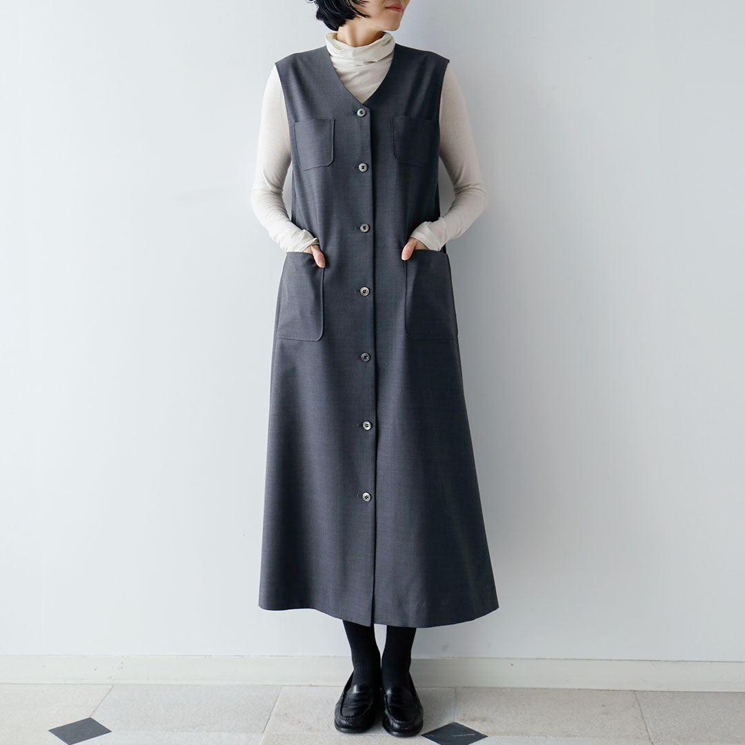 サマーウールで仕立てたワンピースとジャンパースカートが登場しました。ロングジレとして着られるワンピース「ケイシー」と、Vネック開きとAラインのバランスが大人っぽいジャンパースカート「ヴァレリー」の2型。 端正なサマーウールの表情ですっきりと着られ、着こなしの幅も広がるアイテムです。 ***ケイシー -ロングジレとしても着られるワンピース- ワンピースの着こなしがワンパターンになりがちな方にもおすすめです。ロングジレとしても着られるのでその日の気分で着こなしを楽しめます。ブラウスからカジュアルなニットまで、羽織るだけで洗練された装いに仕上がります。 ***ヴァレリー -Aラインシルエットのジャンパースカート- ゆったりとしたAラインが女性らしいシルエットのジャンパースカート。深めのVネック開きと、メンズライクなサマーウールで、甘くなり過ぎず大人っぽく着られます。ブラウスと合わせたキレイ目な着こなしも◎ *** すっきりとしたデザインと素材感で真夏以外のオールシーズン着まわせます。 様々な着こなしをお楽しみください。