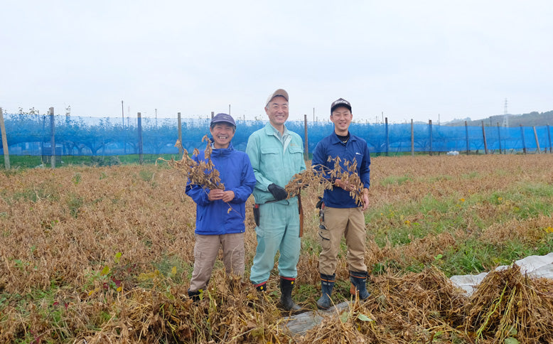 ▲左から、津久井在来大豆を使った商品開発を手掛ける豊国屋 岡本さん、生産者の塩脇さん、池田さん