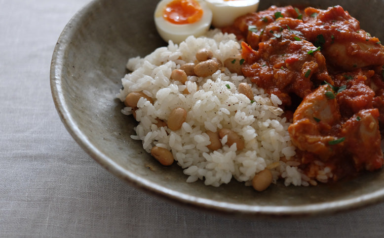 お米1合に塩小さじ1/2を加え、昆布10cmをのせたら、いつもと同じ水分量(200cc)で炊飯。炊き上がったら、「津久井在来大豆 蒸かし豆」を1/2缶加えて、よくほぐす。10分程度蒸らしたら、できあがり。