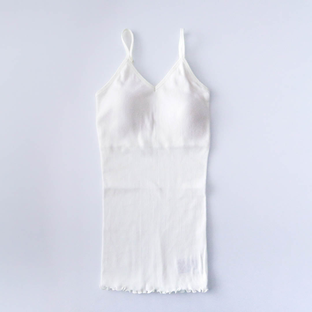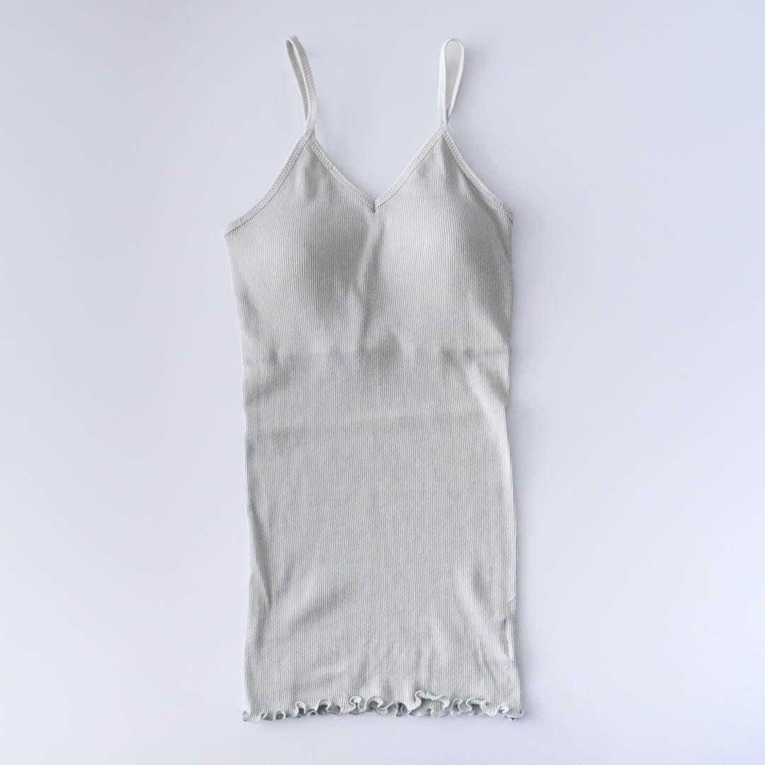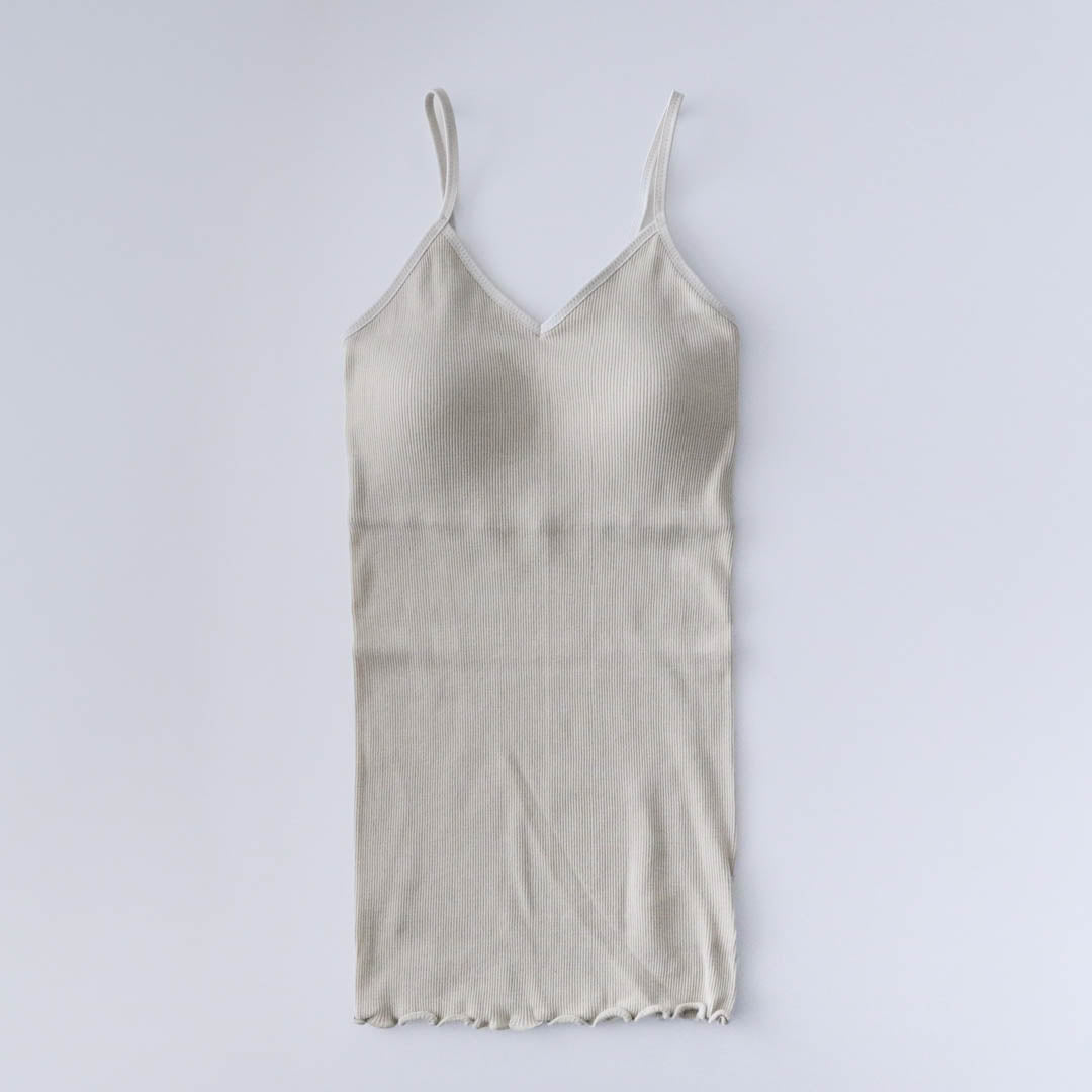 パット付きキャミソールの身頃はフィット感重視のコンパクトなシルエット。裾はくしゅくしゅとしたメロウ仕上げで上品さがあります。