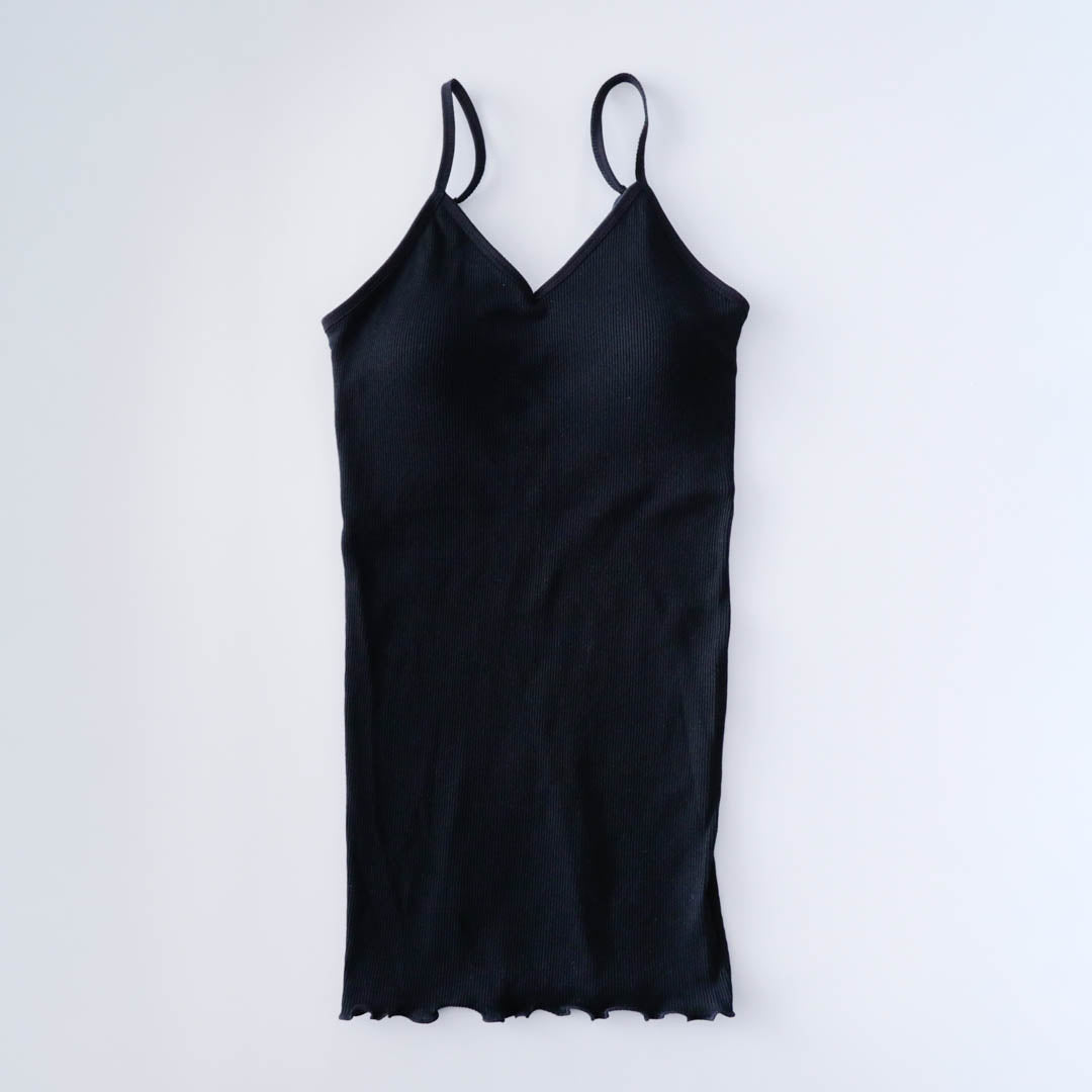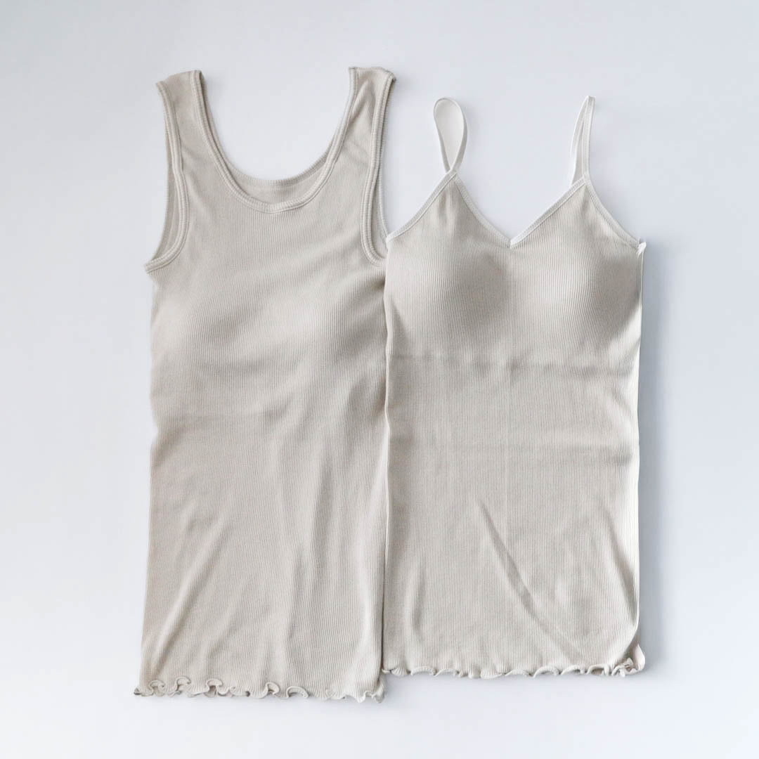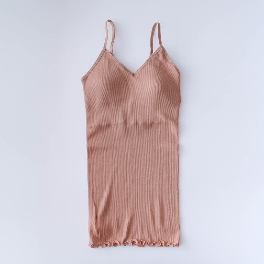 パット付きキャミソールの身頃はフィット感重視のコンパクトなシルエット。裾はくしゅくしゅとしたメロウ仕上げで上品さがあります。