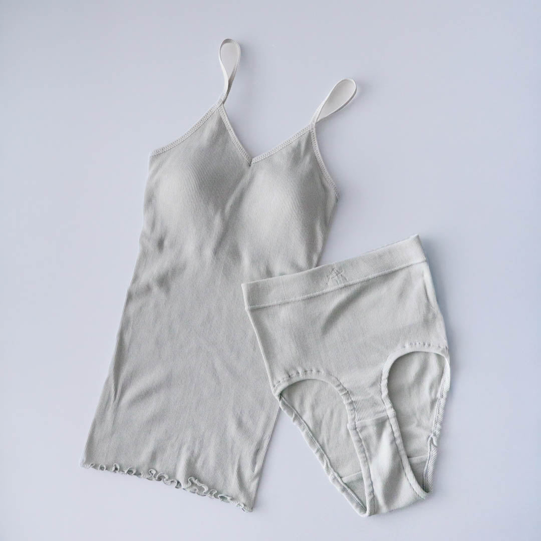 me.のコットンテレコ素材のインナーはデイリーに使える天然素材100%のインナーを探している方に届けたいアイテムです。身に着けるだけで気分が上がり心が満たされる、やさしい肌触りとカラー。ショーツはゴムを使わずに伸縮するウエストがポイント。