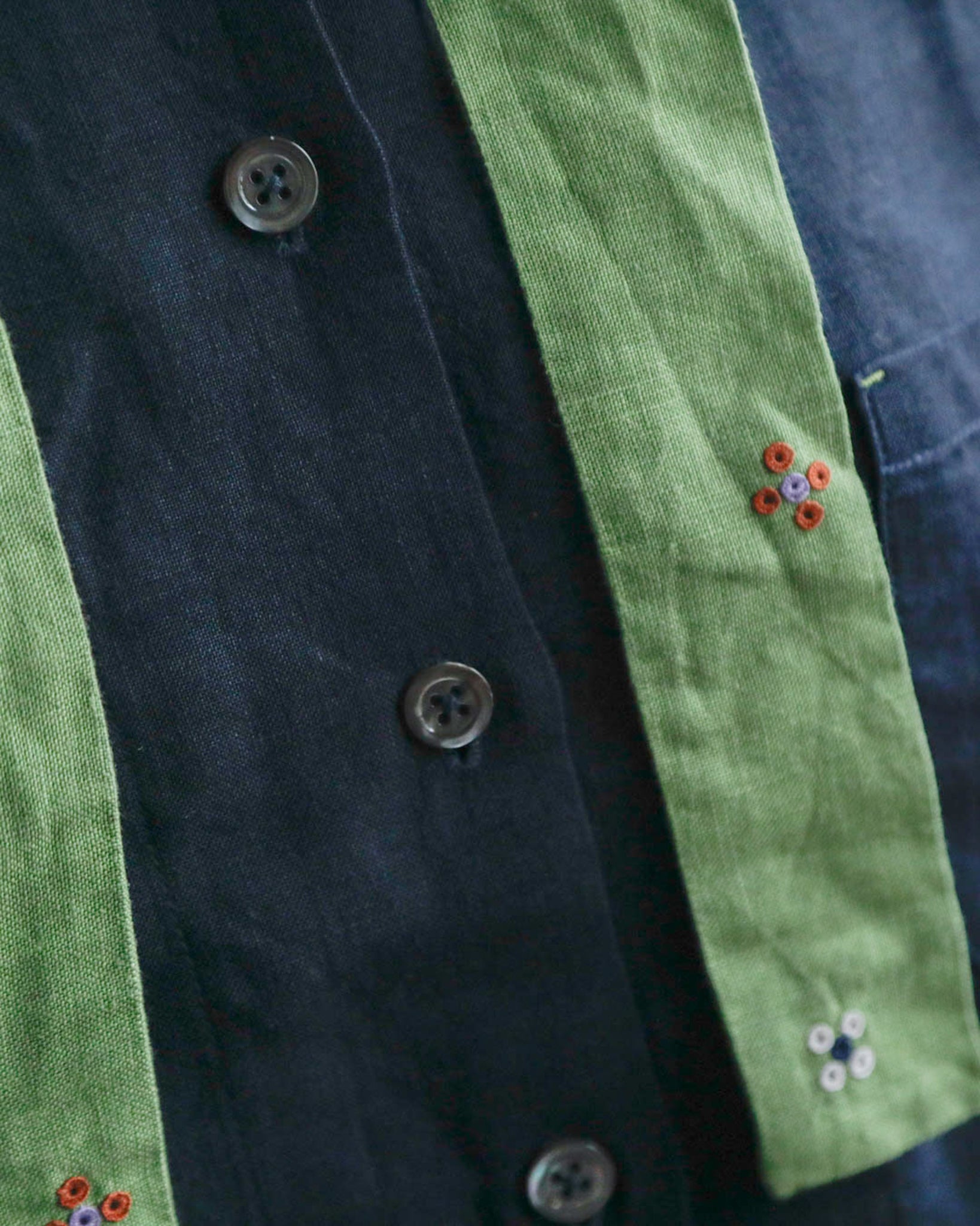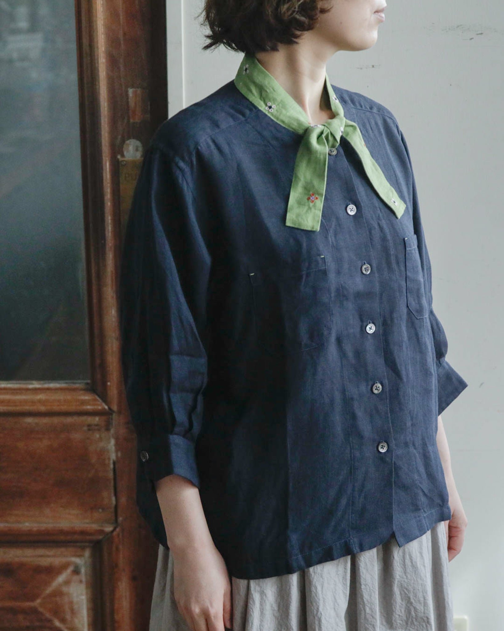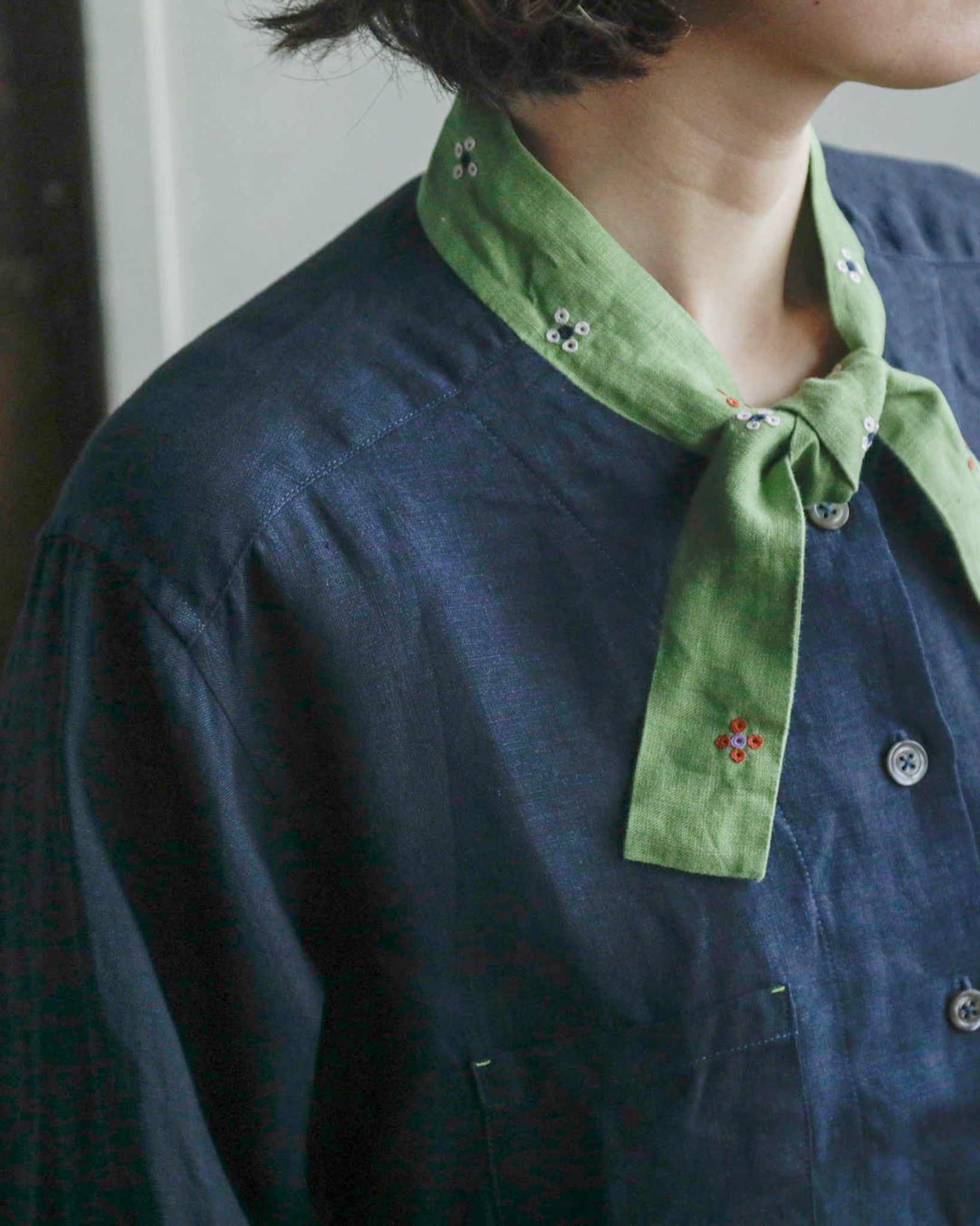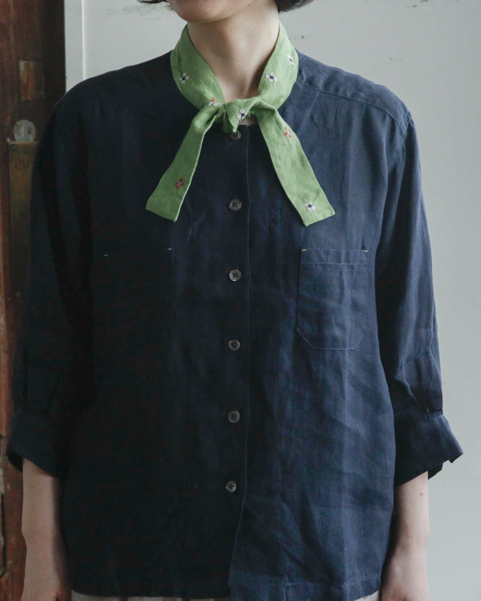 「ブルーマリン×アボカ」は、シックな濃紺のベースにとアボカドのような明るいグリーンのタイカラーの組み合わせ。軽やかでやわらかいリネン生地なので、春や秋だけでなく夏もさらりと涼しく着ることができそうです。グリーンのタイカラーには赤と白の花の刺繍が施されています。