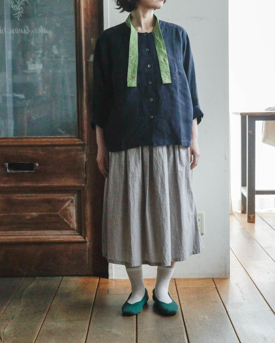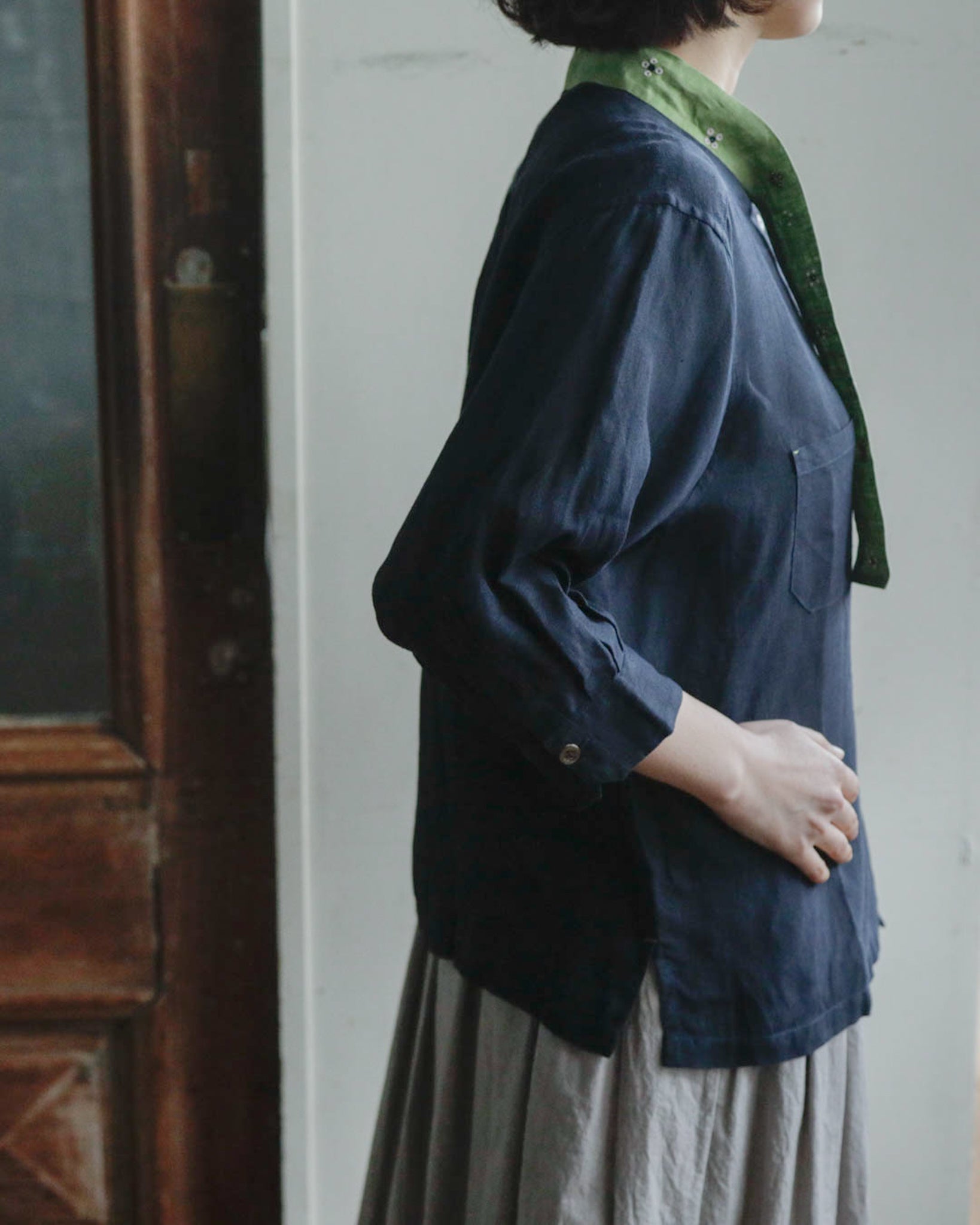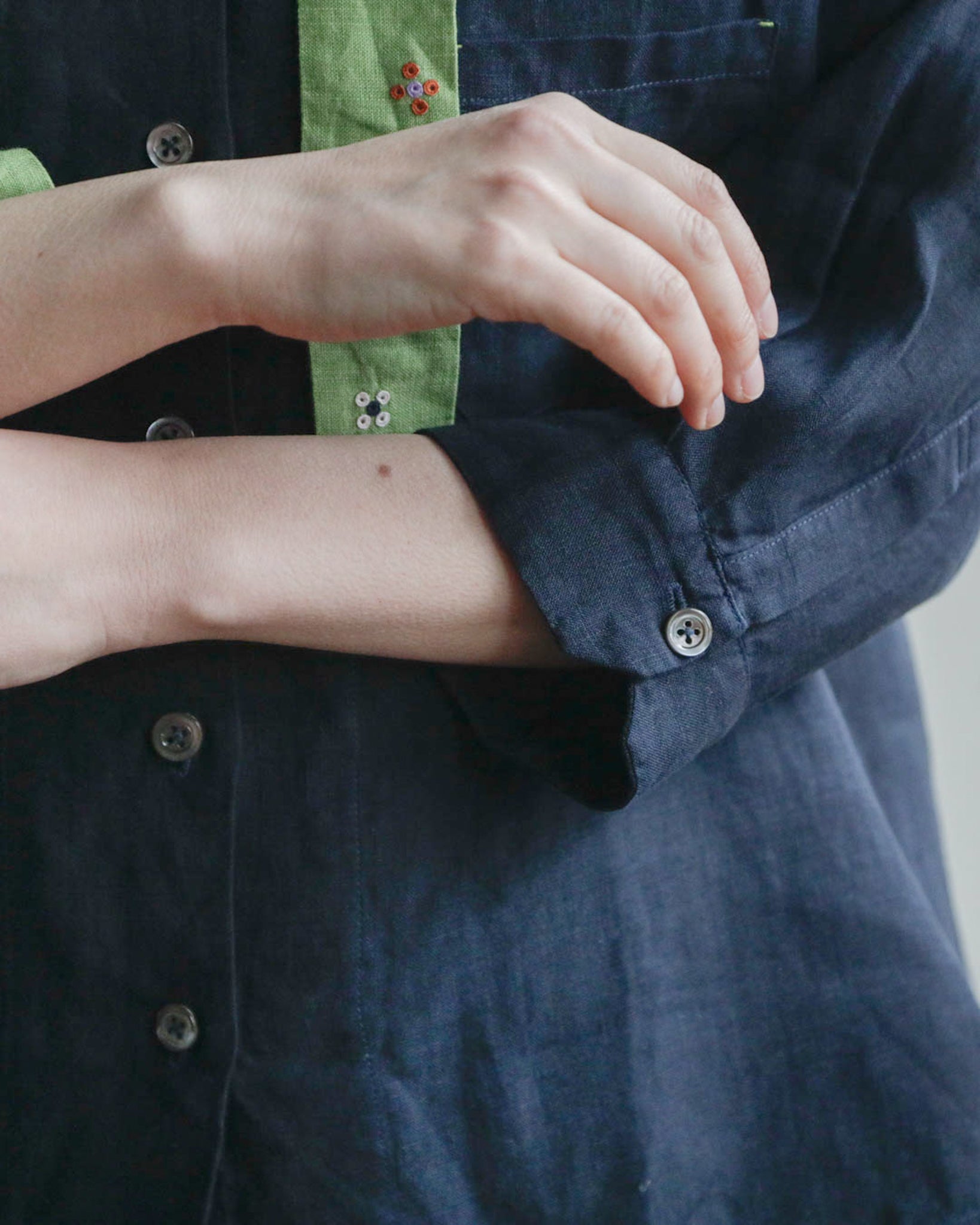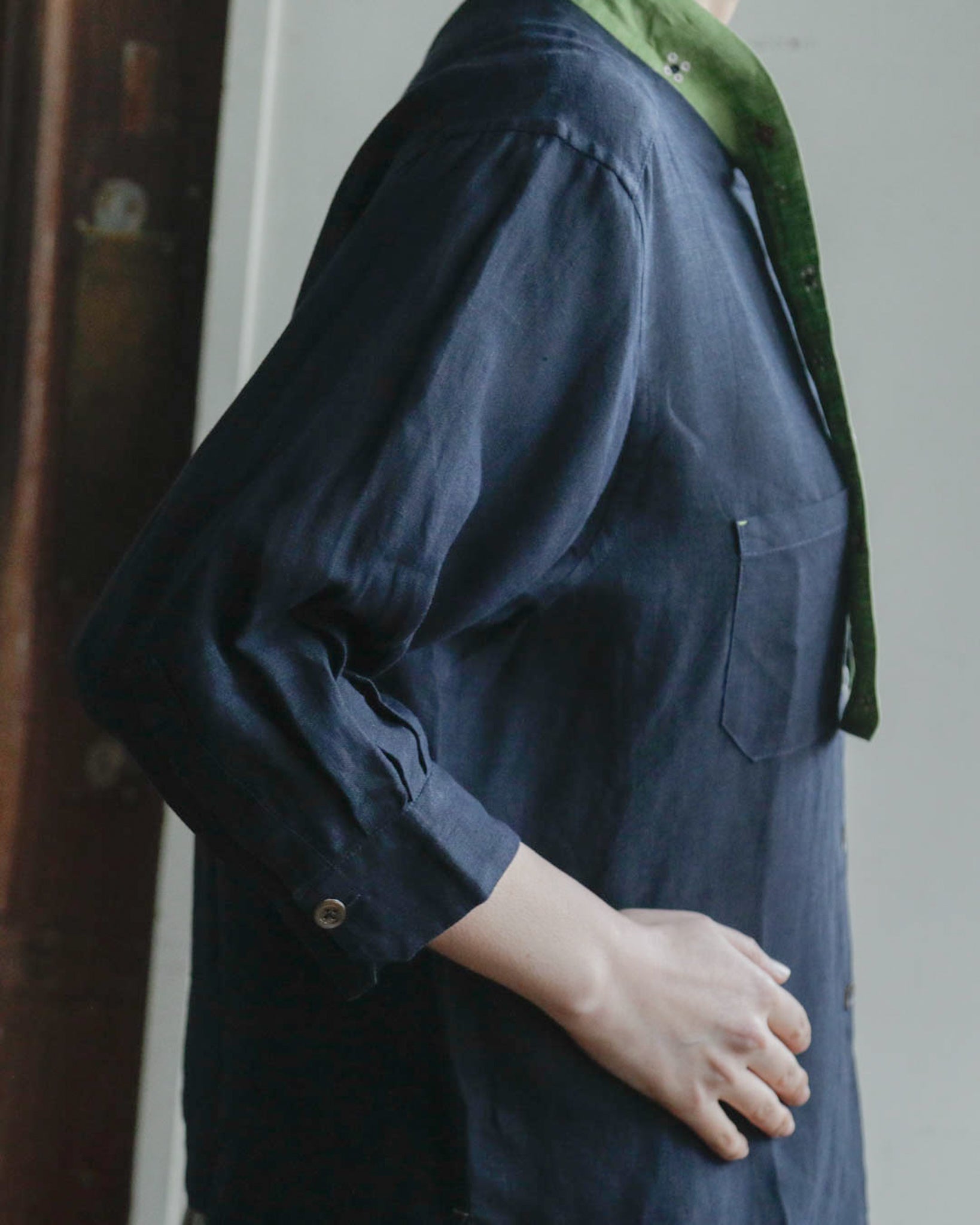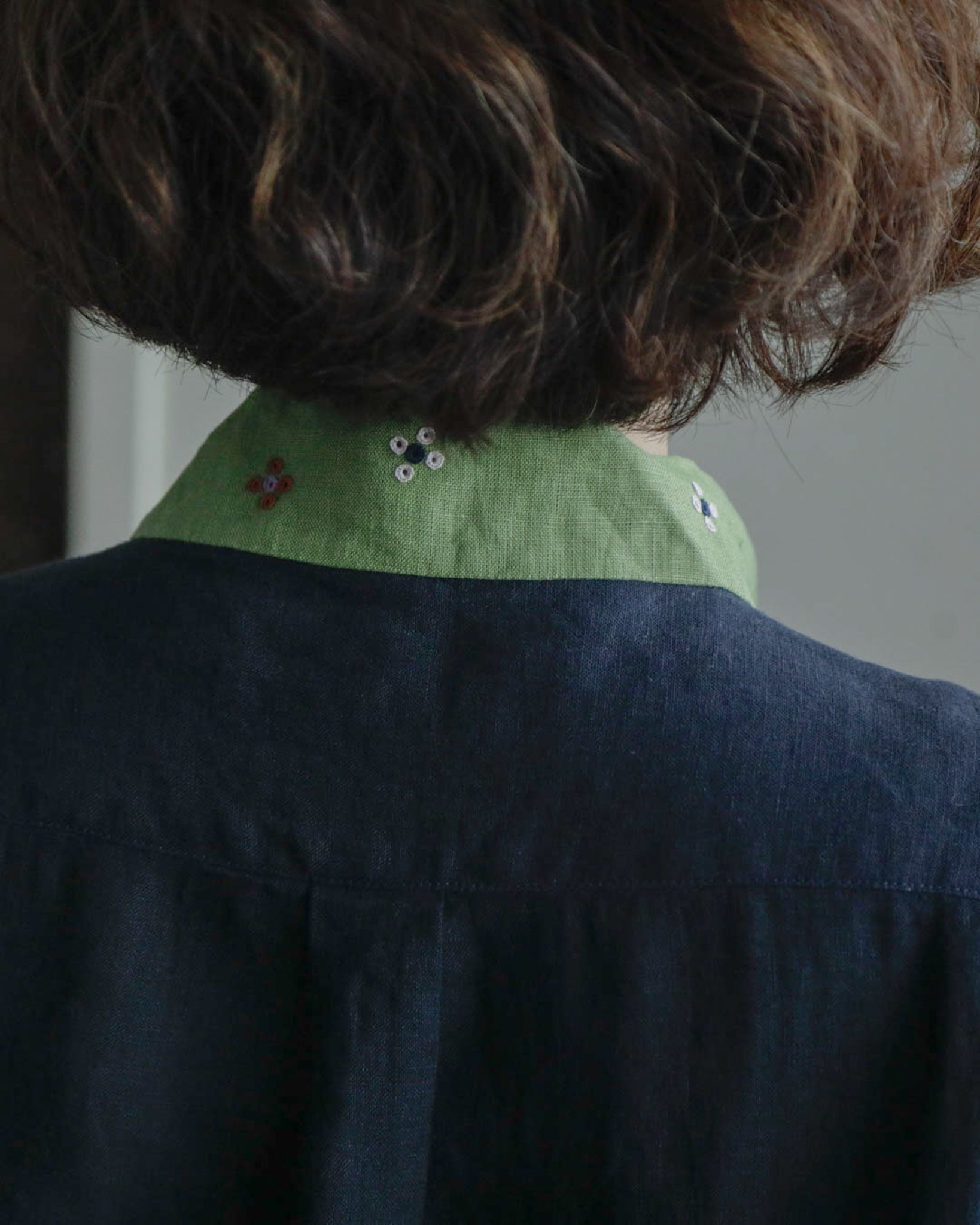 「ブルーマリン×アボカ」は、シックな濃紺のベースにとアボカドのような明るいグリーンのタイカラーの組み合わせ。軽やかでやわらかいリネン生地なので、春や秋だけでなく夏もさらりと涼しく着ることができそうです。グリーンのタイカラーには赤と白の花の刺繍が施されています。