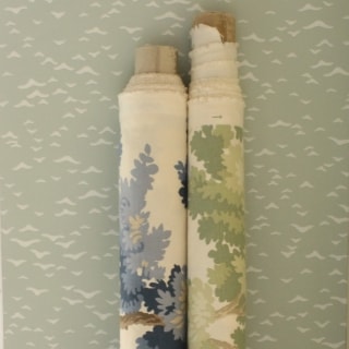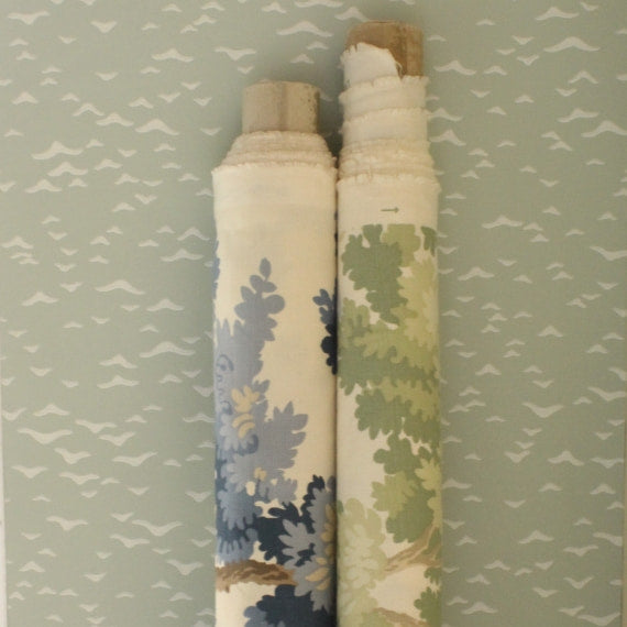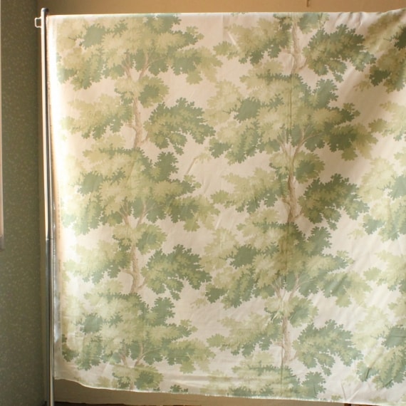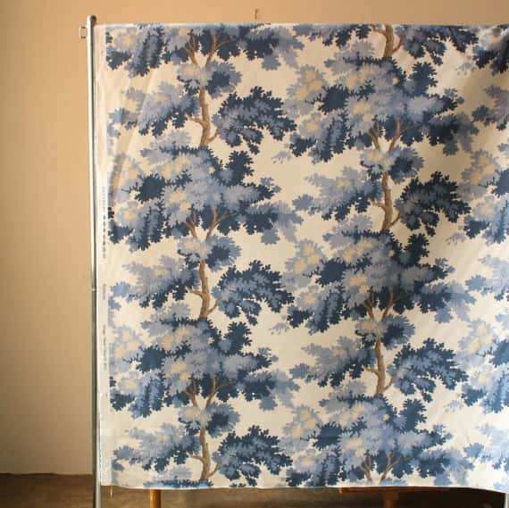 さわやかなブルーやグリーンの濃淡で木立が描かれたプリントは、柄を活かしてカーテンやスクリーンなどのインテリアにぴったり。