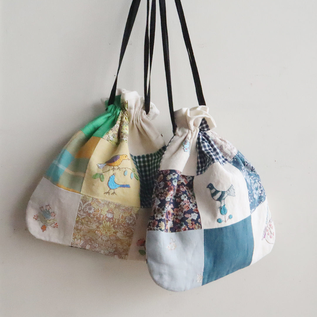 パッチワークでつなぎ合わされた生地にさりげなく施された、あたたかみのある絵柄の刺しゅうはどこかなつかしい雰囲気です。