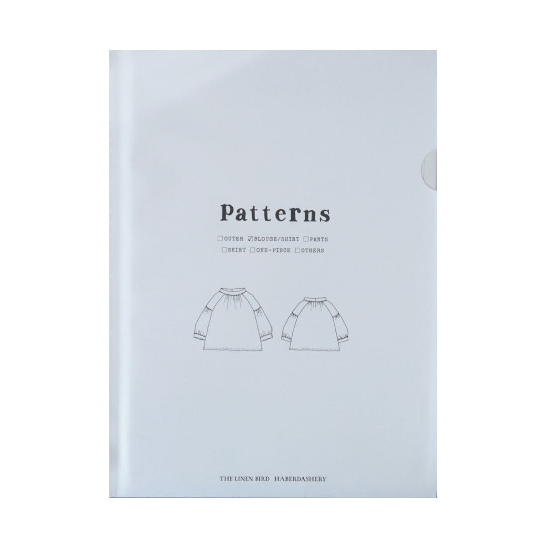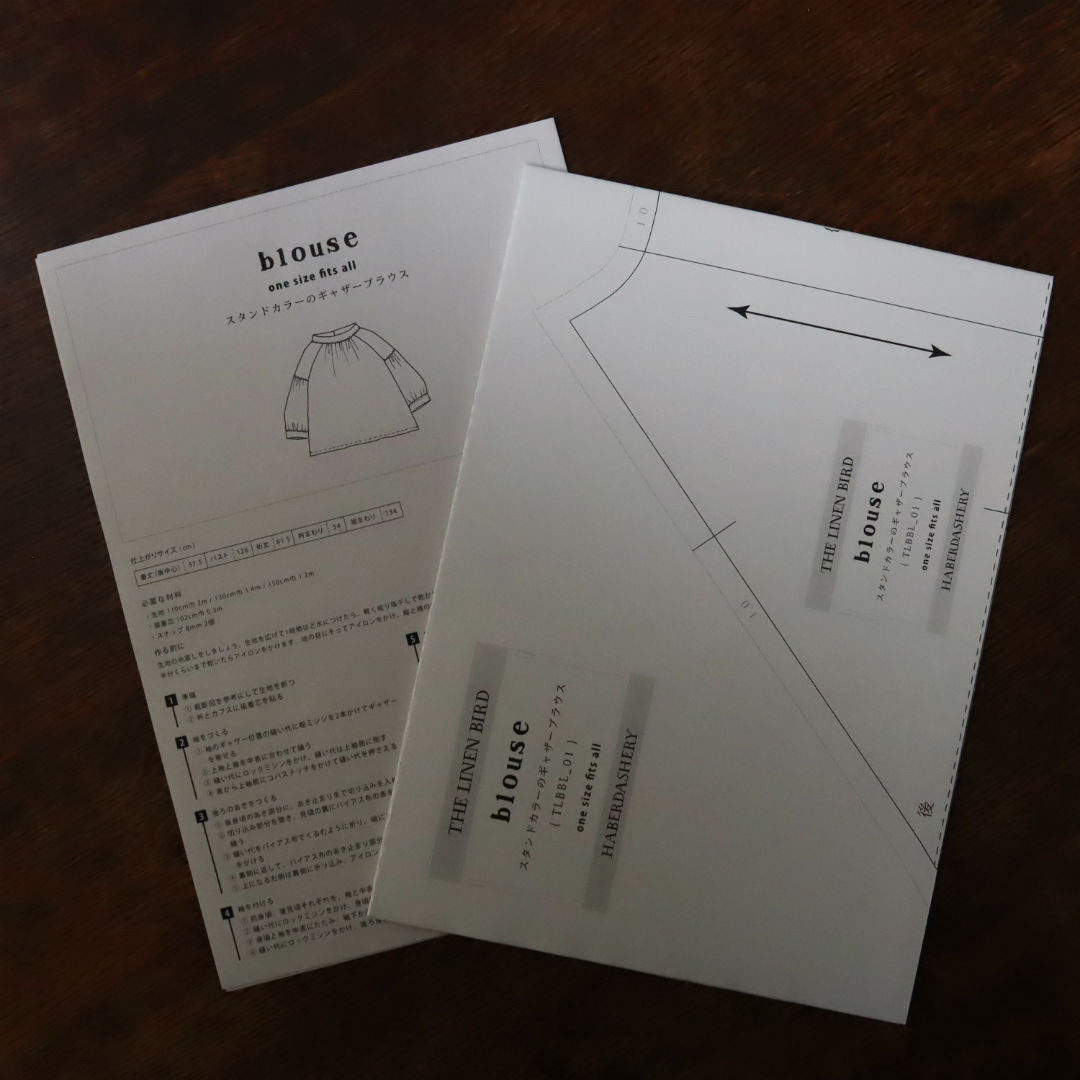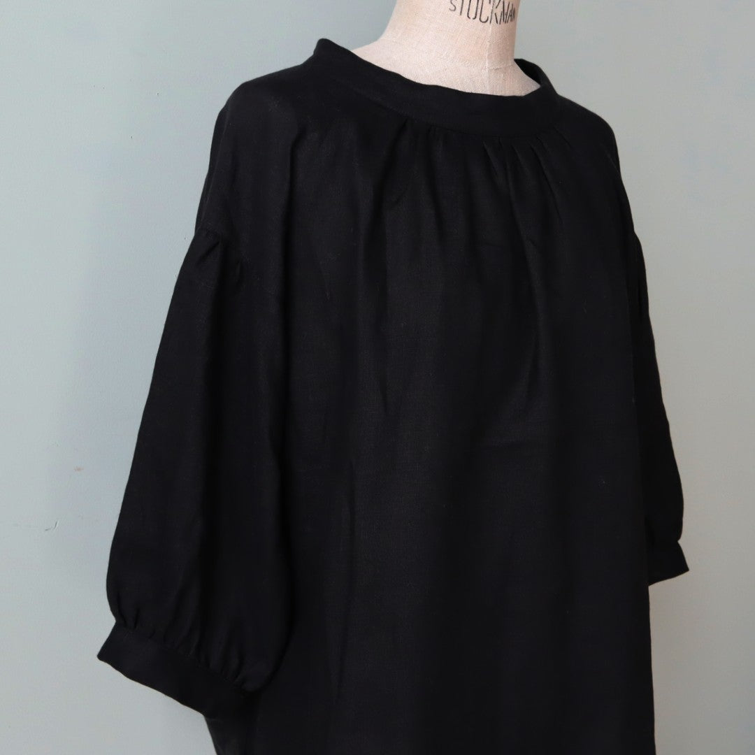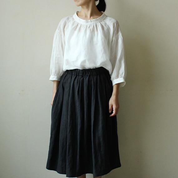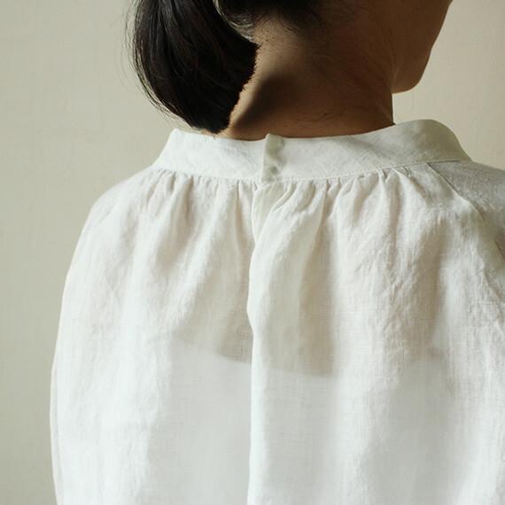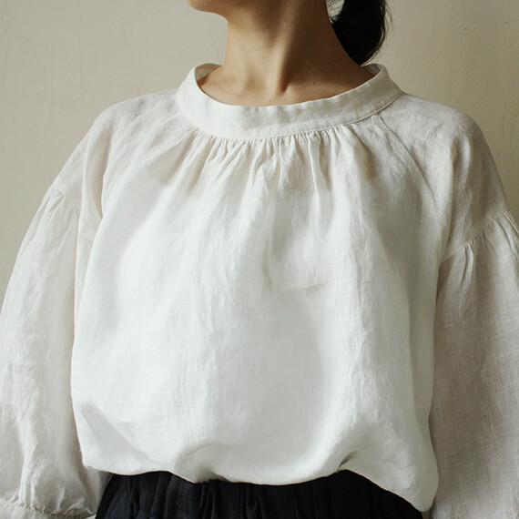 リネンバードオリジナルのパターン、スタンドカラーのギャザーブラウスは、ふんわりとしたシルエットの上品な表情のブラウス。