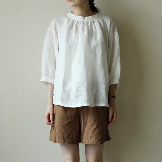 ドロップショルダーの袖と襟元のギャザーが特徴、丁寧に寄せれば、あとはシンプルに仕上がります。薄手の生地で作れば涼しく着られるのもポイント。