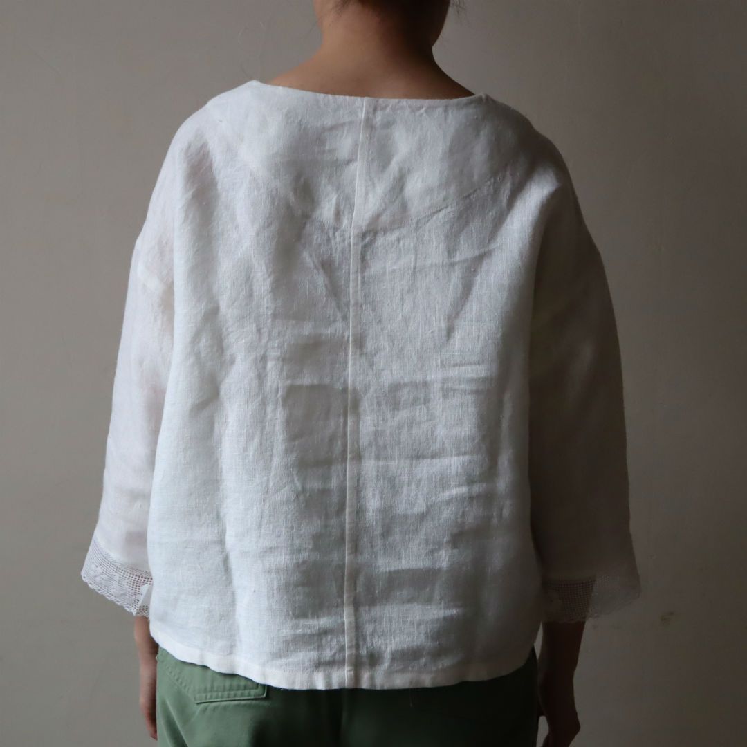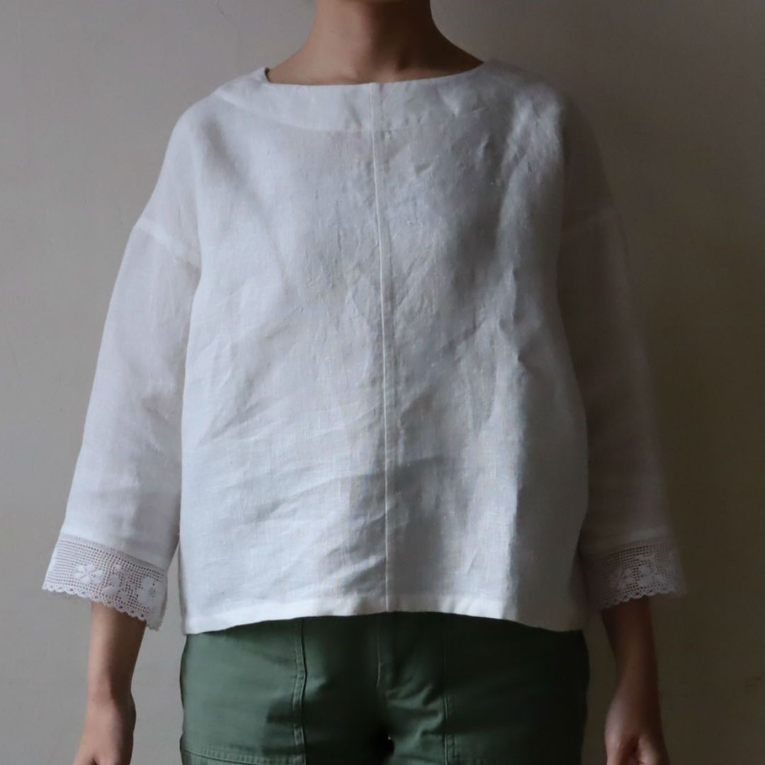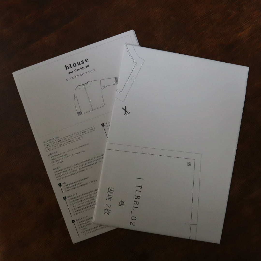 レースカフスのブラウスは、袖口にレースのカフスを付けて仕上げるシンプルなブラウスです。袖下にマチ布が付いた直線的な袖もデザインポイント。