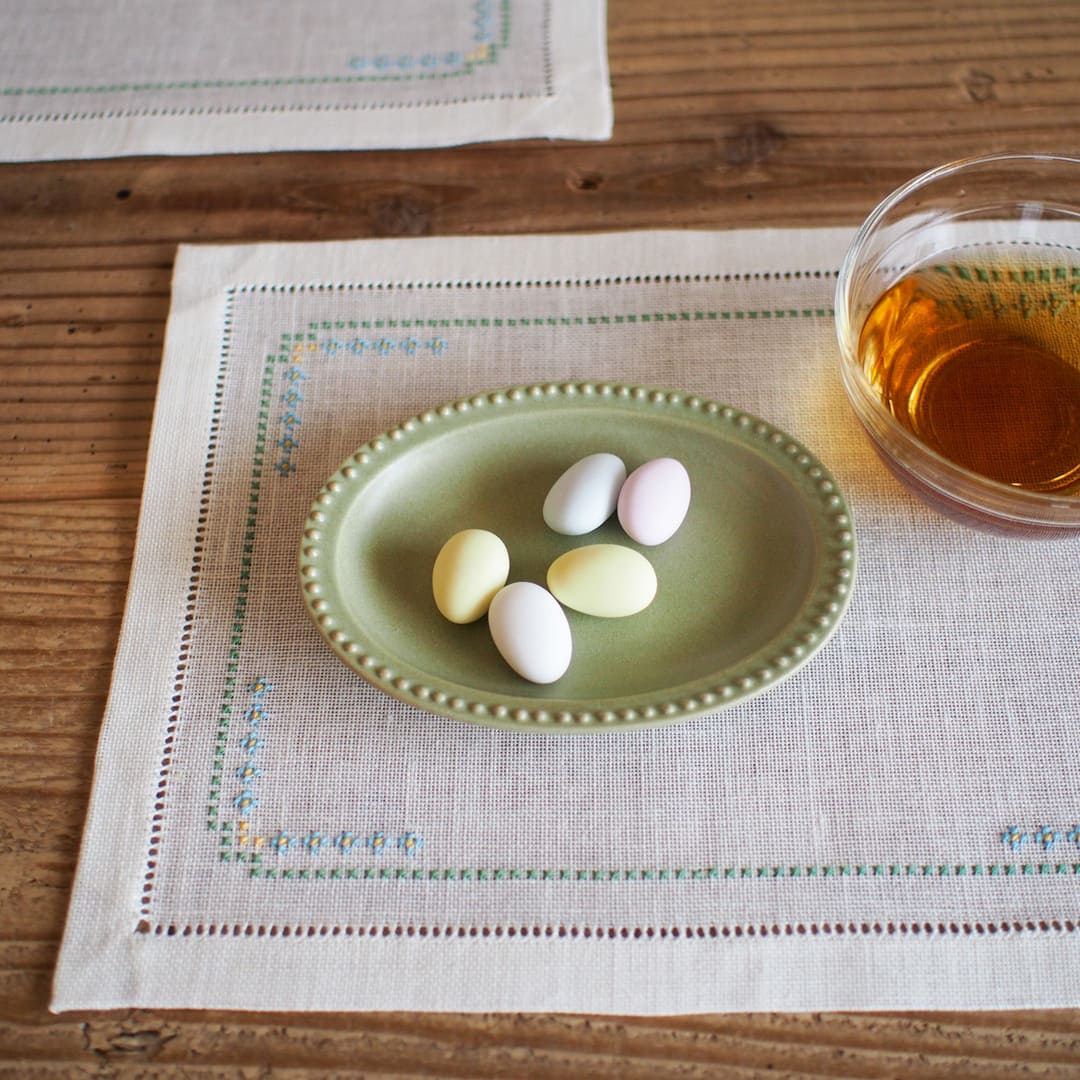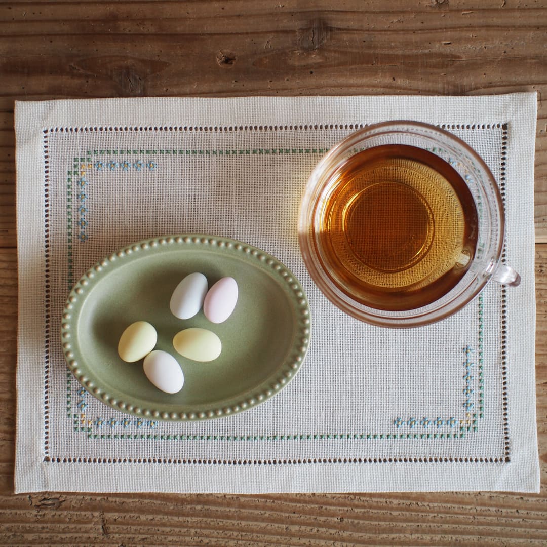 小花モチーフの連続模様のクロスステッチを刺し、テーブルを彩るティーマットを作りましょう。ダイニングテーブルはもちろんの事、サイドテールの上に敷いても。