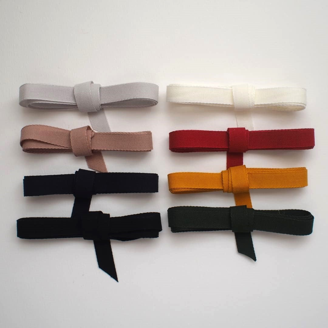コットン素材の平織りリボン。お洗濯してもしわになりにくく、お洋服の付属や巾着バッグの持ち手にと使いやすいリボンです。