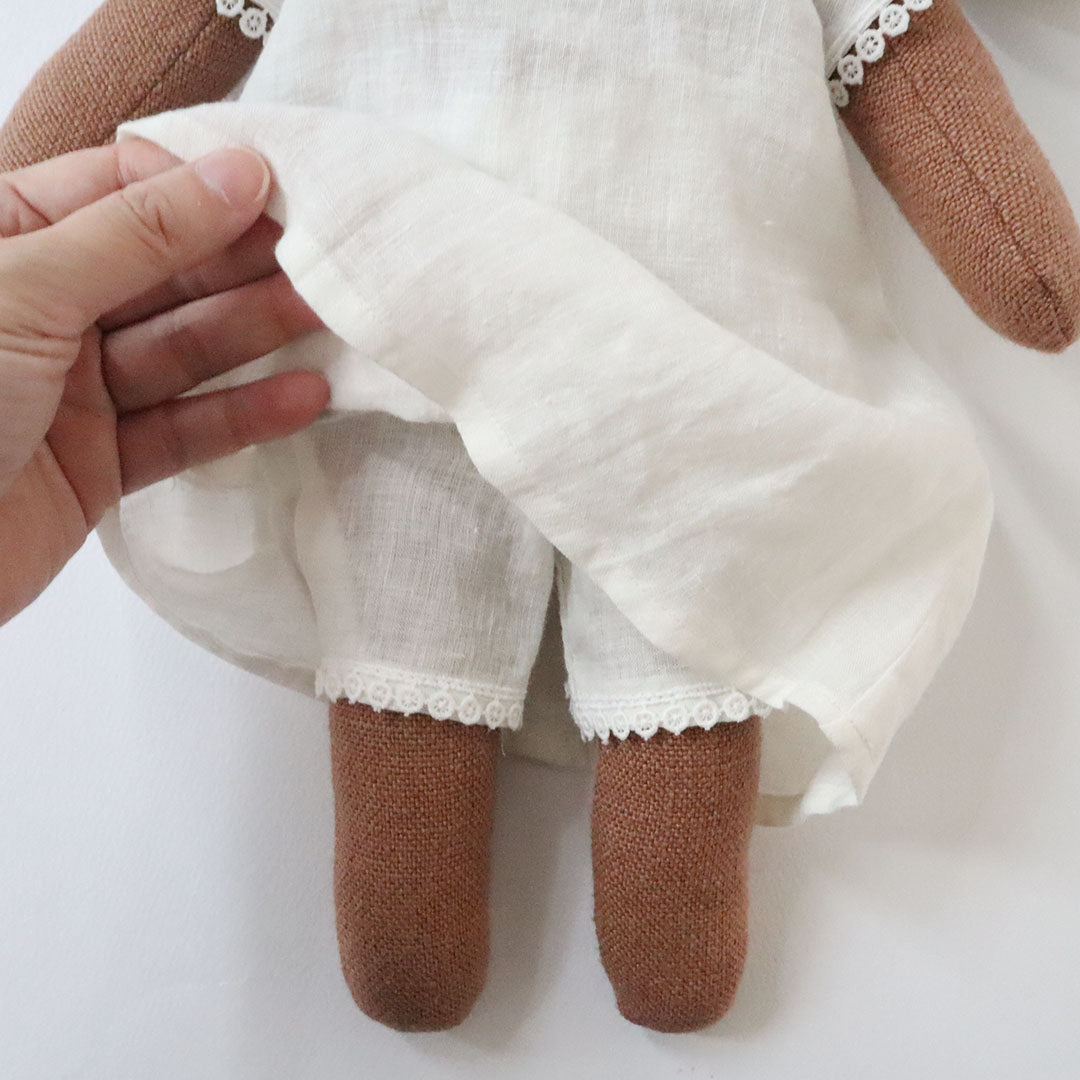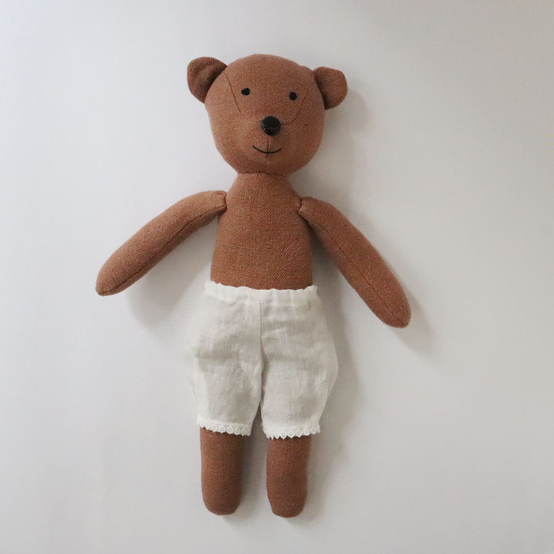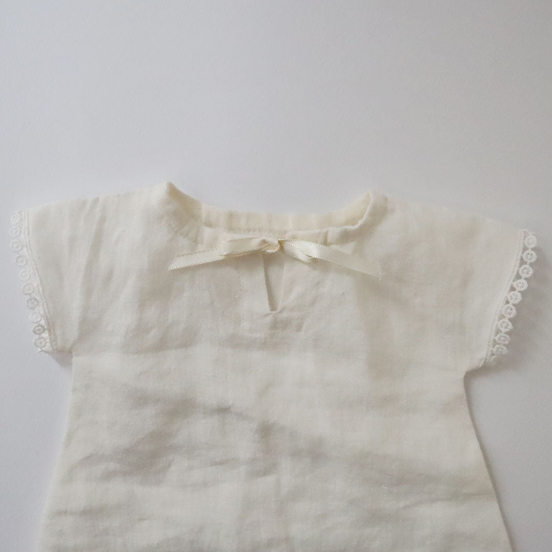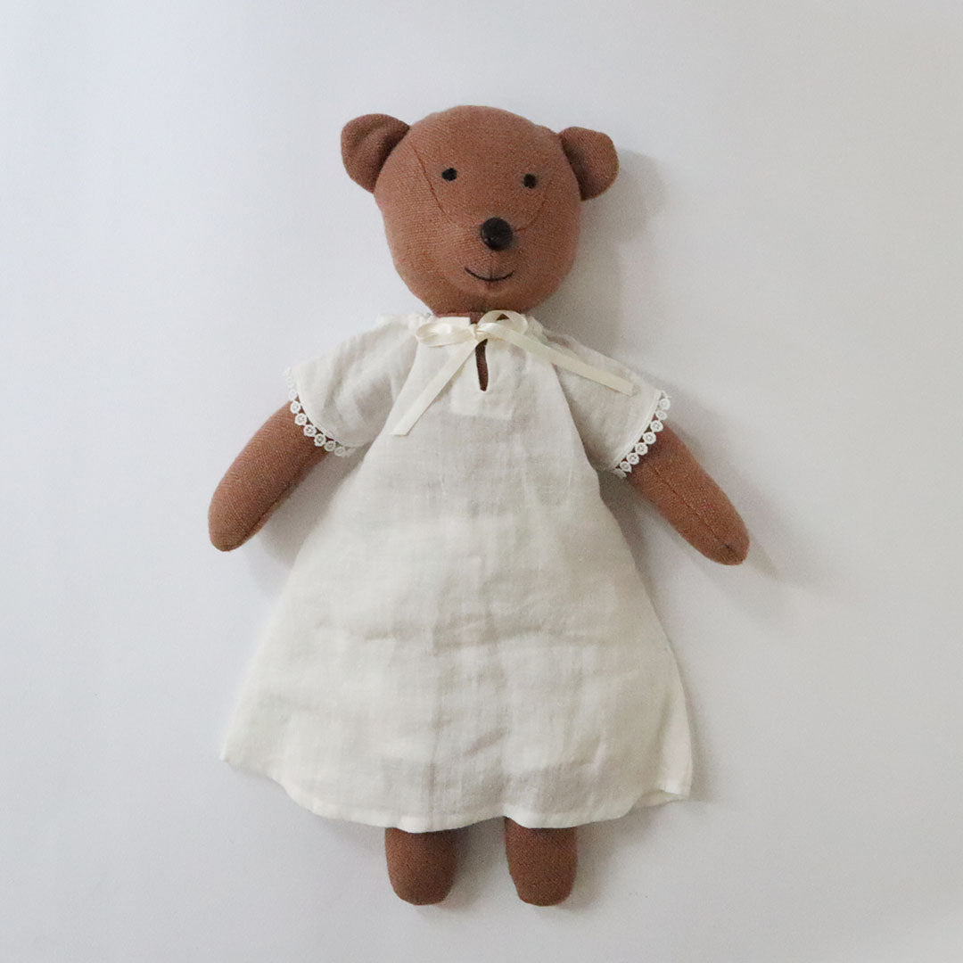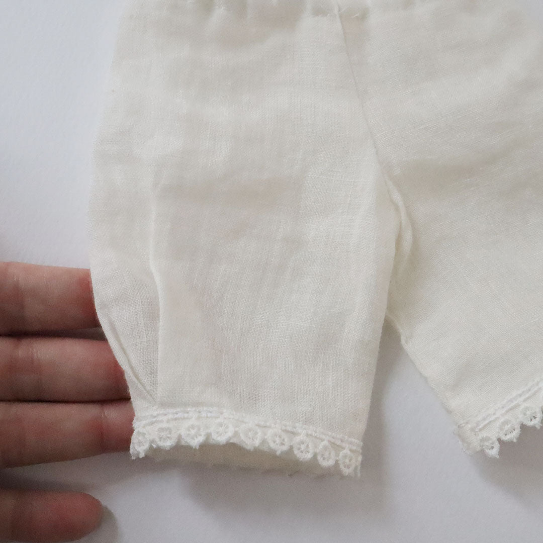 くまのクゥクゥのリネンのナイティ。やわらかくしなやかな白いリネンがとても気持ちよさそう。レースとリボンがアクセントに。ナイティはワンピースとパンツで上下分かれています。