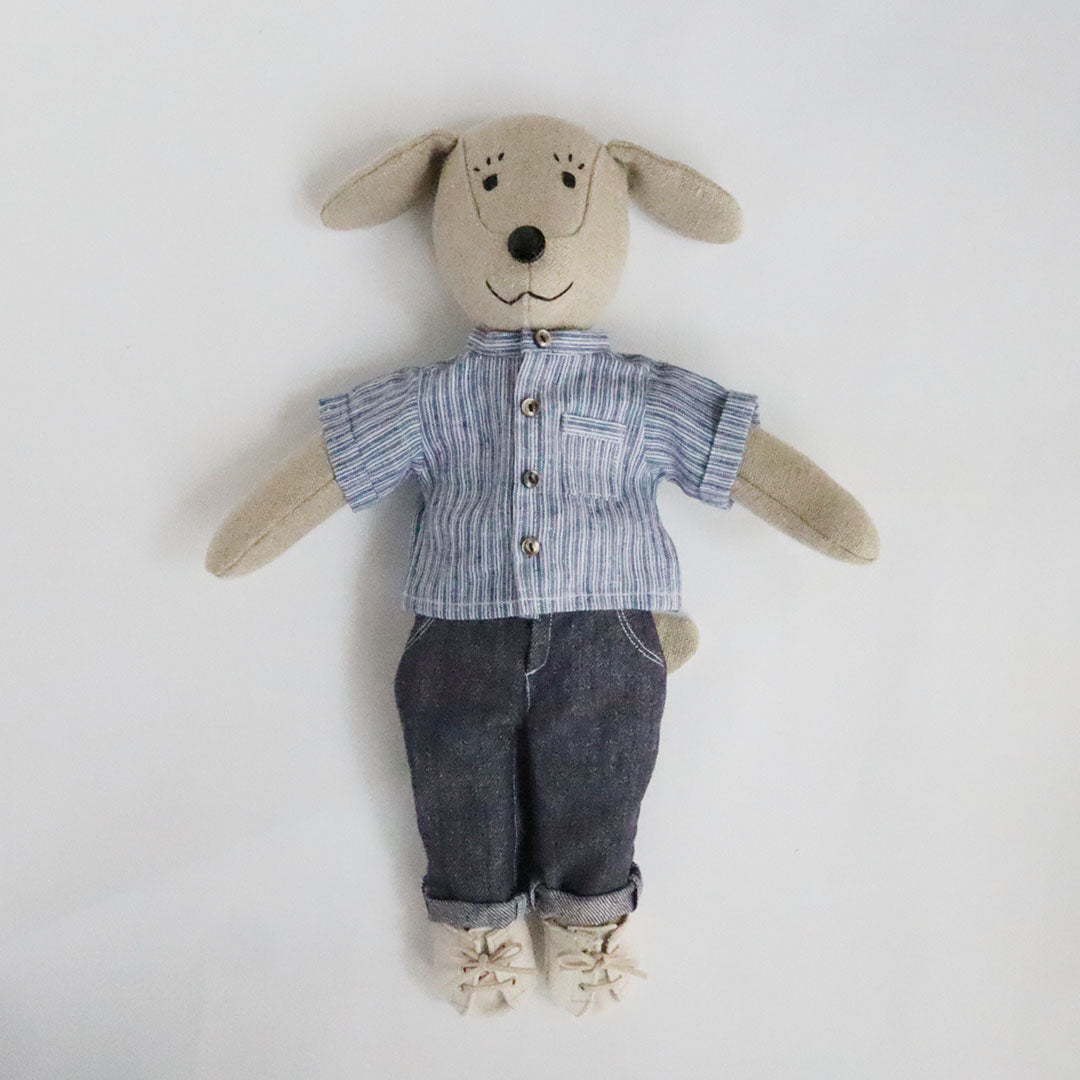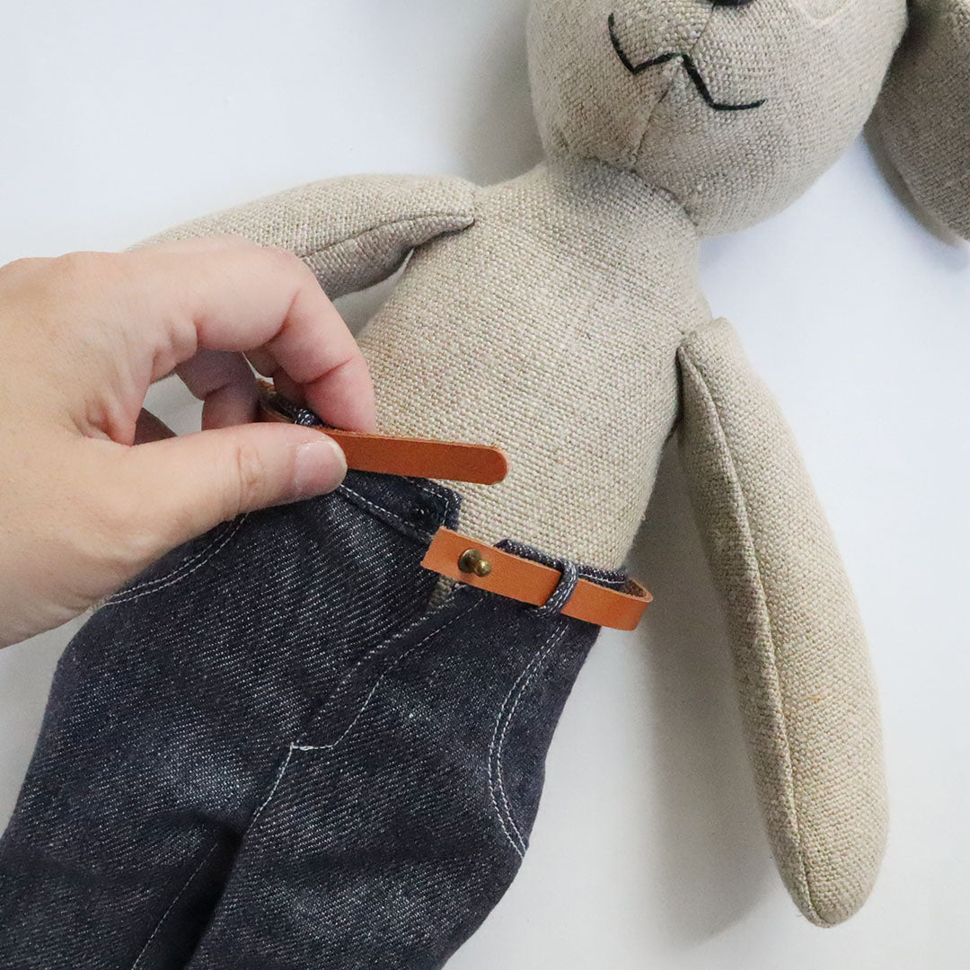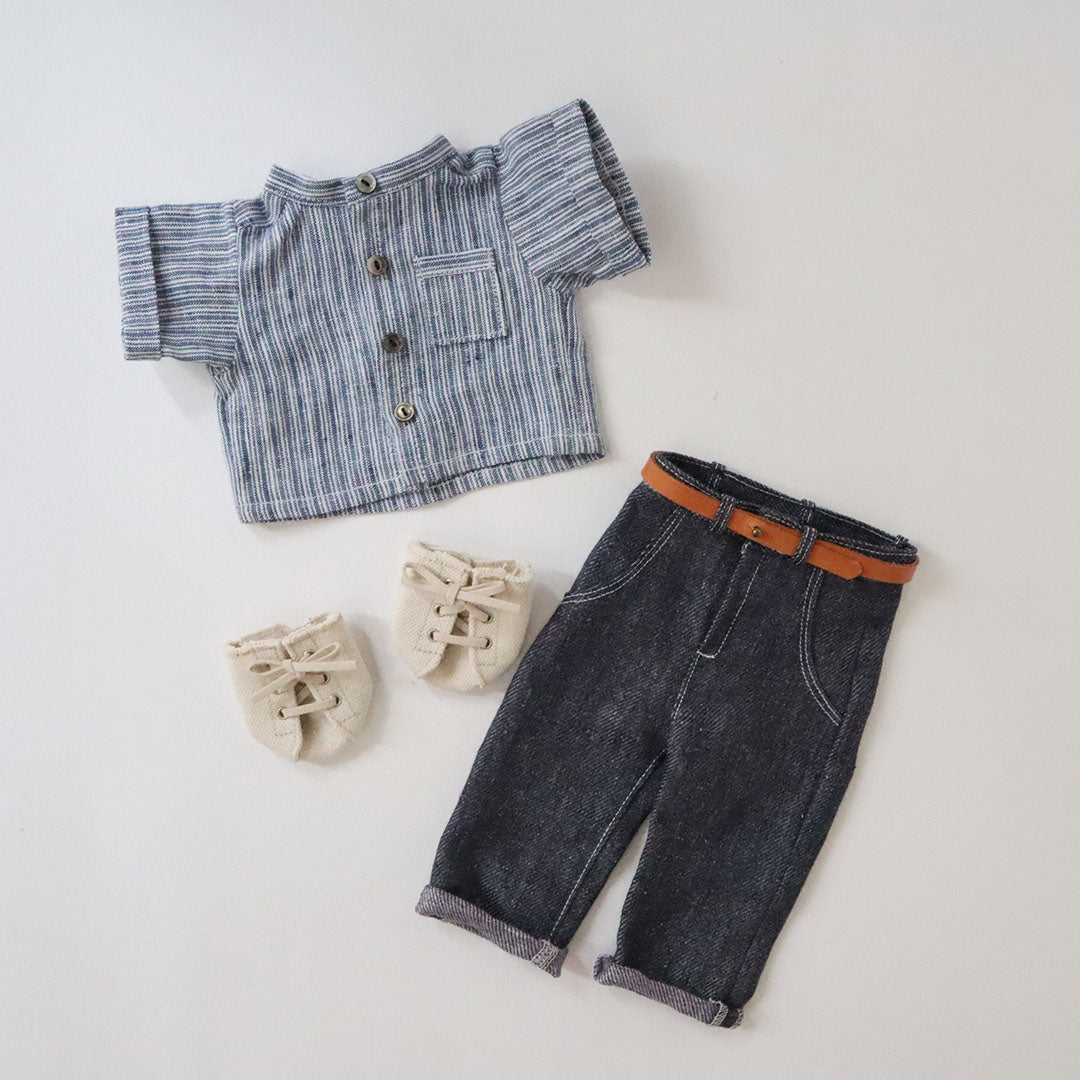 デニムパンツには革のベルトがついていたり、キャンバスシューズには紐を通せたり、小さいながらこだわりが詰まっています。