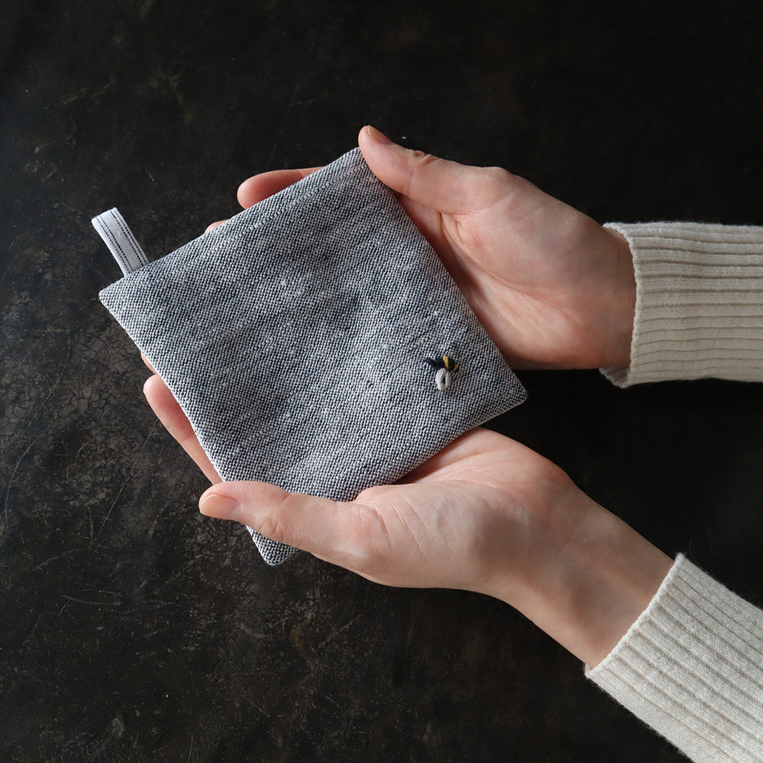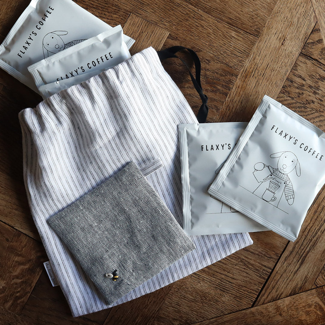リネンの巾着にドリップバッグ5個セットとみつばちの手刺しゅうが入ったコースターが入った特別なセットをつくりました。ホリデーシーズンのギフトに、お世話になっている人へのお礼に。気軽にプレゼントできるギフトバッグです。