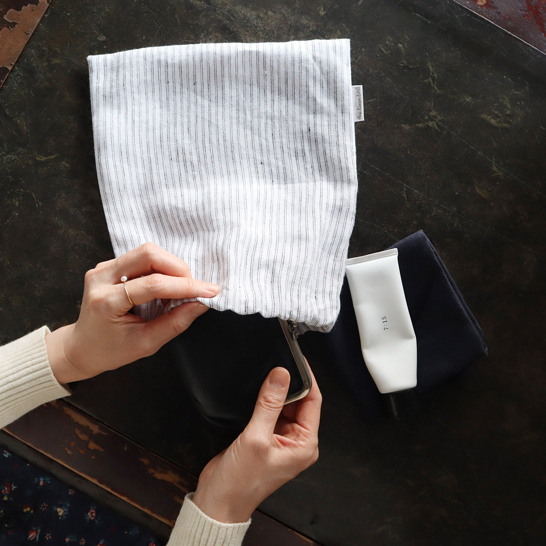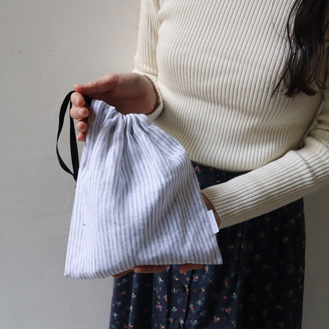 さわやかなストライプのリネンでつくった巾着は、お財布やハンカチなど身の回りのものを整理するのにちょうどいいサイズ。