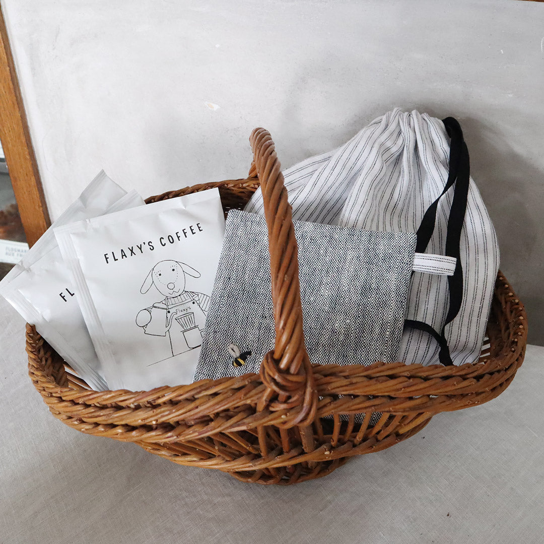 金森美也子さんとリネンバードの本「おしゃれぐまクゥクゥのたのしい一日」に登場するいぬのフラクシィの洋服のお店「FLAXSY’S 」のドリップバッグと手刺しゅうの入ったコースターをリネンの巾着に入れた限定のギフトバッグをつくりました。