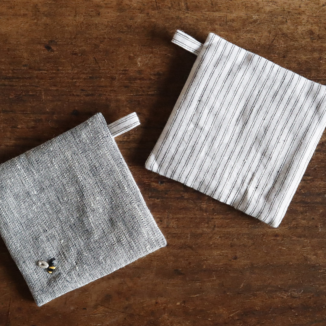 コースターにはみつばちが1点1点手刺しゅうが施されています。キルト芯が入っているのでふっくらとした厚みがあります。