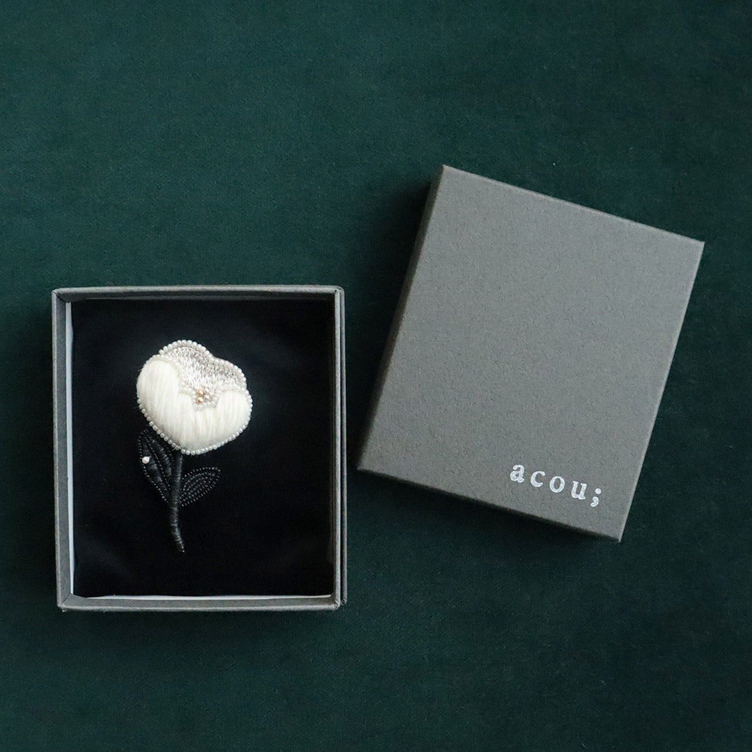 オートクチュール刺繡を学んだ後、2015年より刺繡ブローチのブランド「acou;」を始める。作品販売や企画展への参加等で活動中。おさえた色味に愛らしい花のモチーフは、幅広い年齢層に親しまれている。著書「シックな色の糸とビーズで、花の刺繡ブローチ」「花の刺繡こもの」(文化出版局)がある。