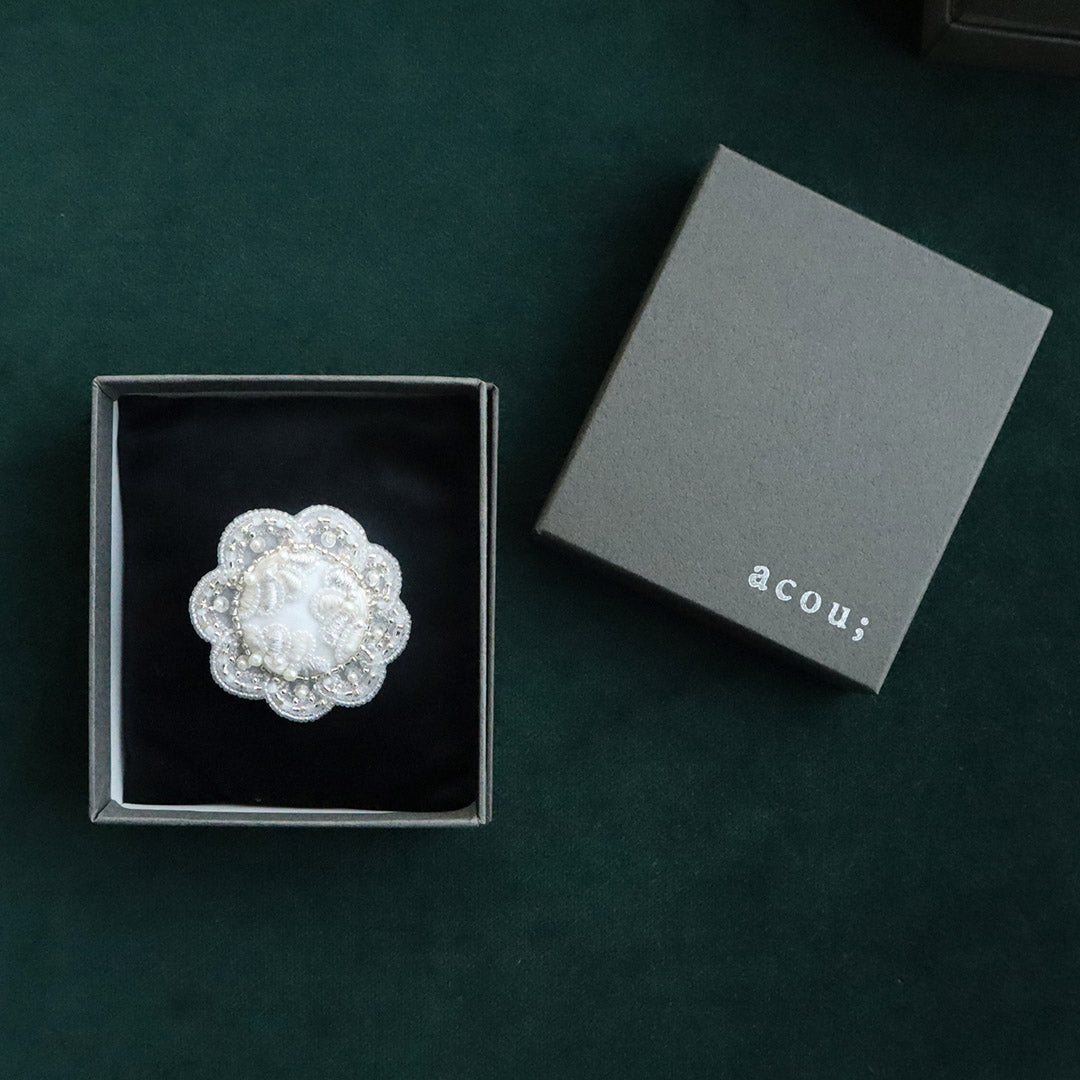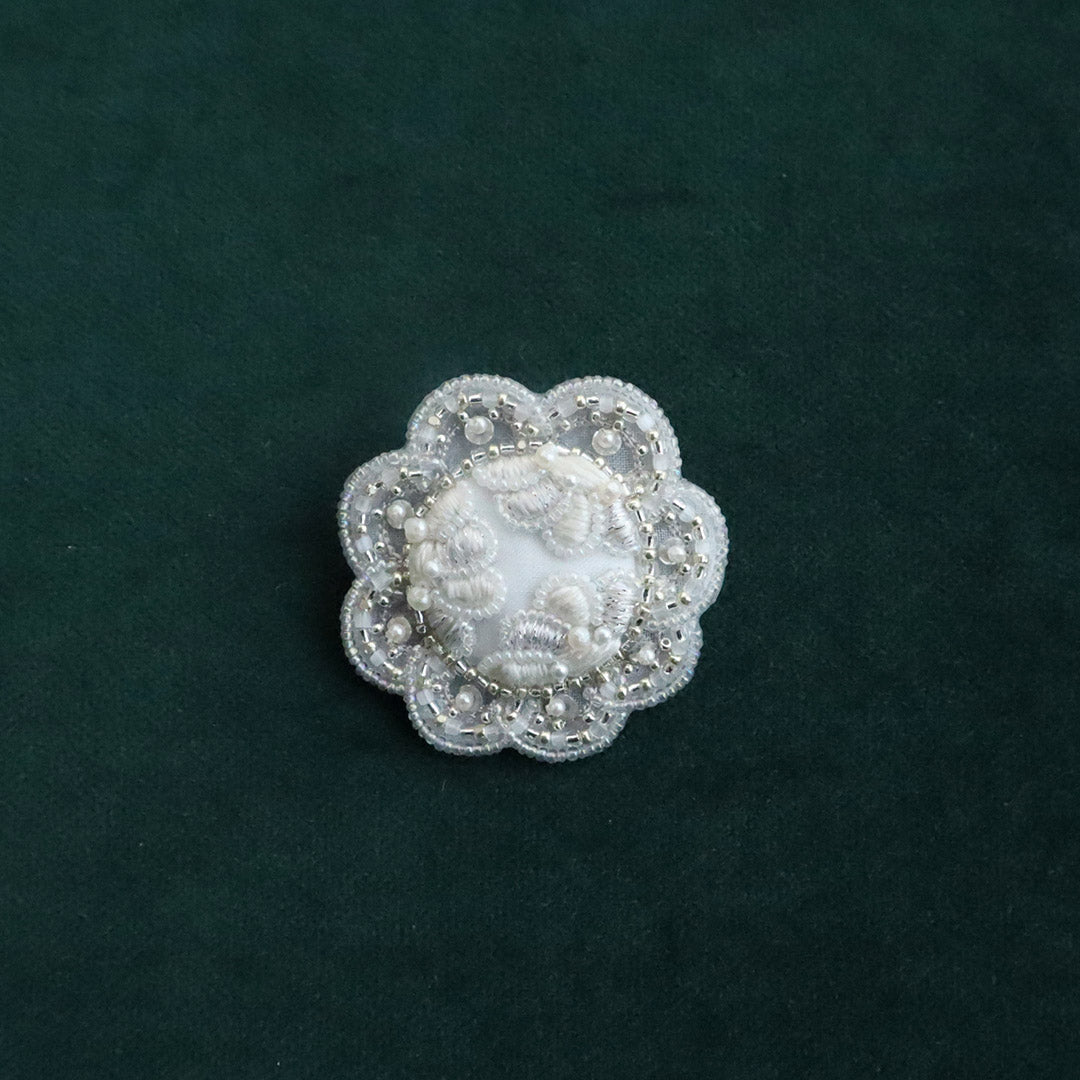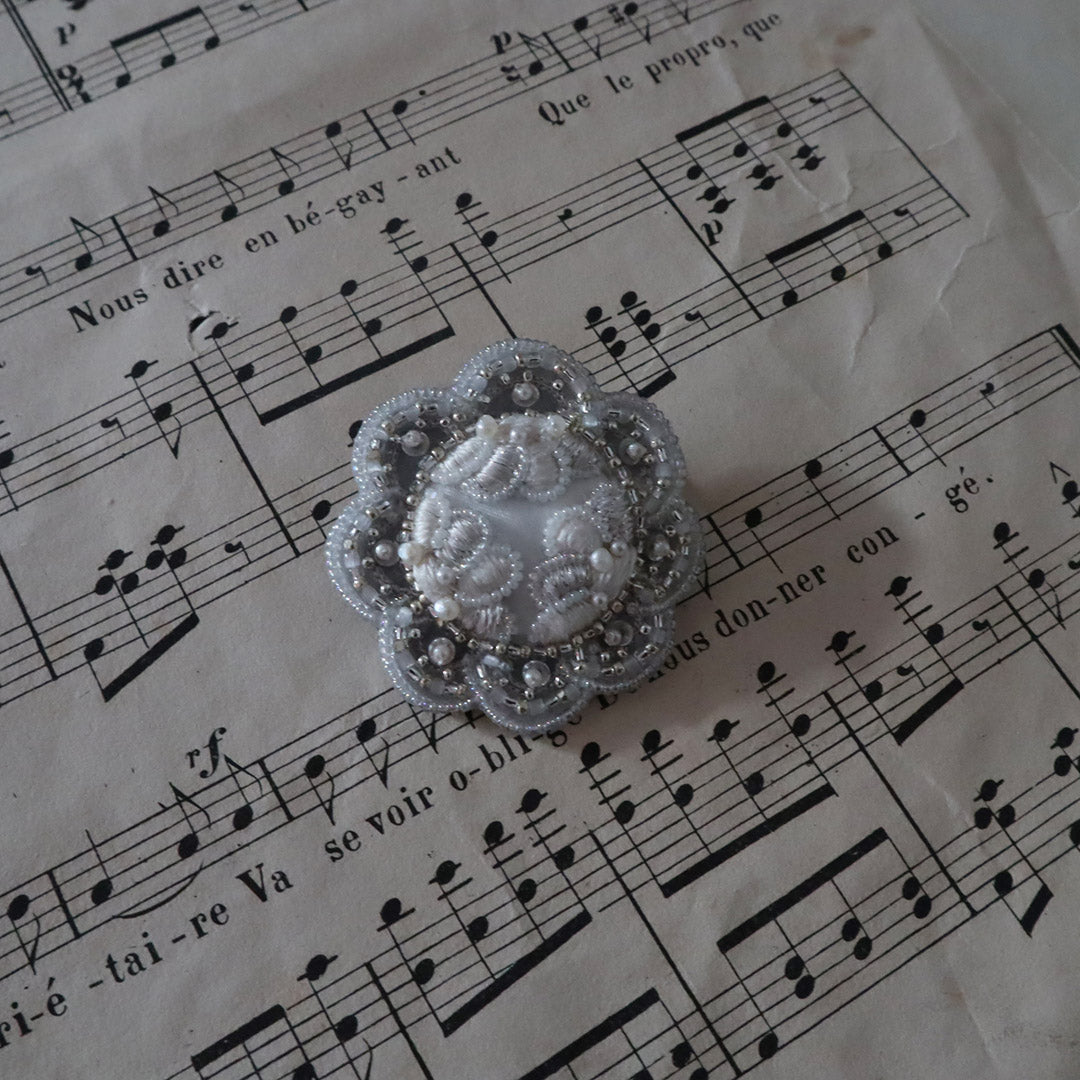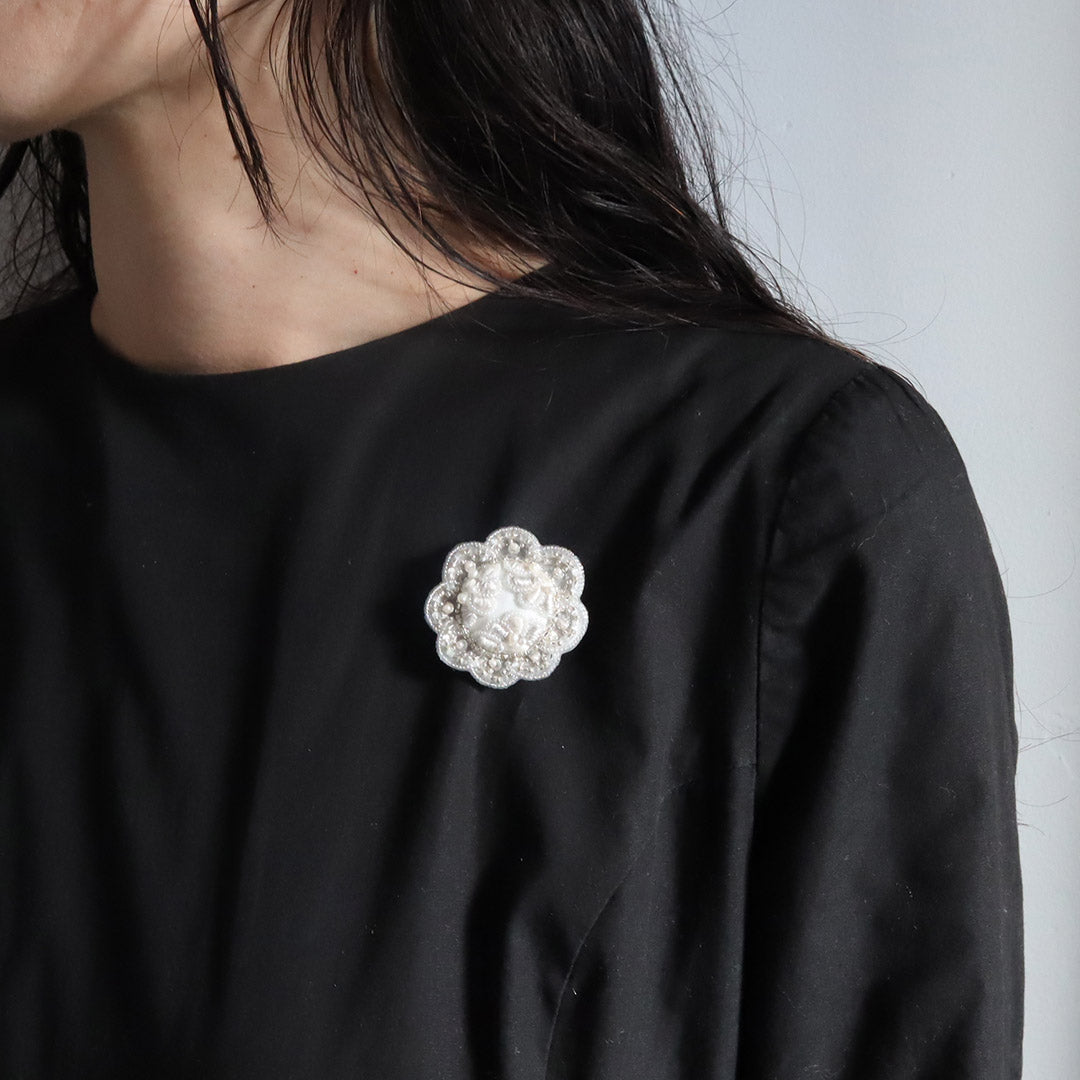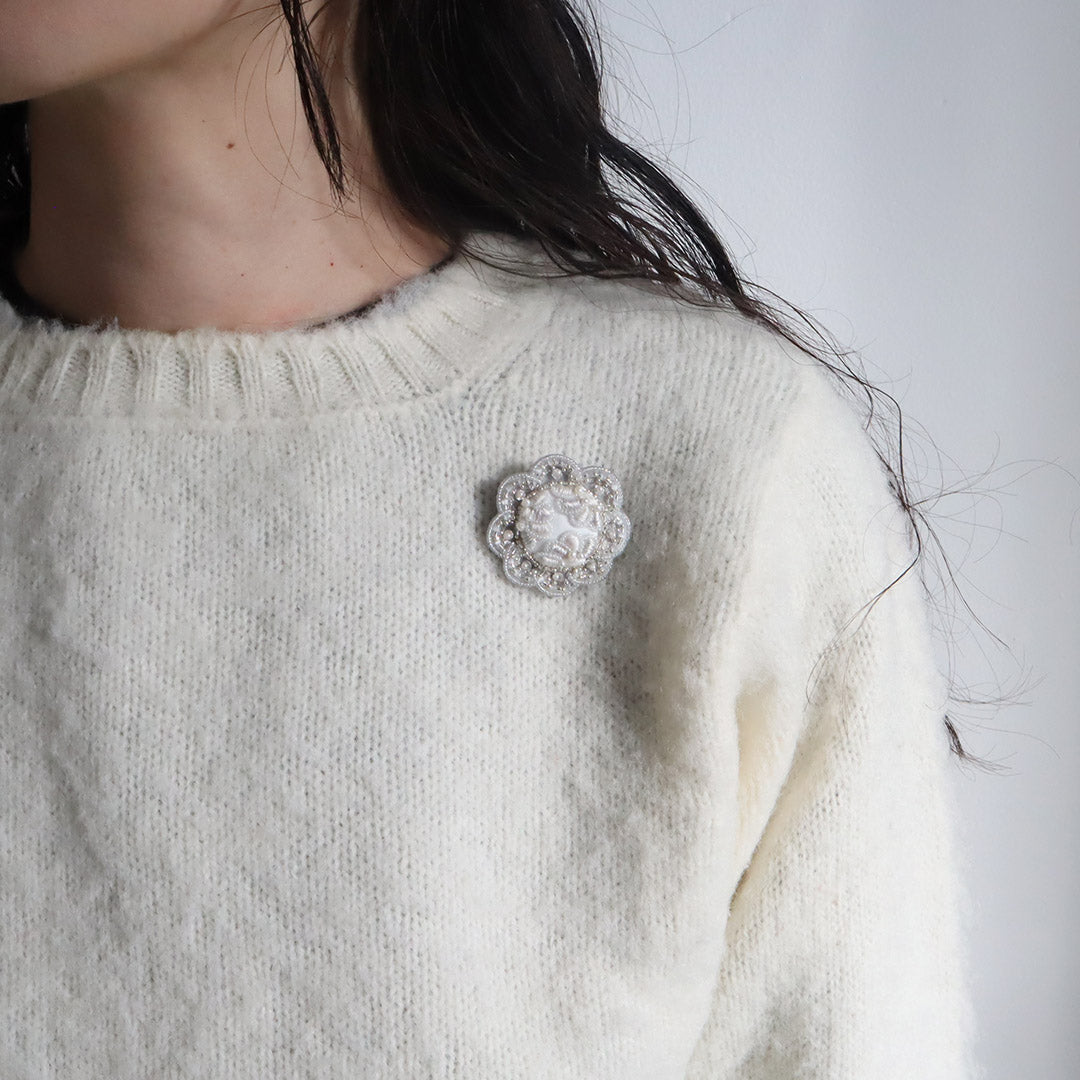オーガンジーの透け感をいかしたレースのようなブローチ。鮮やかな淡水パールやシルク糸と極小のシルバービーズを用いて繊細に仕上げられています。身に着けるとなんだか少し自信が持てるような・・お守りのようなブローチであれたらと、名前にもフランス語で「信じる」という意味の想いが込められています。