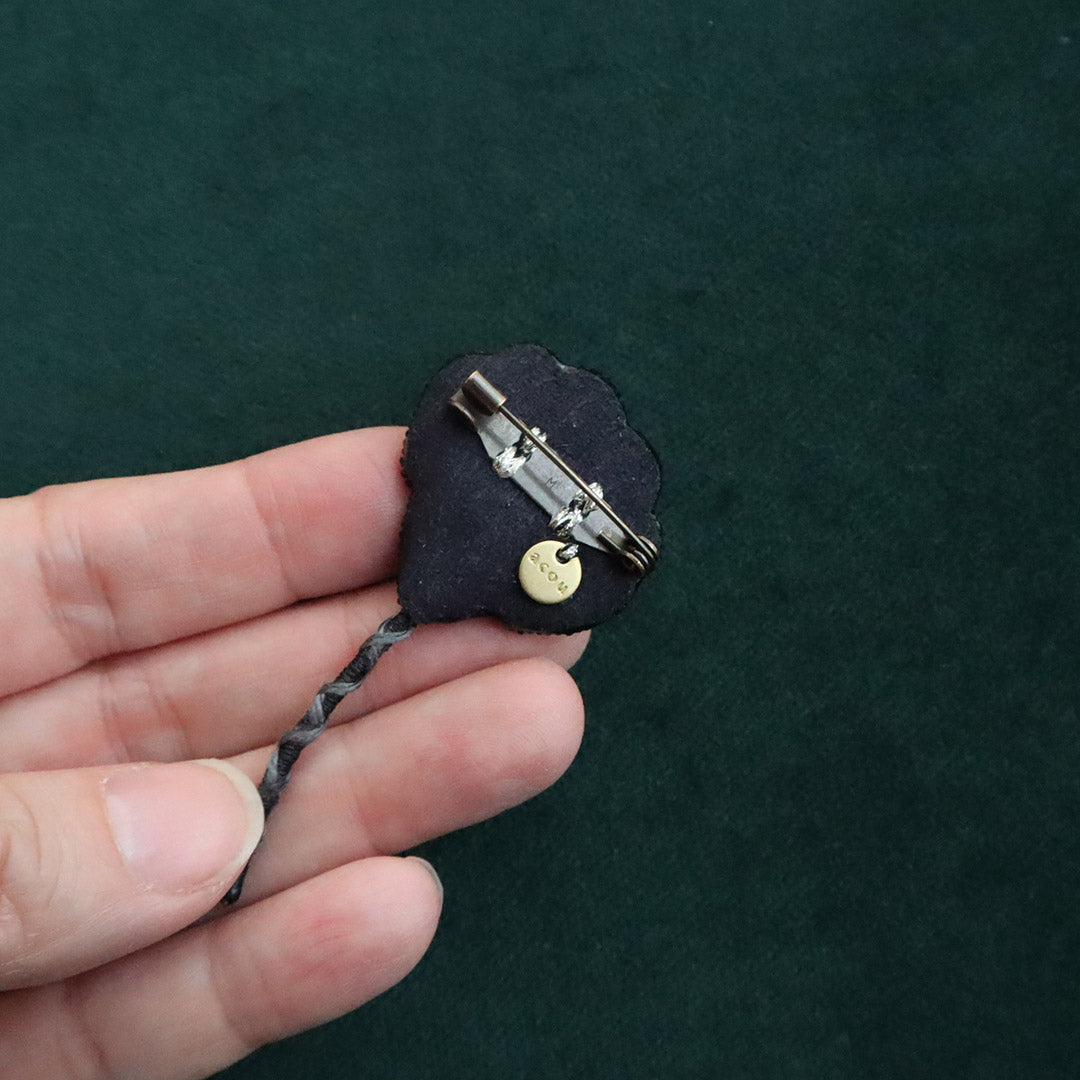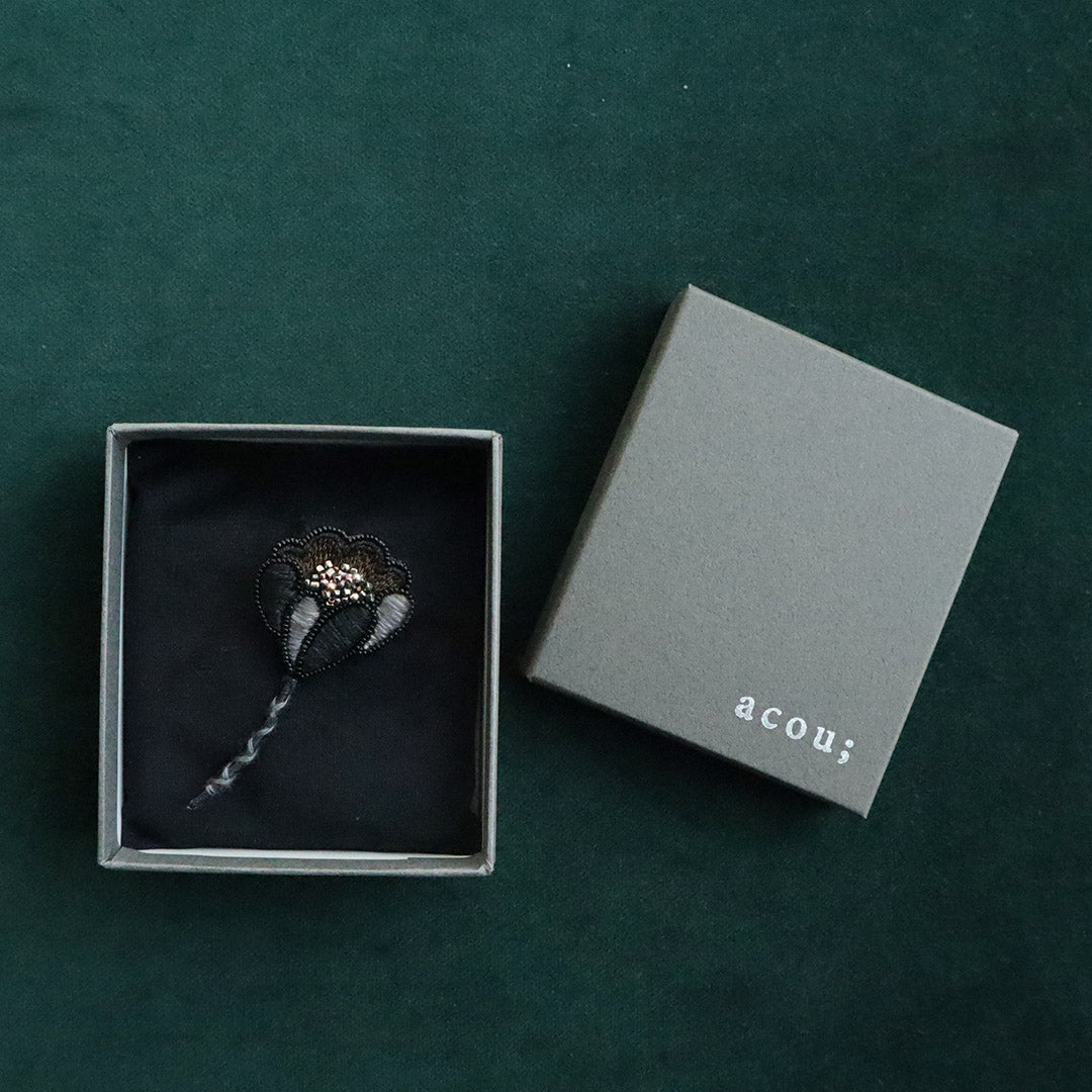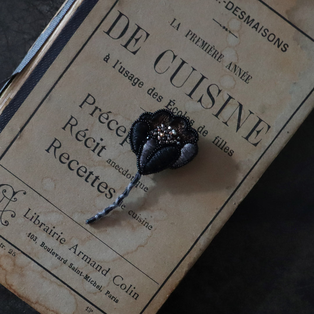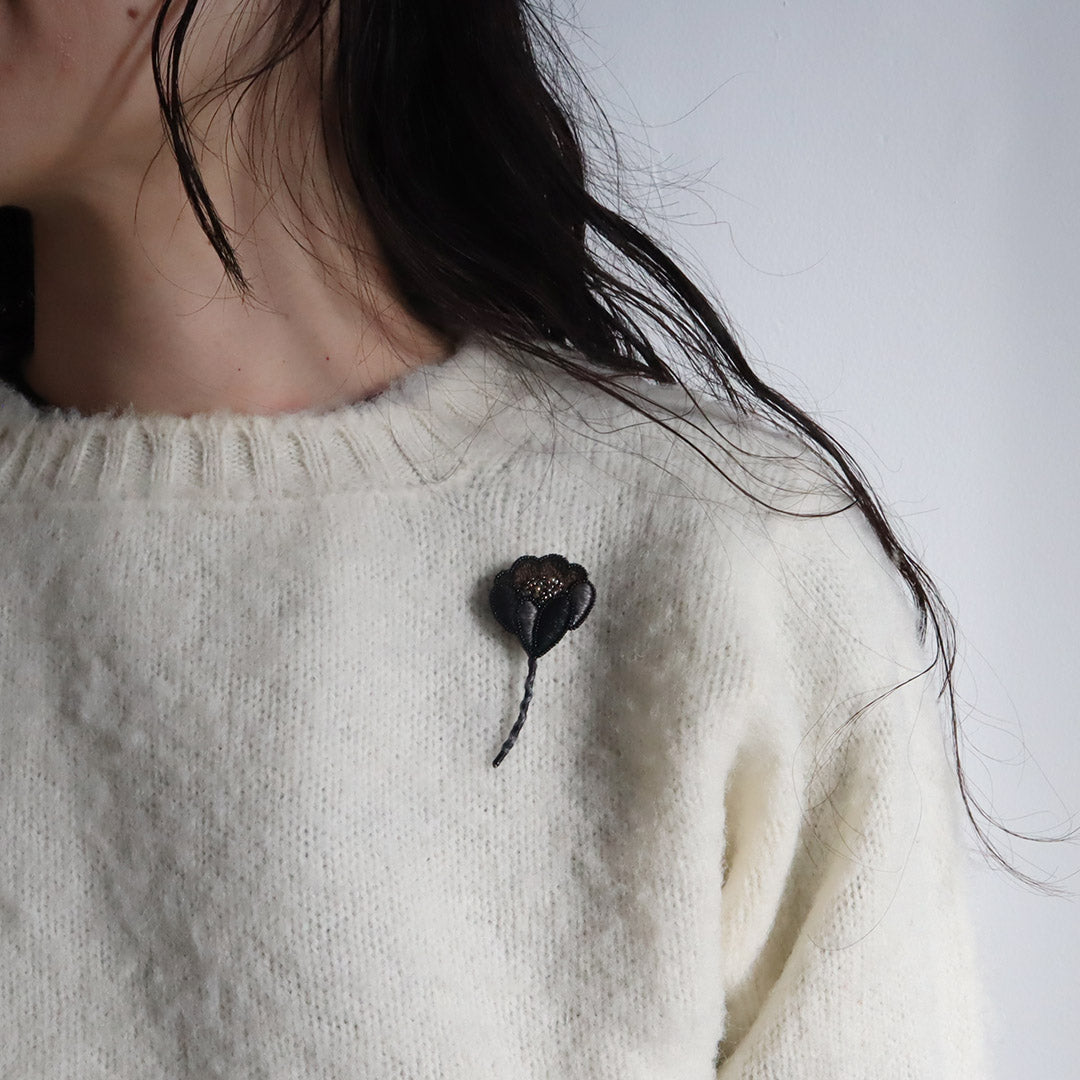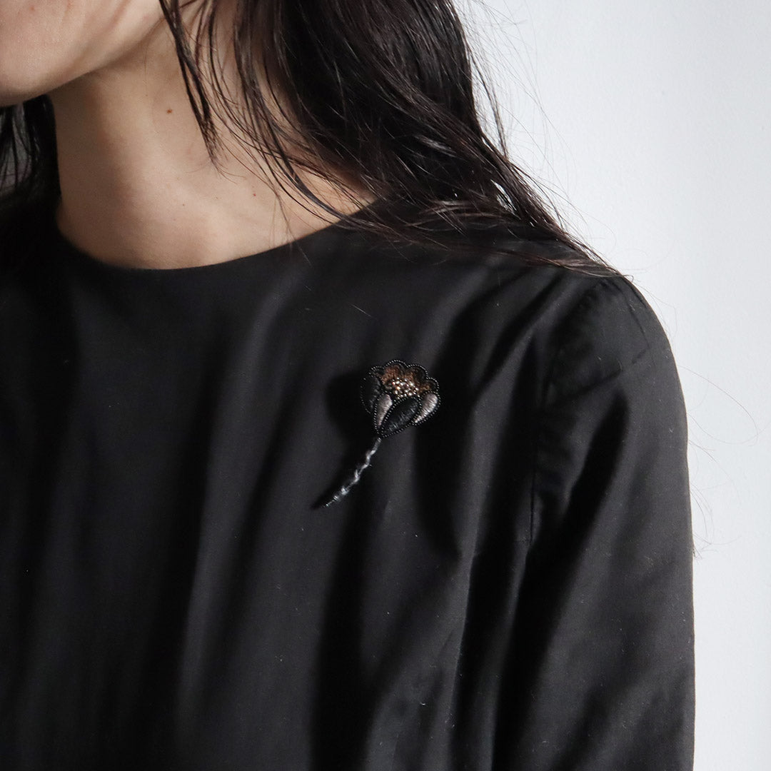 モノトーンの世界にはどんなお花が咲くだろう?と想像から生まれたブローチ。花芯はコッパーやブロンズ、アイアンのような色味のヴィンテージビーズやパールビーズなどを用いて立体的に刺しています。金属のような質感と繊細な糸のステッチとのコントラストがシックでありつつも存在感があります。