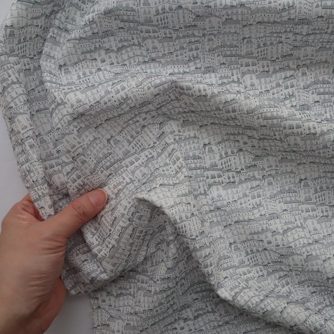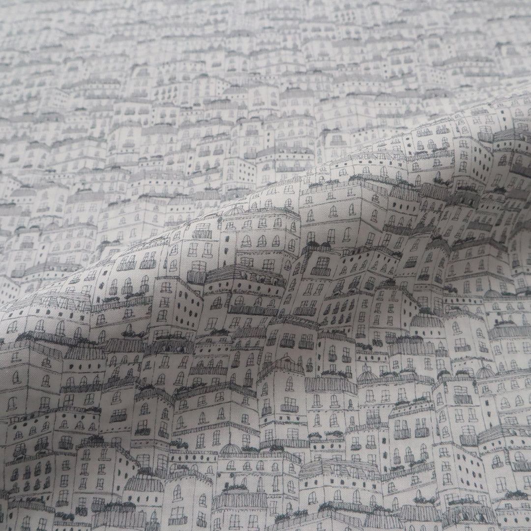 リバティのスタジオにて細いライナーペンを使って手描きされたこの魅力的な 建築スケッチは、パリの特徴的な都市景観にインスパイアされています。巧み な遠近法と複数の視点を行き来しながら、この素晴らしい街のエッセンスを捉 えた楽しい屋根を際立たせています。