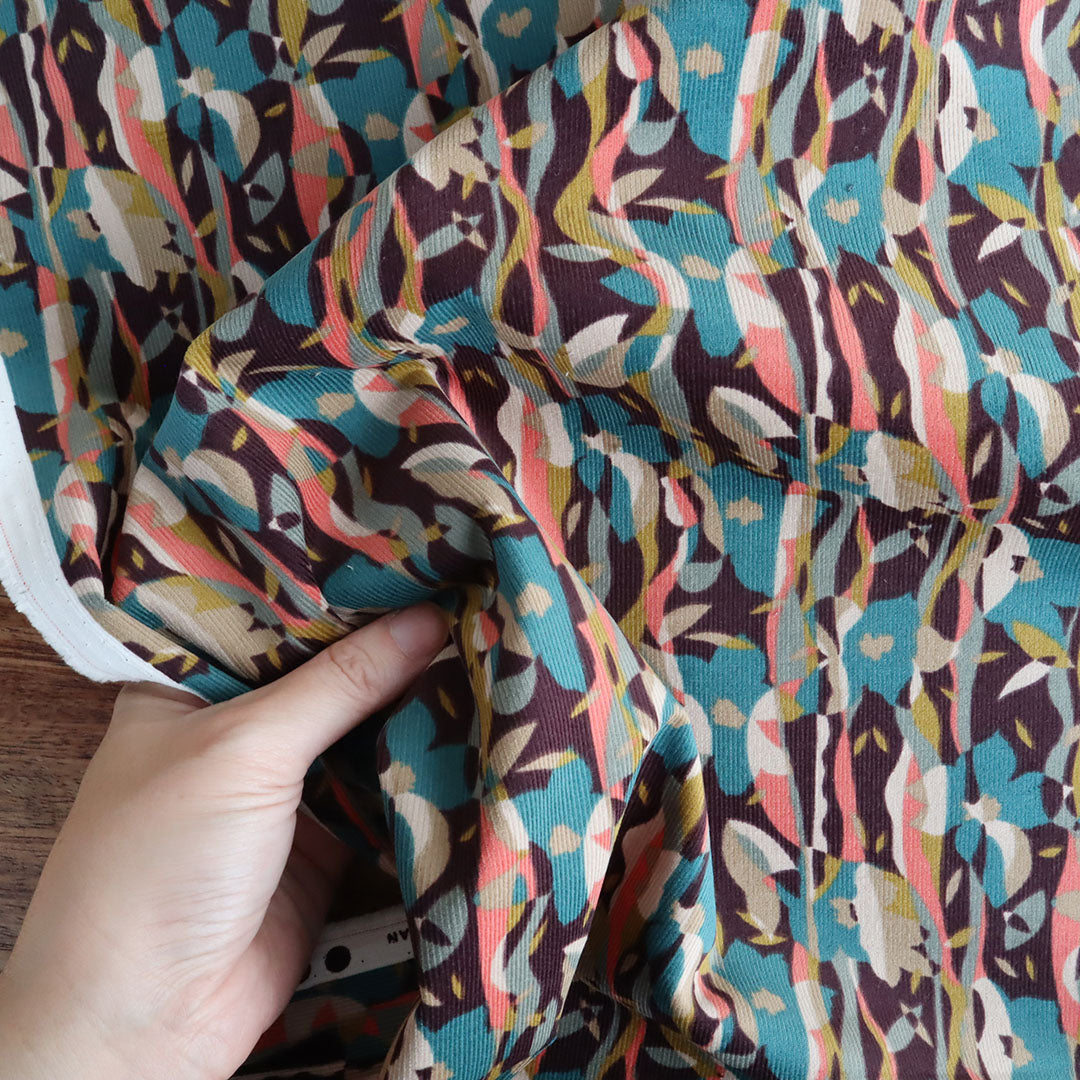 リバティ・ファブリックスから細畝のコーデュロイが届きました。やわらかな手触りと風合いの細コーデュロイで、ビロード織物特有の毛並みがあり、なで毛は光沢感があり、逆毛は色が濃く見えます。タナローンと同じ柄でも、コーデュロイなら洋服に仕立てた時の雰囲気が変わって色の深みが増し、より立体的な柄の印象になります。