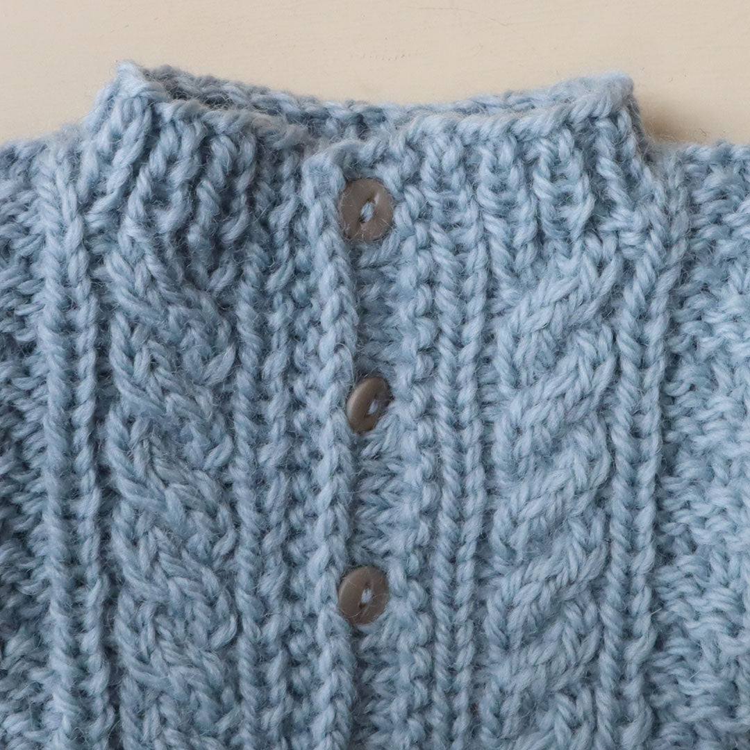 ふっくらとしたウール糸で編むアランカーディガンは、立体的なケーブル模様と貝ボタンがアクセント。まっすぐ編みの身頃・袖の各パーツをつなげてから、えりと前立てを拾い目してつくります。