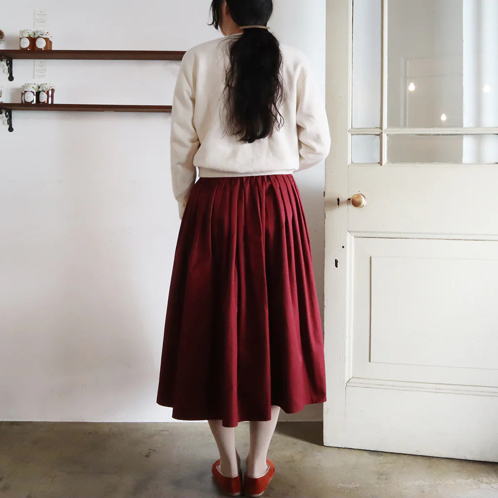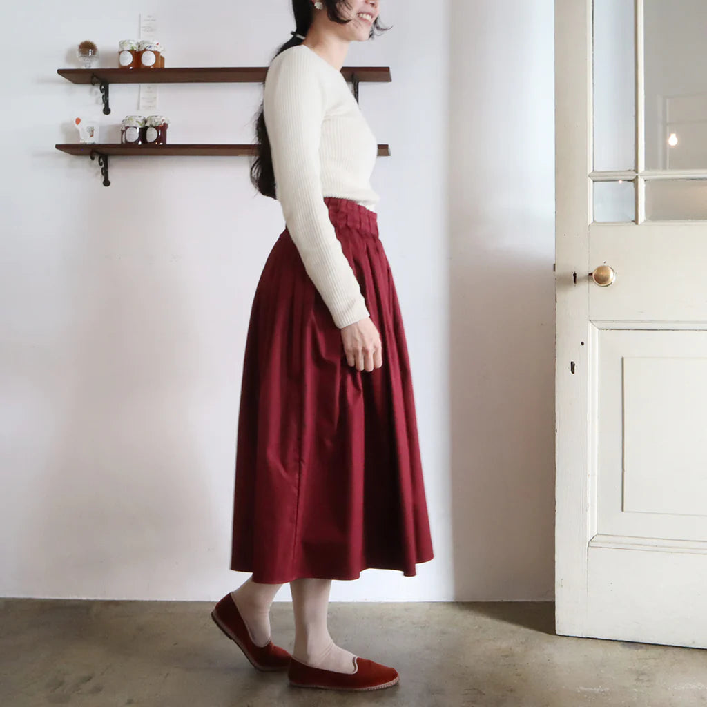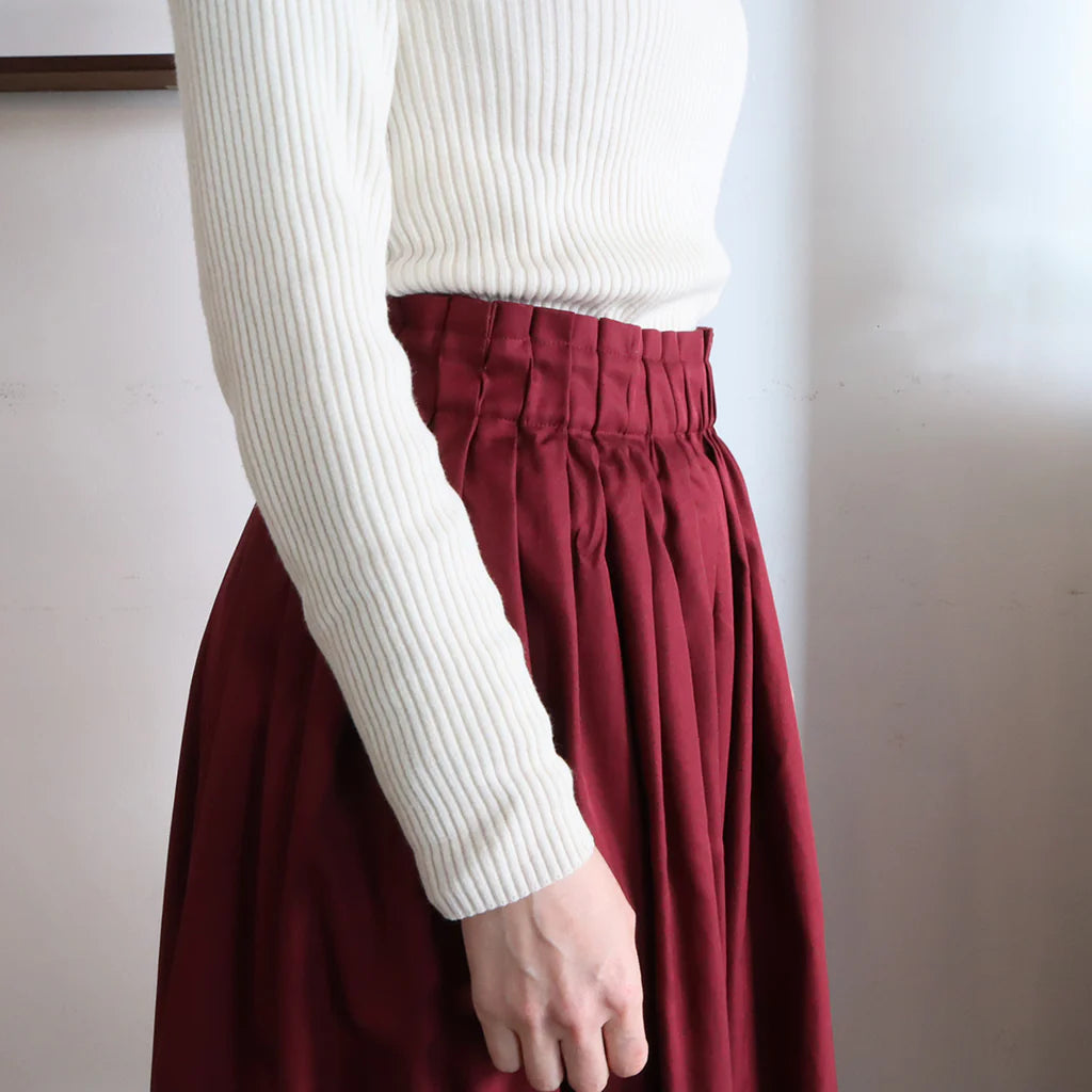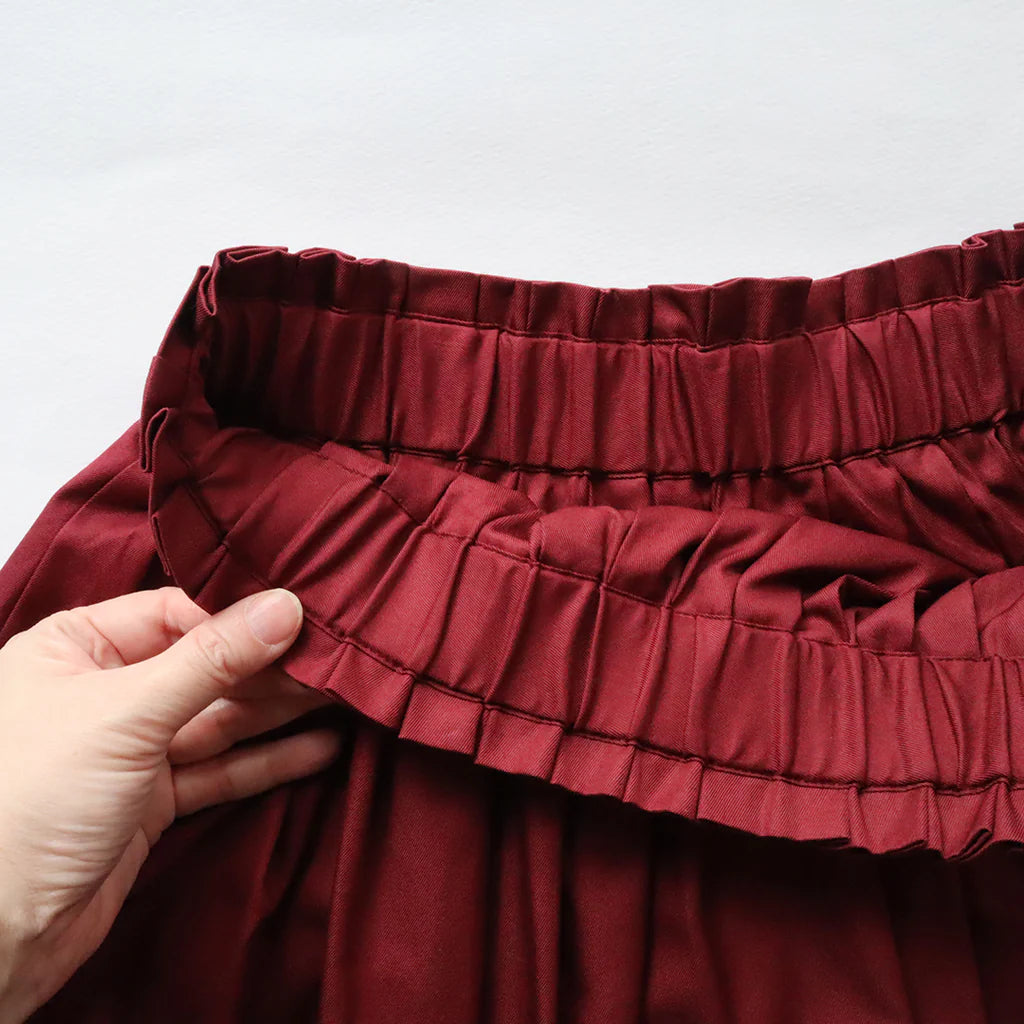 ウエスト部分にタックをたたみ、最後にゴムを通しギャザーを寄せて仕上げます。生地をたっぷりとつかうボリュームのあるスカートですが、タックをたたむことによりウエスト周りはすっきり仕上がります。