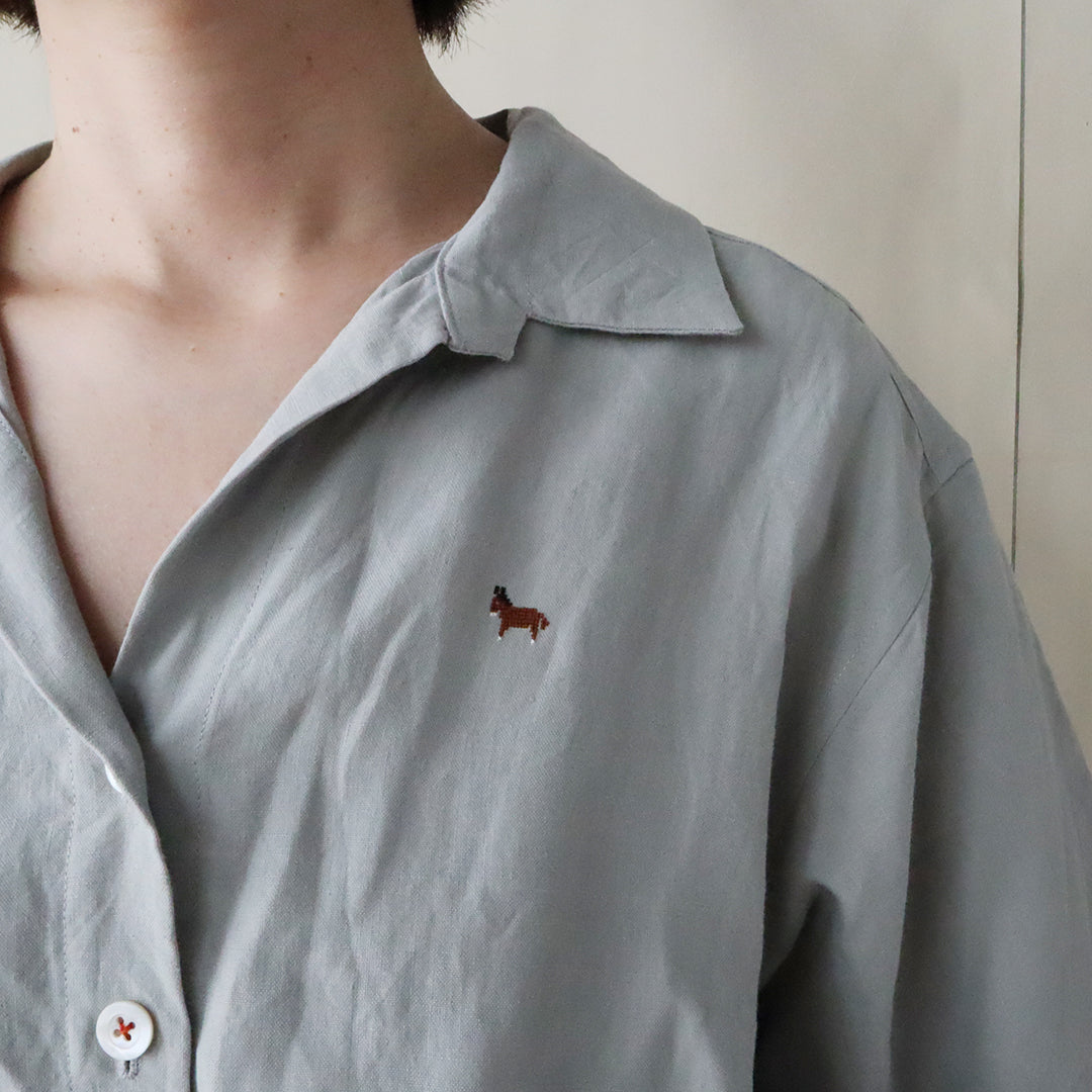 胸元には愛らしいロバのワンポイント刺繍。クロスステッチは布目の糸を2本ずつすくって繊細に仕上げられています。また、サイドポケットは備えていますが、ヒップ部分はデザインをすっきりと見せるため、あえてポケットを省いています。ポケット口はハンドステッチによるカンヌキで補強。丁寧な手しごとが施されています。