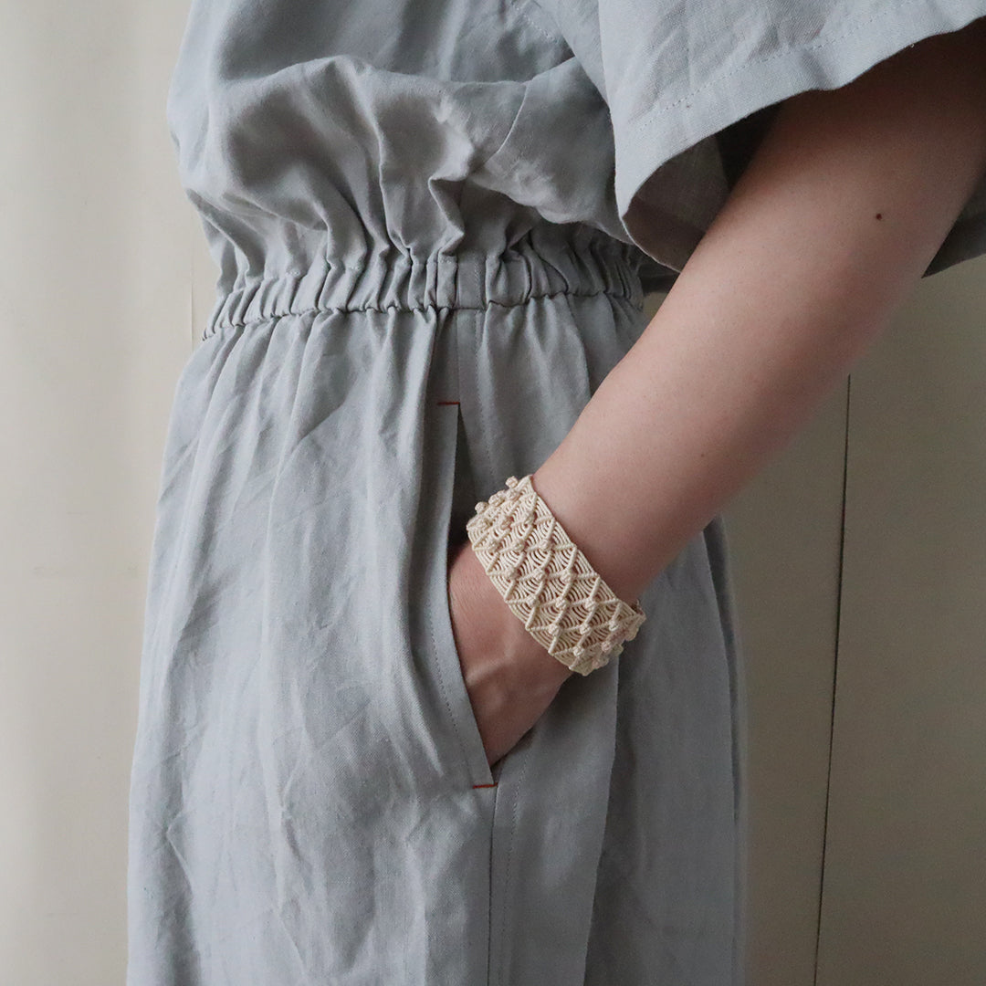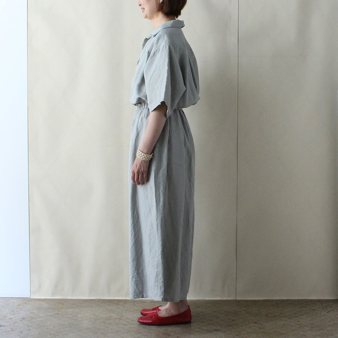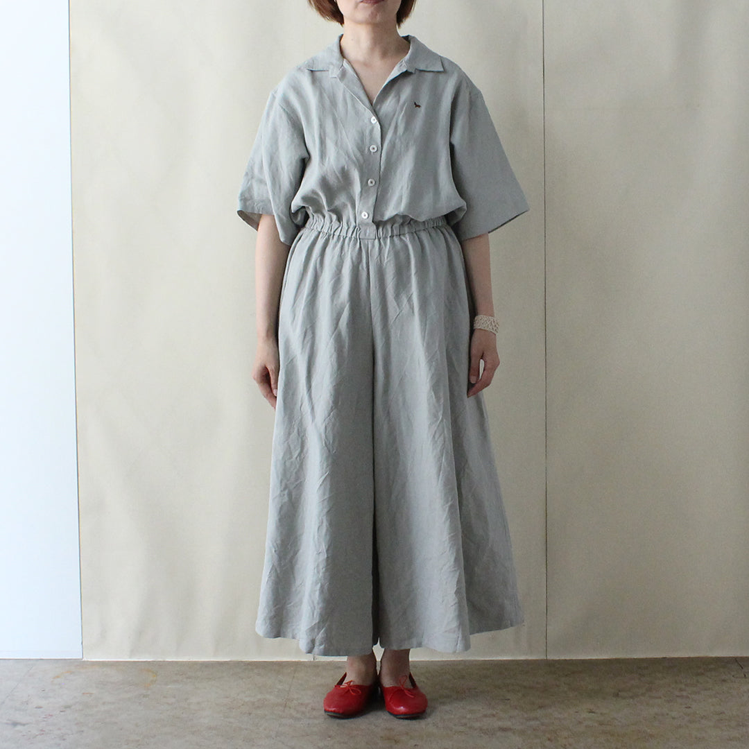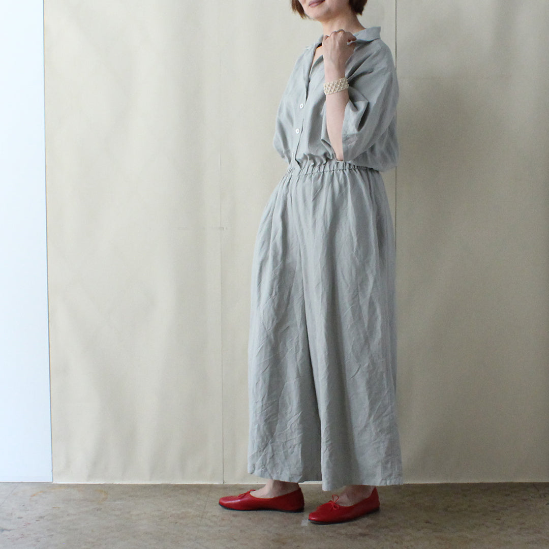 リネンのワンピースが夏の定番であるように、コンビネゾンも余分な要素をできるだけ省き、控えめで気軽に着られるデザインを目指して試作を重ね、完成しました。