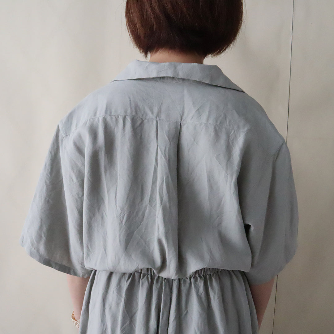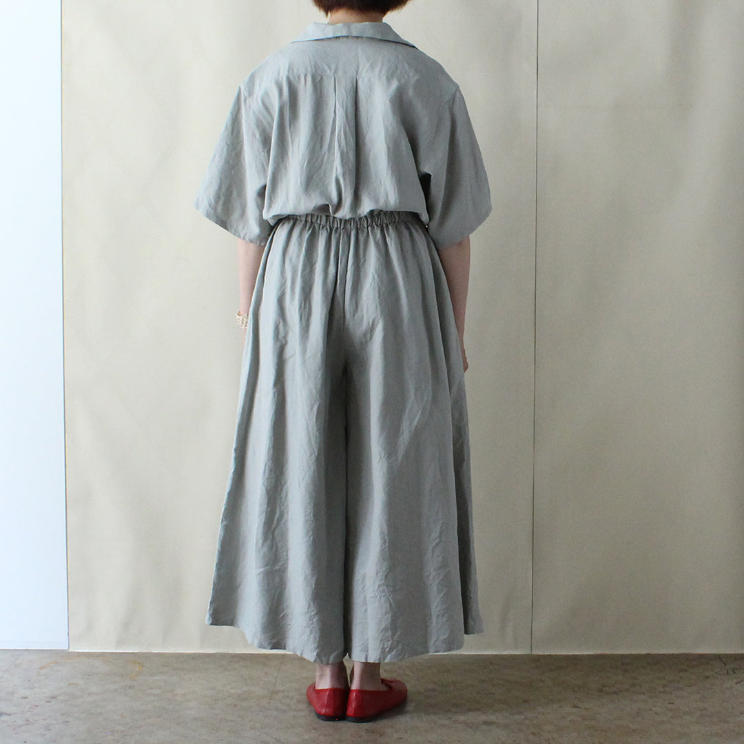 ほどよくゆとりを持たせたシャツとフレアパンツをつなげ、ウエストにゴムを入れることで、快適さとシャープな見た目のバランスが追及されています。