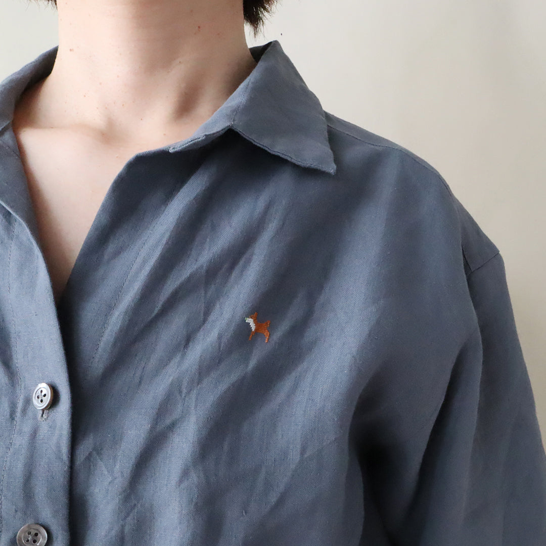 洗練された印象のグリは、濃色よりもやわらかさを感じる色合いです。しっとりとした肌触りの良い素材を使用し、胸元には柴犬の刺繍を施しています。
