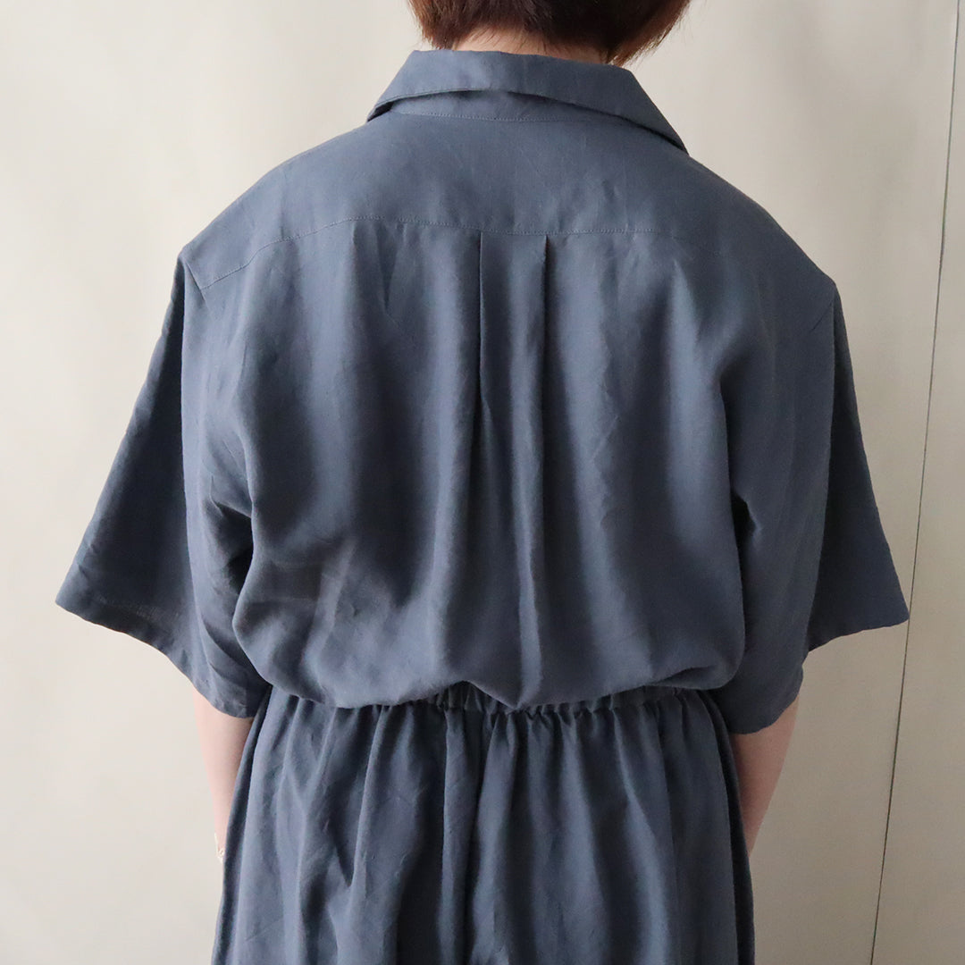 ほどよくゆとりを持たせたシャツとフレアパンツをつなげ、ウエストにゴムを入れることで、快適さとシャープな見た目のバランスが追及されています。