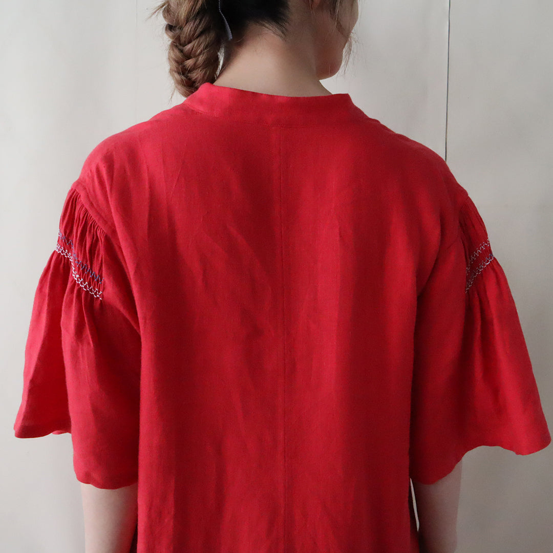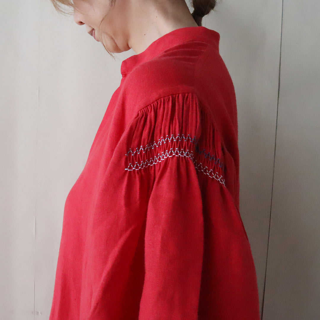 縦のラインが映えるよう、衿元をシャープに開けスタンドカラーをつけました。袖は袖山からスモッキング刺繍を施し、ギャザーによって裾に向かって魚の尾びれのように広がる「フィッシュスリーブ」です。ポケット口はハンドステッチによるカンヌキで補強。繊細で丁寧な手しごとが施されています。