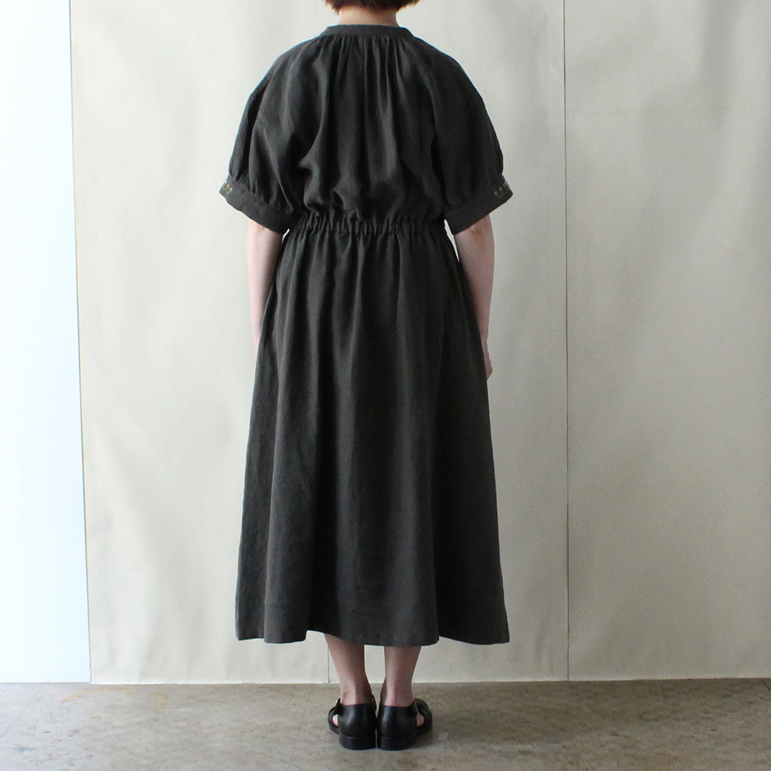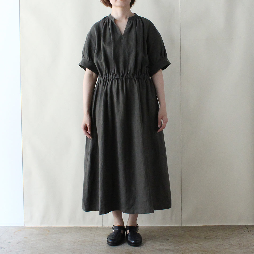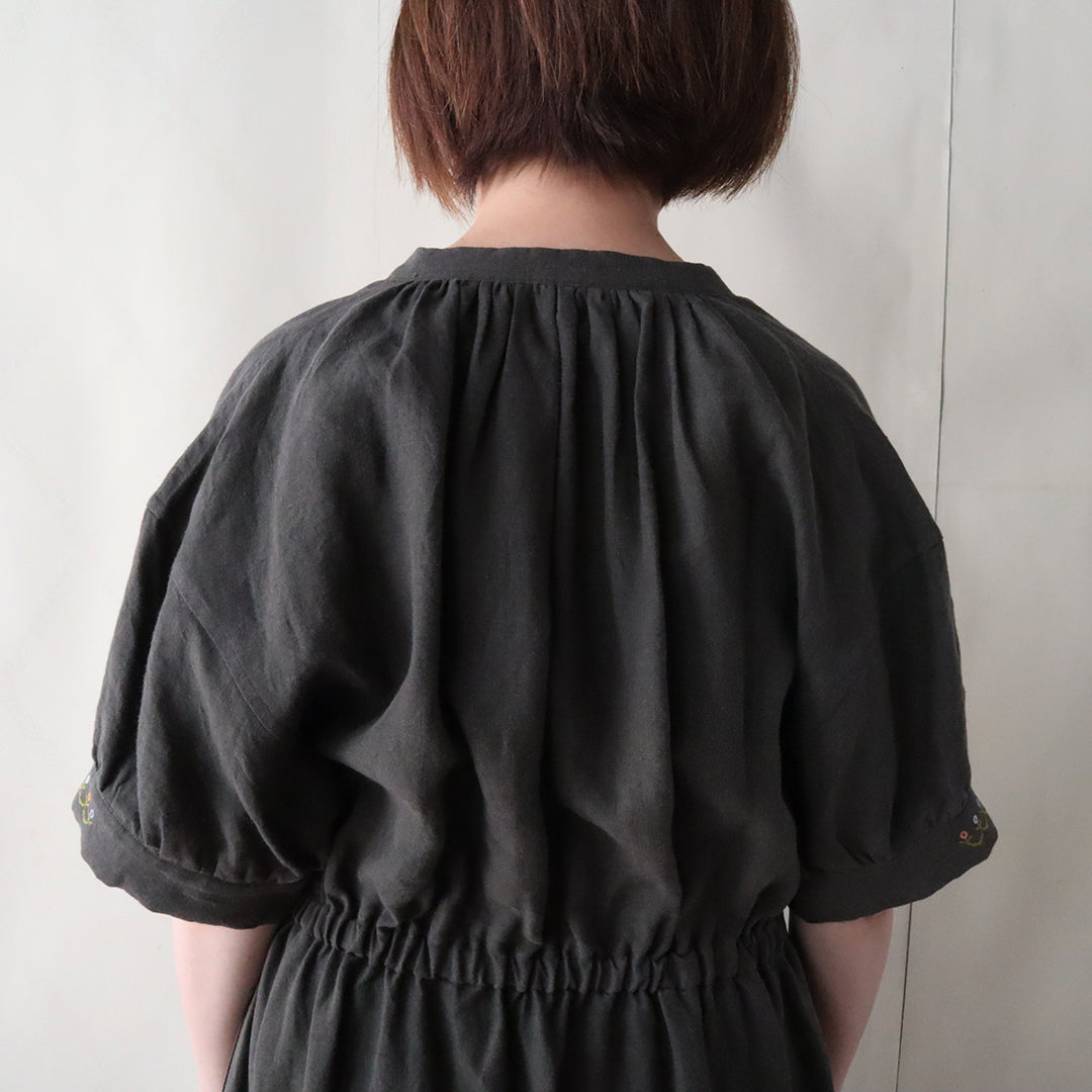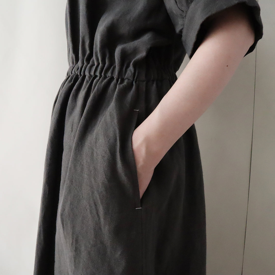 各パーツにギャザーを効かせることで身巾にゆとりを持たせ、ウエスト部分には緩めのゴムを入れ、フィットアンドフレアの美しいシルエットに仕上げています。