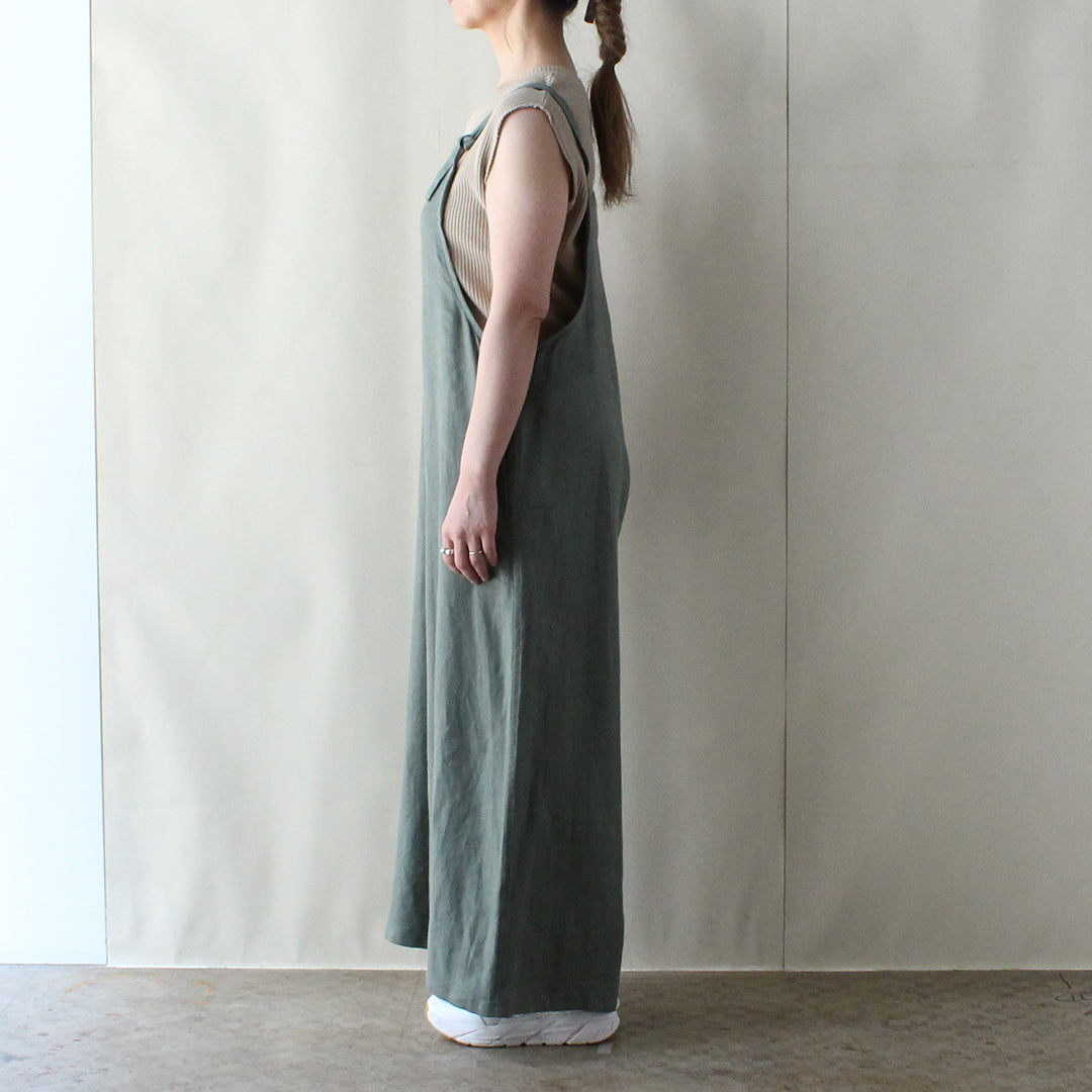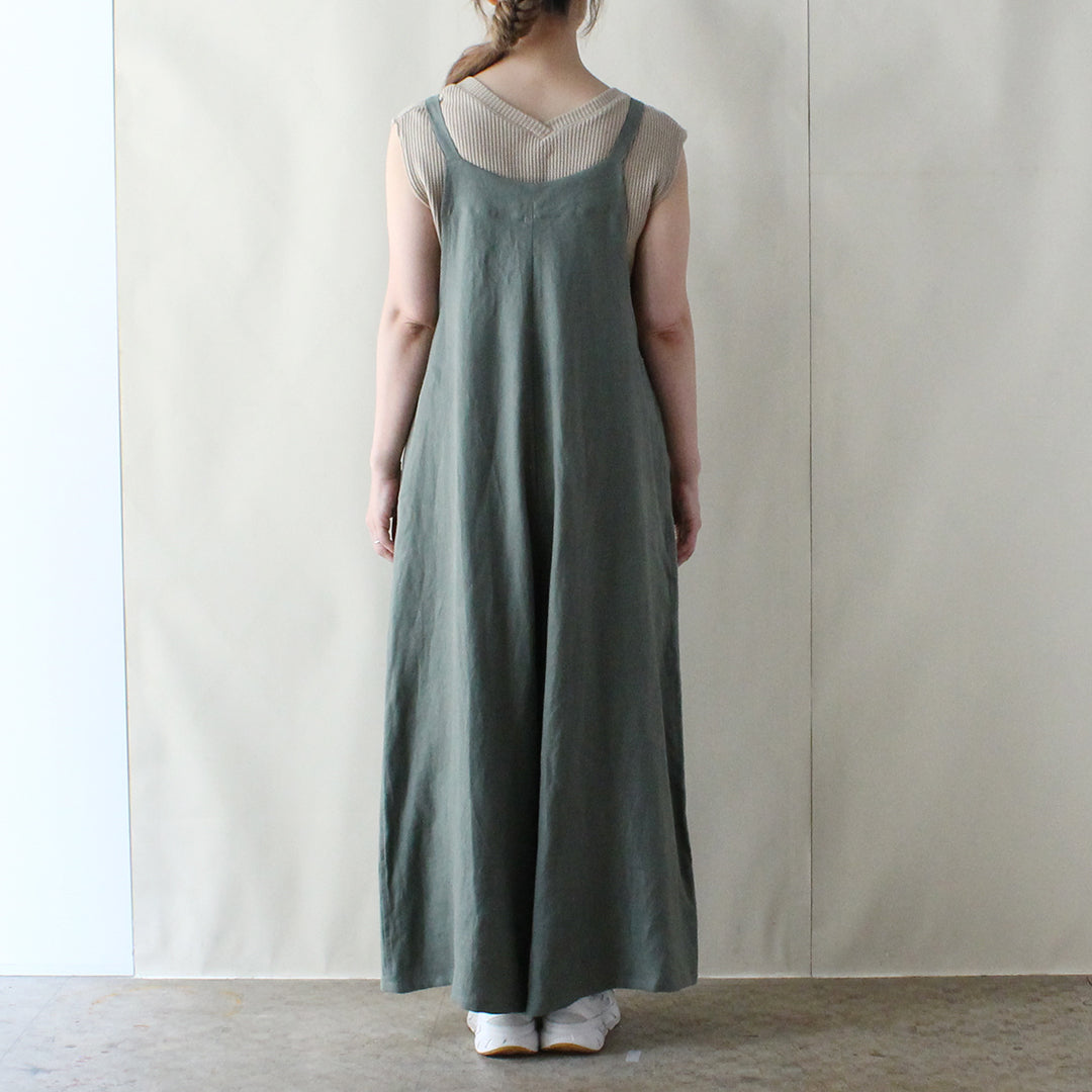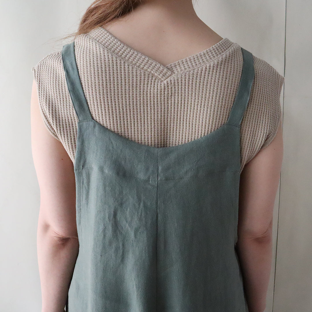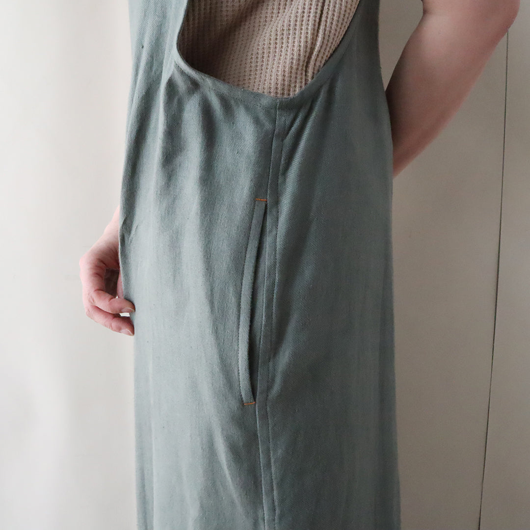 オリーブグリーンの綾織りリネンは、平織物に比べて糸同士の密度があるため、柔らかい手触りが特徴です。透け感も気にならない厚みの生地ですので、ボトムのインナーを着用せず1枚で着ることができます。