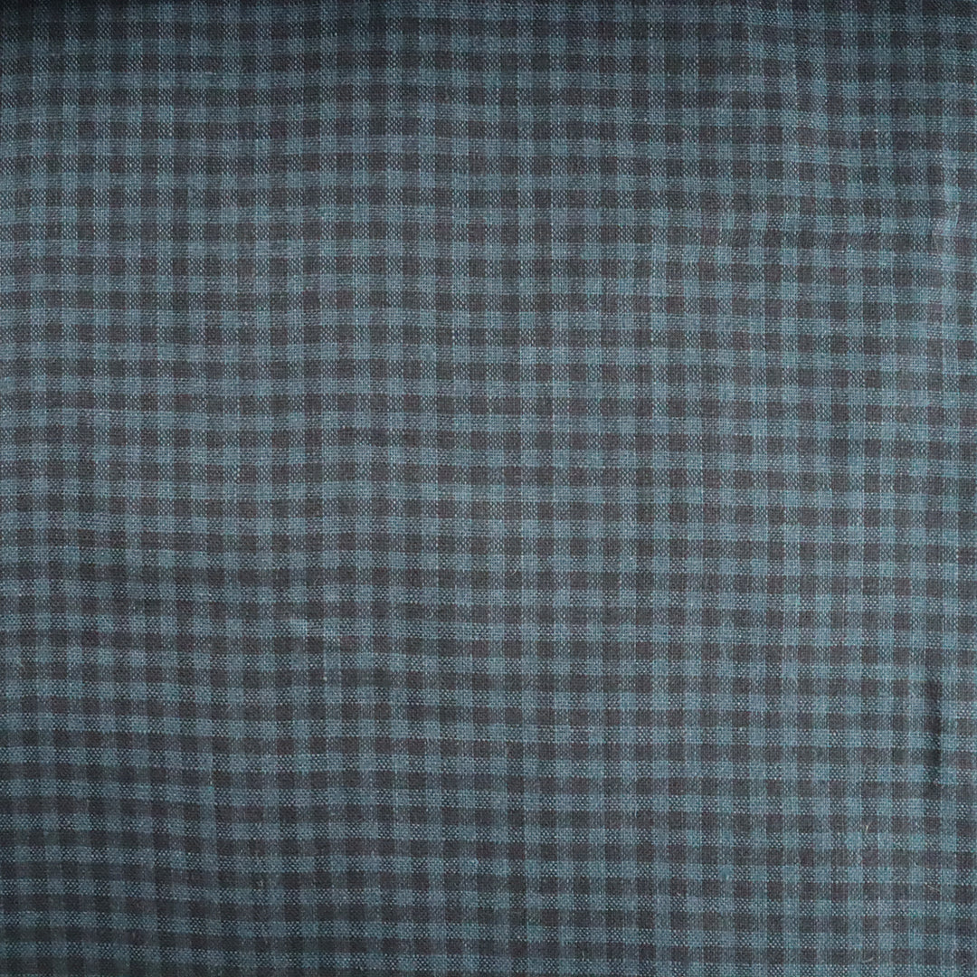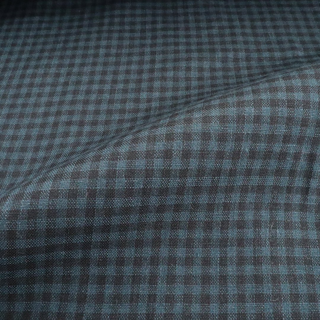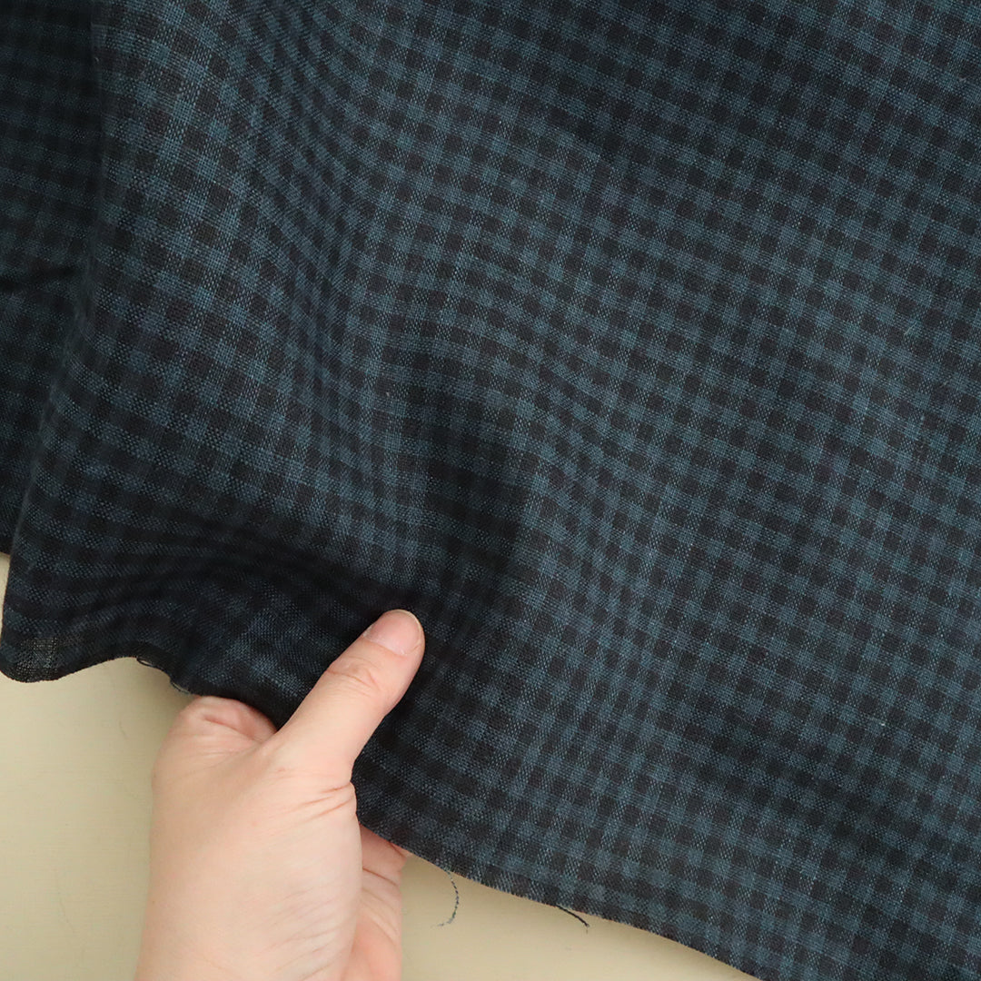 ブルーとネイビーのギンガムチェックのリネン生地。深みのある色合いでシックな雰囲気に仕上がります。