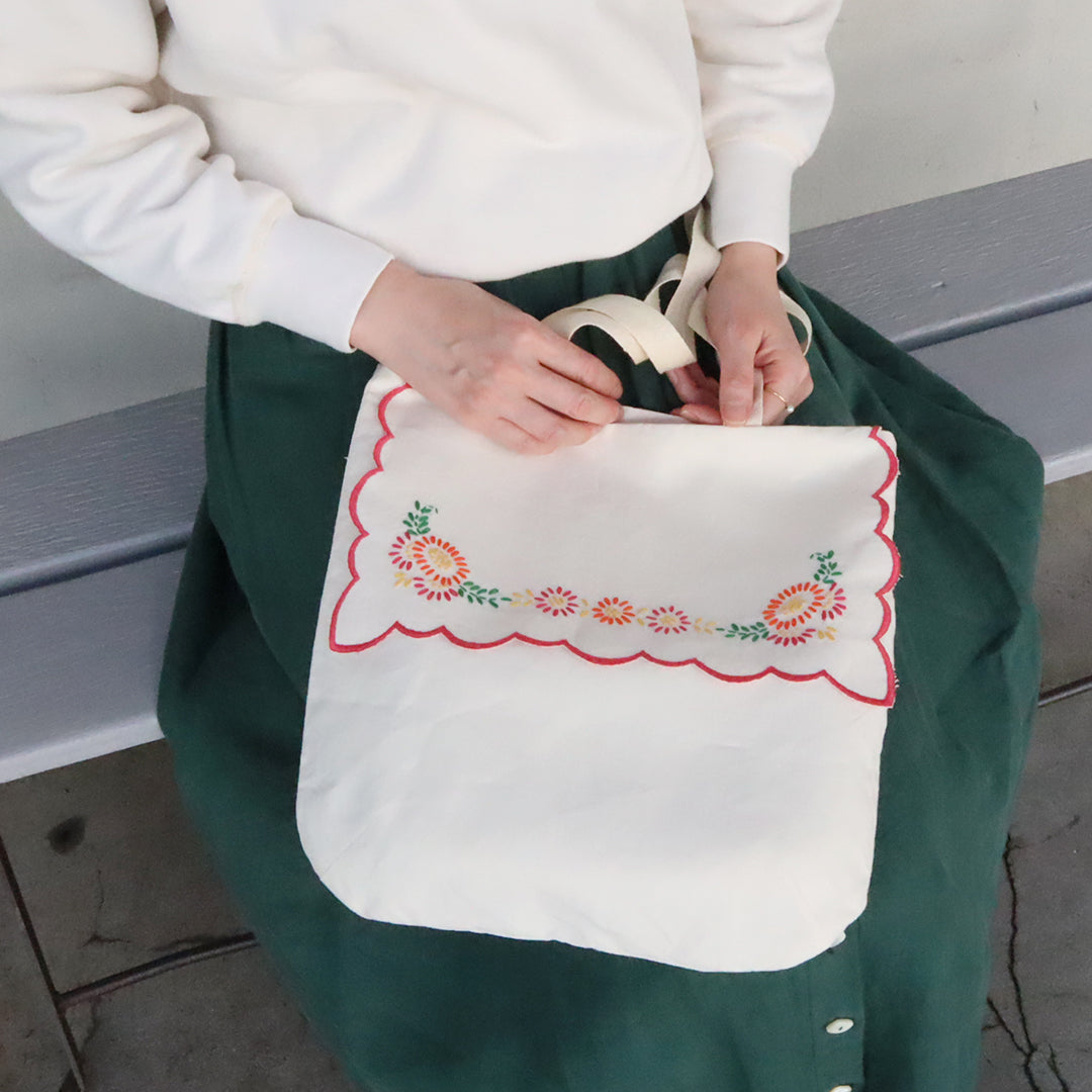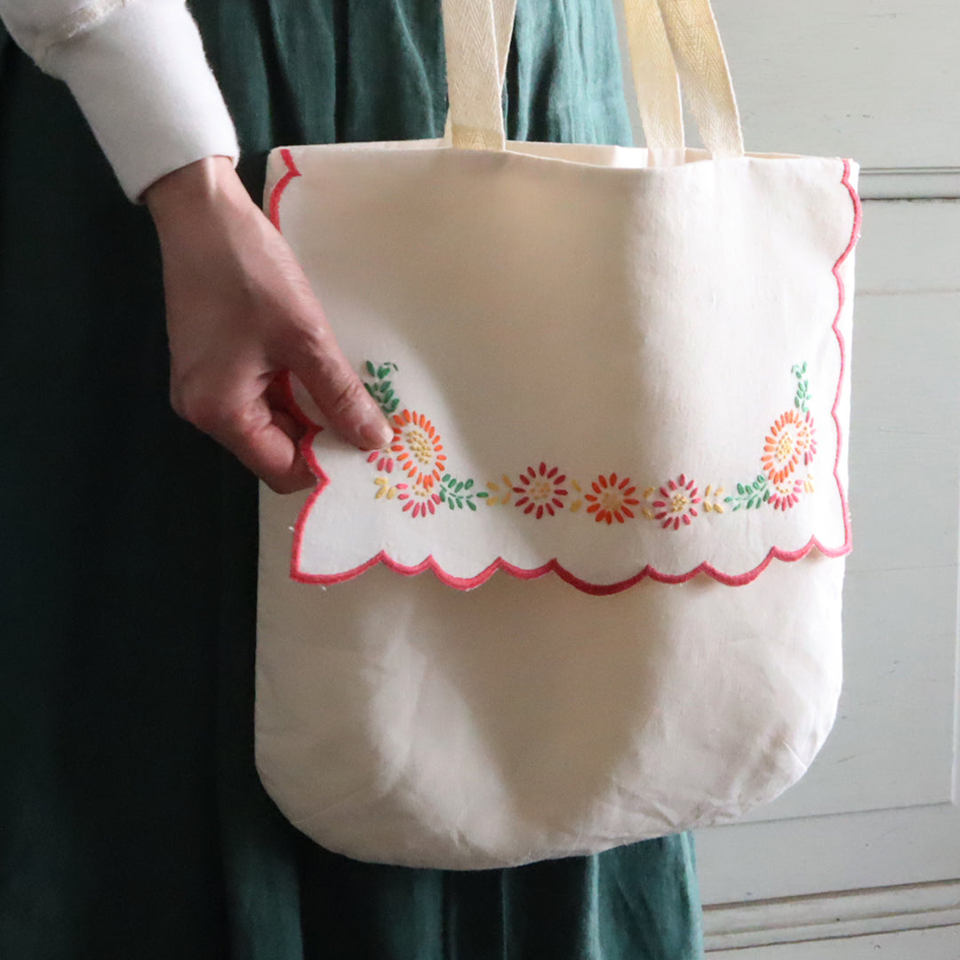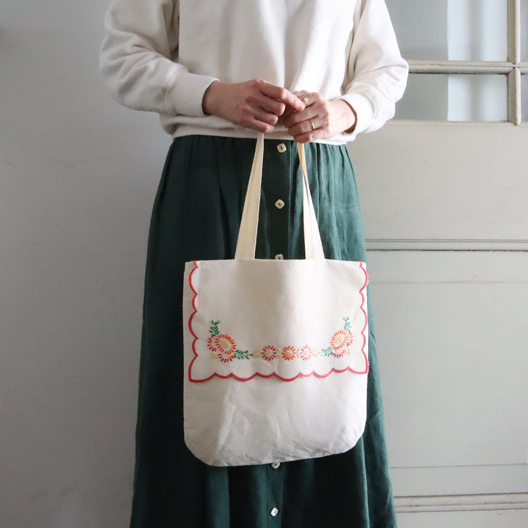 刺しゅうができたらスカラップ部分の布をカットして飾り布を仕上げ、バッグに仕立てます。バッグは底にダーツを入れて丸みをつけたかわいいデザイン。裏布も付くので使い勝手もよいバッグが仕上がります。