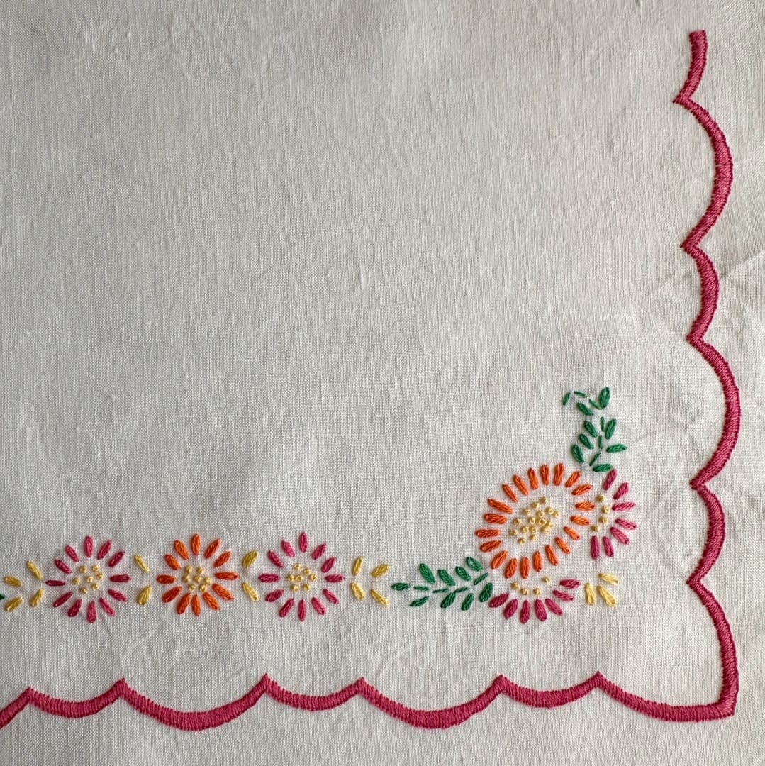 ボタンホールステッチのスカラップに、お花模様も簡単なステッチを組み合わせました。刺しゅう初心者さんにも刺しやすい図案です。