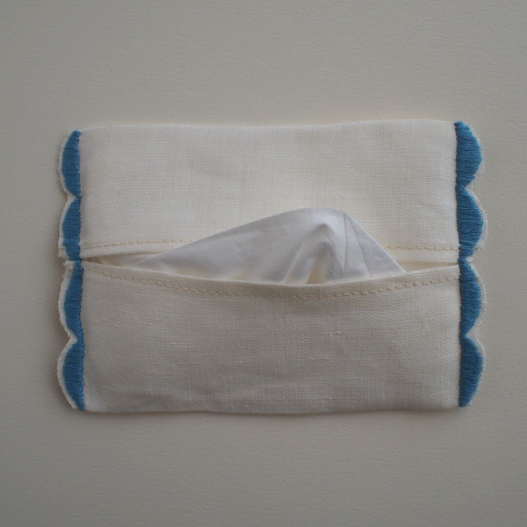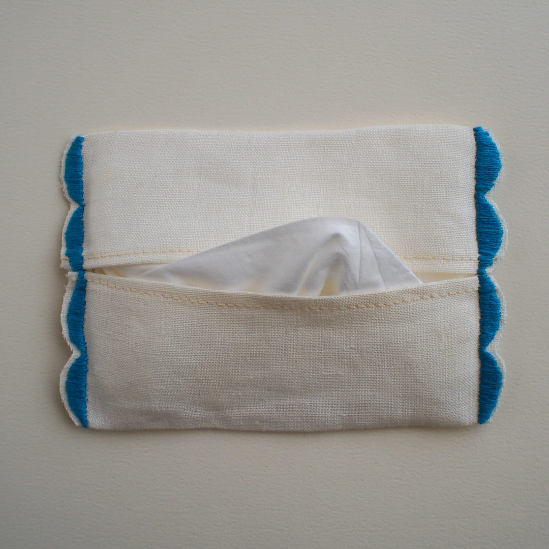 縁取りのスカラップを作りながら両脇を留めていき、ティッシュケースに仕立てます。両脇に使うブルーの糸はデルフィニウムの花で染められたSunny Thread。デルフィニウムの語源はラテン語の「Delphis」(イルカ)。花を咲かせるその姿がイルカに似ていることから名付けられたといわれています。