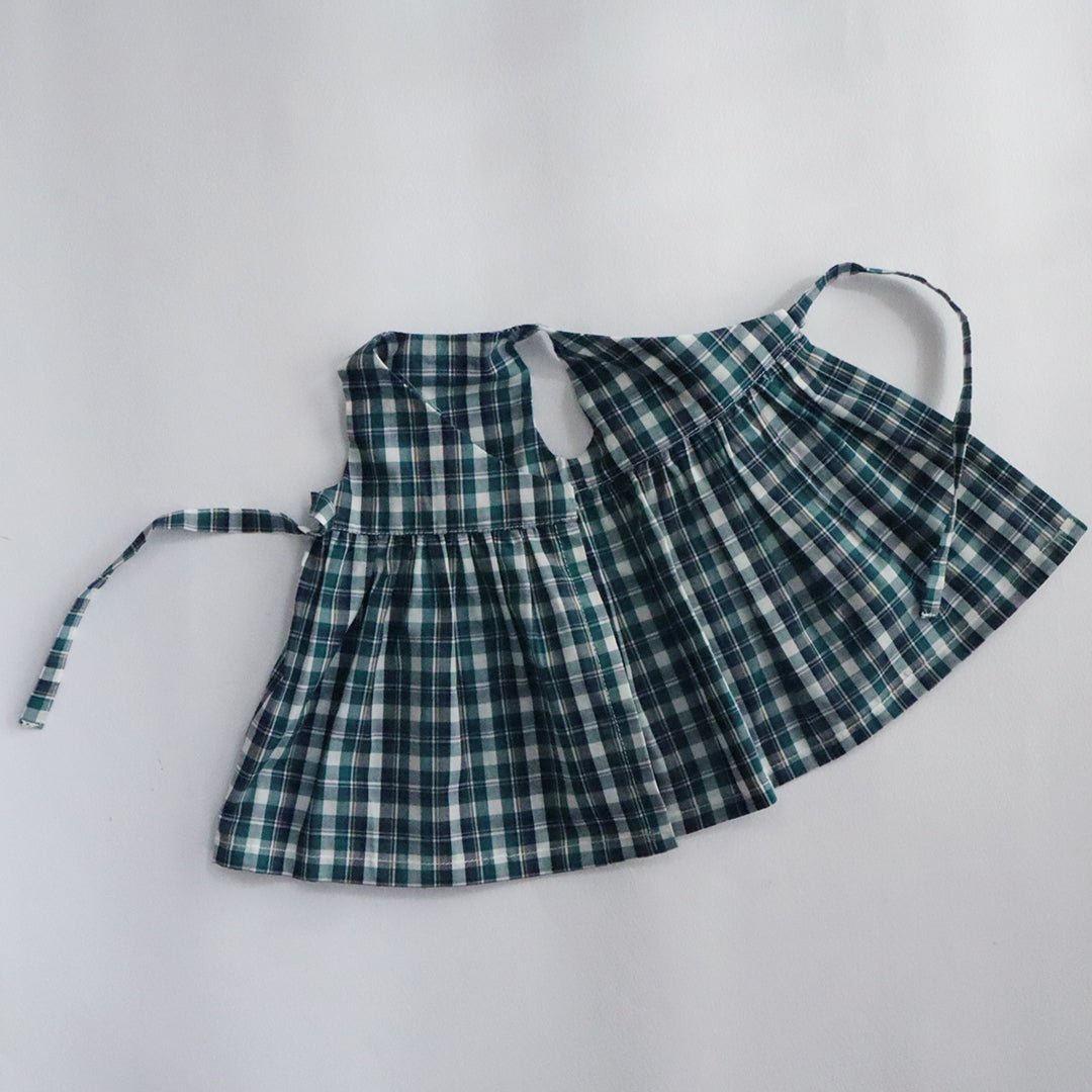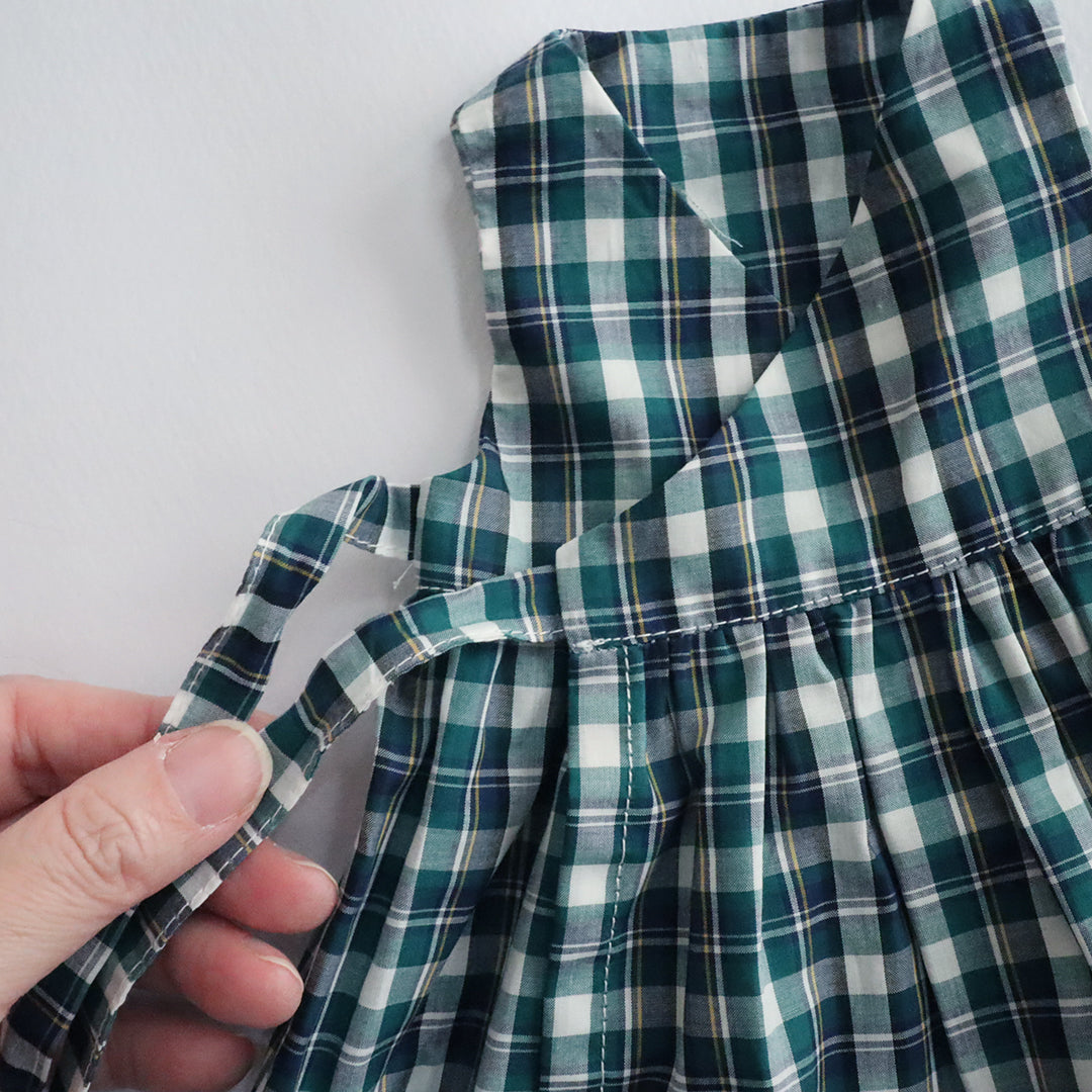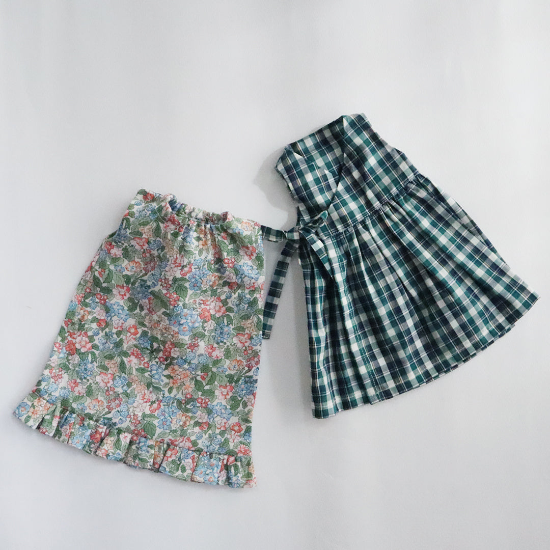 クゥクゥのお気に入りの花柄のワンピースと、タータンチェックのカシュクールワンピースをセットにしました。リバティ・ファブリックスのタナローンで仕立てたワンピースはとても涼し気です。