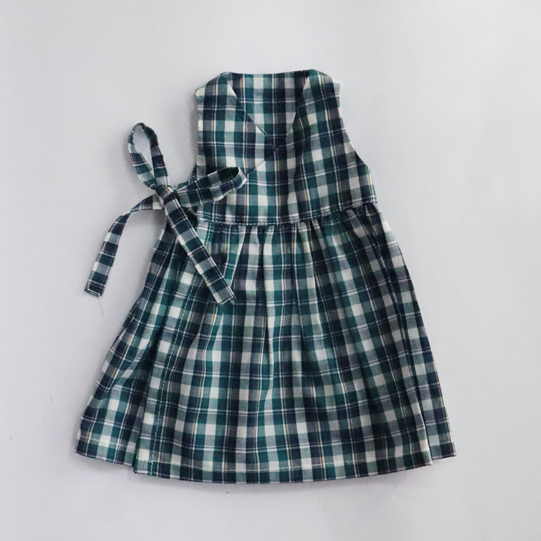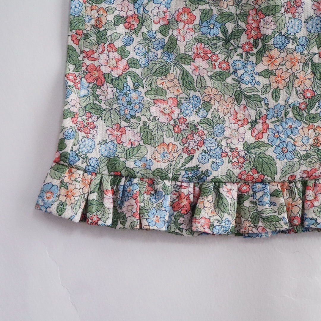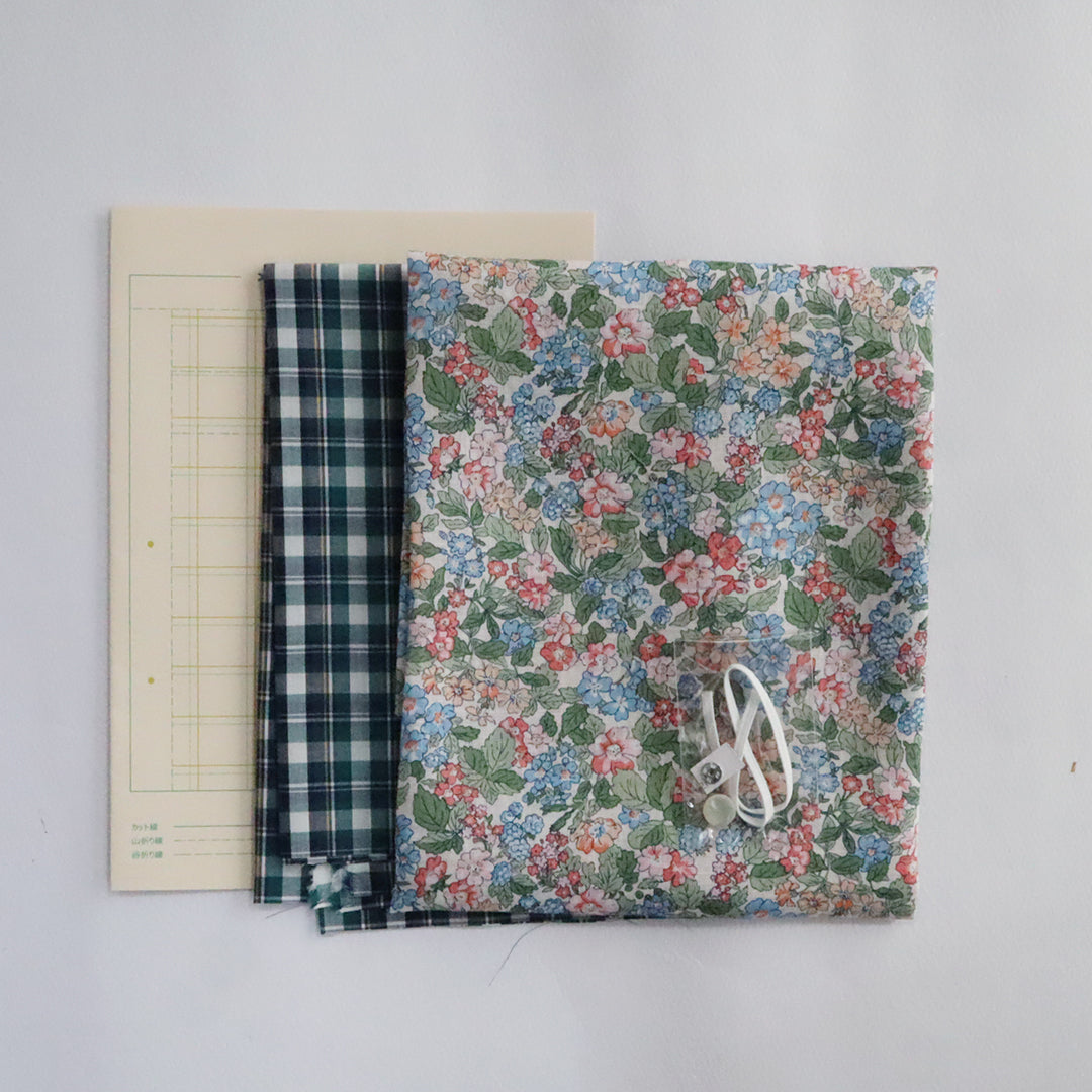 クゥクゥのお気に入りの花柄のワンピースと、タータンチェックのカシュクールワンピースをセットにしました。リバティ・ファブリックスのタナローンで仕立てたワンピースはとても涼し気です。