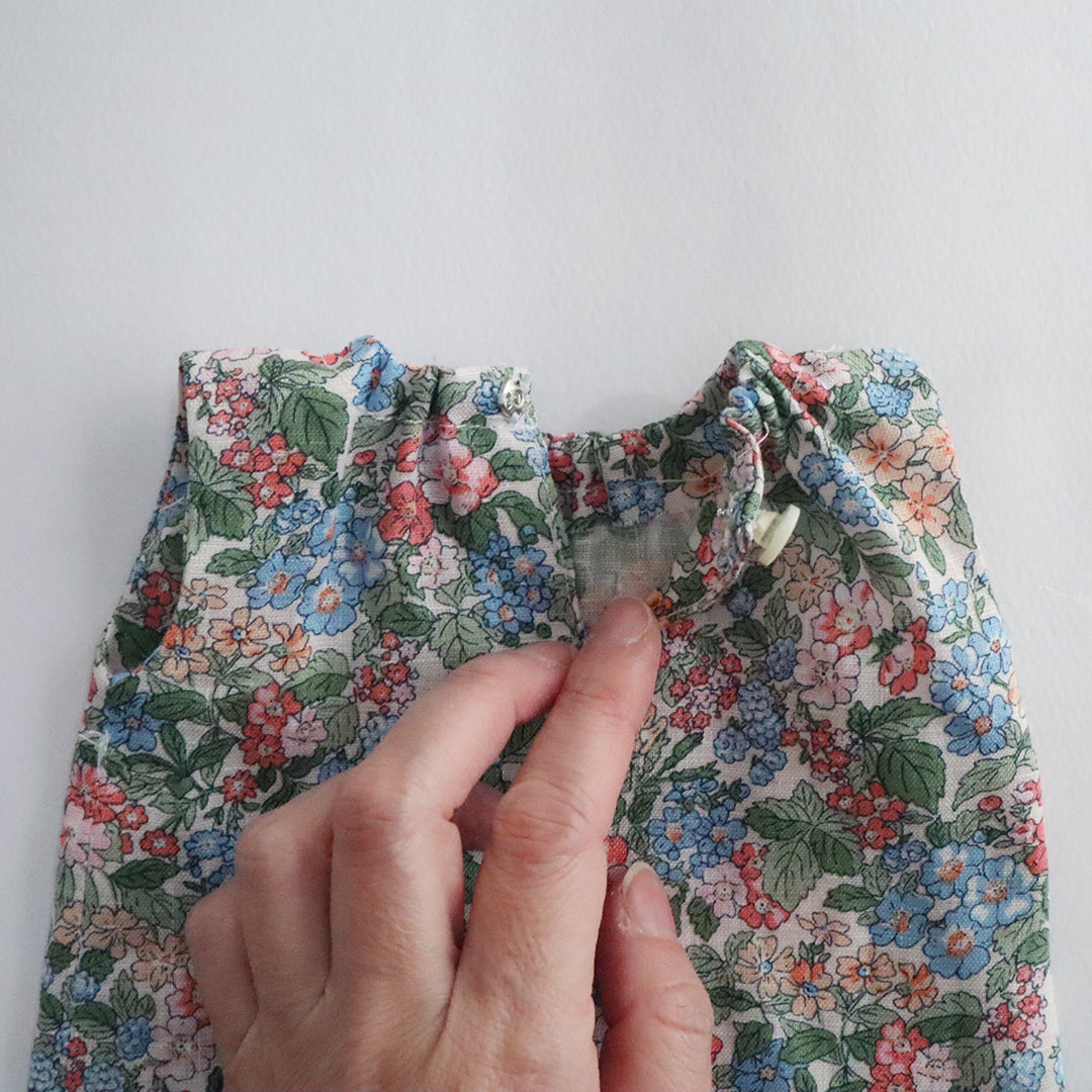 花柄のワンピース:リネン100% / ゴム / 貝ボタン / スナップボタン チェック柄のカシュクールワンピース:コットン100%